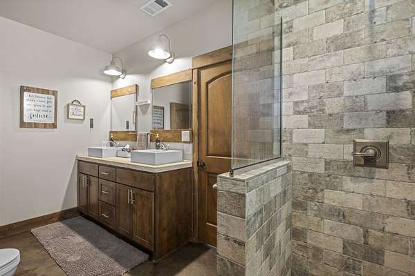From Hwy 281 and Hwy 29 in Burnet: South on Hwy 281 for 2.2 miles, right on Delaware Springs Blvd for 0.4 mile, continue on Oak Vista for 1.2 miles, right on N Oak Vista Drive for 0.3 mile, house on left.
