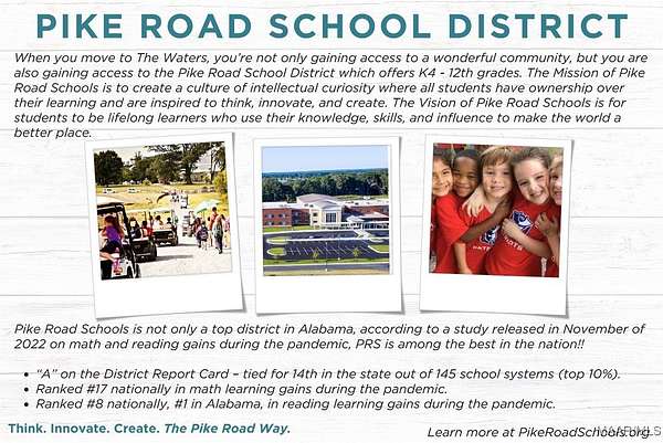 Come Make a Life of It at The Waters in Pike Road, AL! Enjoy resort-style living with world-class fishing, multiple lakes, swimming pools, tennis and pickleball courts, a lakeside beach, dog park, town square, fire pit, soccer field, Playborhood Hill, bocce ball, green space, pavilions, a sport court, gaga pit, kayaking, canoeing, playgrounds, parks, and the Trail to Education leading to the Pike Road Elementary school. Shop and dine at our Town Center businesses or take a short drive to Pike Road Shopping, Eastchase, and Chantilly. Just 2.5 miles off I-85, Exit 16, and zoned for Pike Road Schools (K4-12th grade). Make your dream vacation your everyday life! Seller reserves the right to approve buyer's mortgage lender.