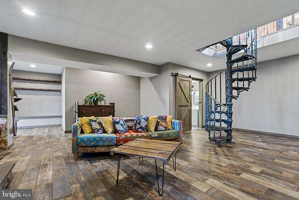 - Additional Stairway, Breakfast Area, Built-Ins, Curved Staircase, Dining Area, Exposed Beams, Family Room Off Kitchen, Island Kitchen, Recessed Lighting, Wood Floors, Wood Stove