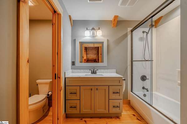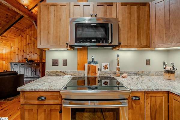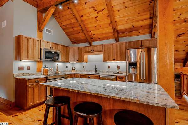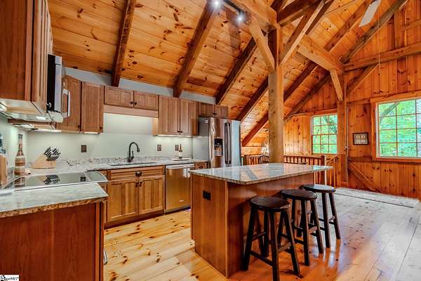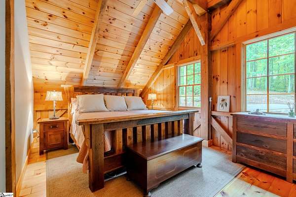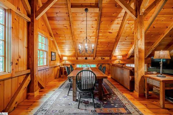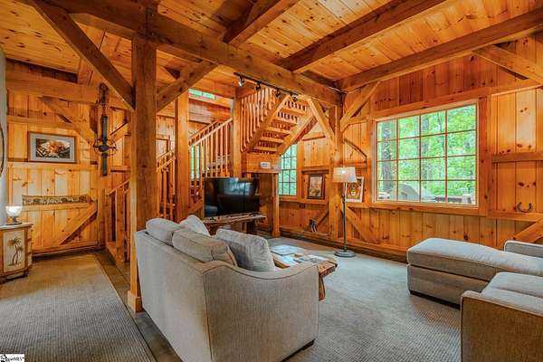 Membership Available. Discover mountain living at its finest with this timeless timber frame home on 5.83 acres in the prestigious Cliffs at Glassy, a community celebrated worldwide for its resort-style amenities and breathtaking views. Built in 2013, the home radiates warmth with knotty pine interiors, soaring ceilings, and exposed timber beams that frame each space with rustic elegance. The entry level offers flexibility with a cozy living room, full bath, and a flex room perfect as a guest bedroom, office, or studio. A two-car garage and a spacious laundry room with cabinetry and sink make daily living effortless. An impressive pine wraparound staircase leads you to the main living area, where the open kitchen, dining, and living spaces flow seamlessly under stunning beamwork. The primary suite is a true retreat, complete with tall ceilings, a generous walk-in closet, and a private full bath. Step outside onto the deck to sip your morning coffee, grill out with friends, or enjoy unforgettable sunsets as they dip behind the mountains. With 5.83 acres, you'll enjoy unmatched privacy and even the option to build your dream home with sweeping mountain views while enjoying the comfort of the existing residence. Life at The Cliffs at Glassy also means access to world-class amenities including a championship golf course, clubhouse, pool, fitness facilities, and tennis/pickleball courts -- all designed to elevate your mountain lifestyle. Adding to the appeal, home is turn-key ready as all Amish-made furniture conveying with the home. This is more than a home -- it's a lifestyle. Schedule your showing today and experience the beauty, serenity, and community of The Cliffs at Glassy.