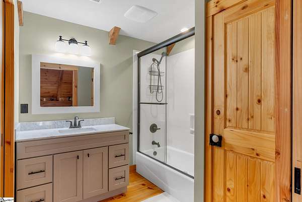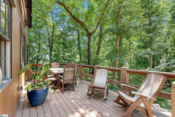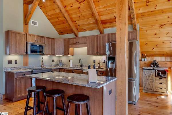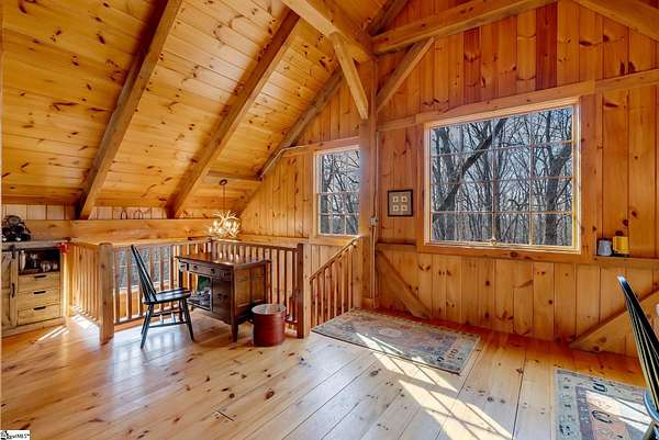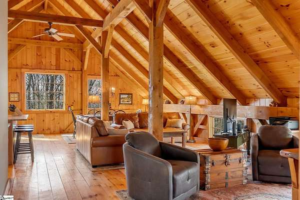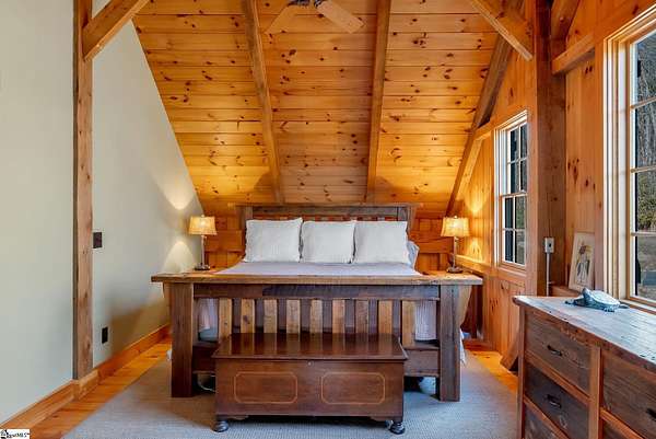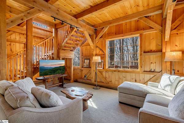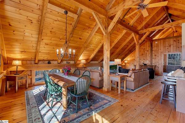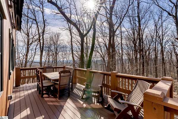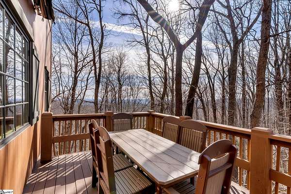 Tucked away on over 5 private acres in prestigious The Cliffs at Glassy, this timeless timber-frame home offers an intentional, well-planned footprint that lives comfortably while embracing its remarkable surroundings. Set at approximately 1,500 feet in elevation, the home captures southwest-facing mountain views toward Caesars Head and Table Rock--among the most captivating vistas in Glassy. Built in 2013 by Fairview Builders, one of The Cliffs' Preferred Builders, the residence reflects enduring quality and rustic refinement, with knotty pine finishes, exposed timber beams, and soaring ceilings that bring warmth and character to every space. Crafted with comfort and flexibility in mind, the main level features a welcoming living room, a full bath, and a bedroom well suited for use as a home office or flex space. A spacious laundry room with built-in cabinetry and a utility sink adds everyday functionality, while the two-car garage offers ample storage and convenient parking. Step outside to the deck, perfect for casual entertaining, morning coffee, or simply relaxing while enjoying the surrounding views and tranquil natural setting. Ascend the pine wraparound staircase to the main living level, where open-concept kitchen, dining, and living areas flow seamlessly. The kitchen is equipped with granite countertops, stainless steel appliances, and an open pantry, while warm knotty pine floors and character-rich ceilings create an inviting atmosphere throughout. The primary suite serves as a peaceful retreat, featuring tall ceilings, a walk-in closet, an additional storage alcove, and an adjacent full bath with a granite-topped vanity and a shower/tub combination. The gently sloping acreage may offer potential for the addition of an estate home; however, the addition of any additional residence is not guaranteed and would be subject to review, approval, and compliance with all requirements of the Cliffs at Glassy Architectural Review Board and applicable community guidelines. The existing residence may be permitted for continued use as a carriage house. A nearby fenced yard with natural boulder outcroppings adds charm and functionality, especially for dog lovers. This home also offers a unique rental opportunity within The Cliffs community. Short-term rentals are reserved exclusively for Cliffs members and their guests, and are thoughtfully managed by The Cliffs Rental Program, preserving the privacy and quality of the experience. Long-term rental options may be available in accordance with governing guidelines and are subject to approval by the community property management association. Conveniently located near the gatehouse with easy access to Highway 11, Greenville, and Travelers Rest, this property offers a rare blend of privacy, efficiency, and inspiring scenery. A Club membership at The Cliffs is available for purchase with this property giving you access to all seven communities.