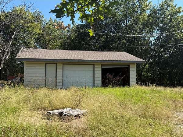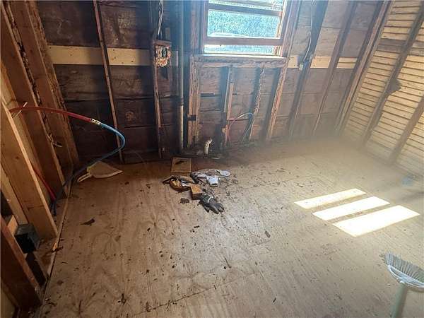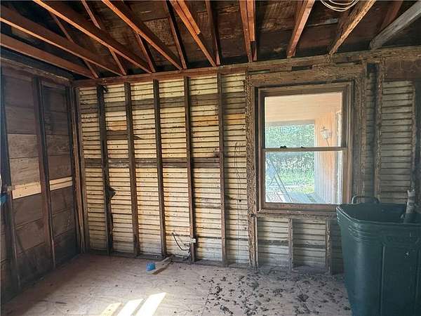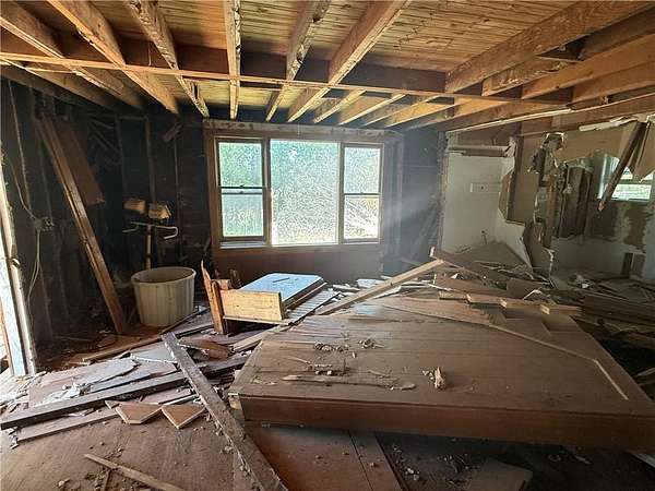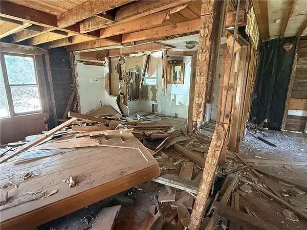 Est $523/moLooking for a secluded project house? This one is situated on 6.63 acres on a paved road. Detached over-sized two car garage. There had been a fire and so it is completely gutted. Some newer electrical and plumbing.