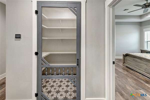 - All Bedrooms Down, Built In Features, Ceiling Fans, Custom Cabinets, Double Vanity, Eat In Kitchen, High Ceilings, Kitchen Dining Combo, Kitchen Family Room Combo, Kitchen Island, Main Level Primary, Pantry, Primary Downstairs, Pull Down Attic Stairs, Solid Surface Counters, Tub Shower, Walk In Pantry