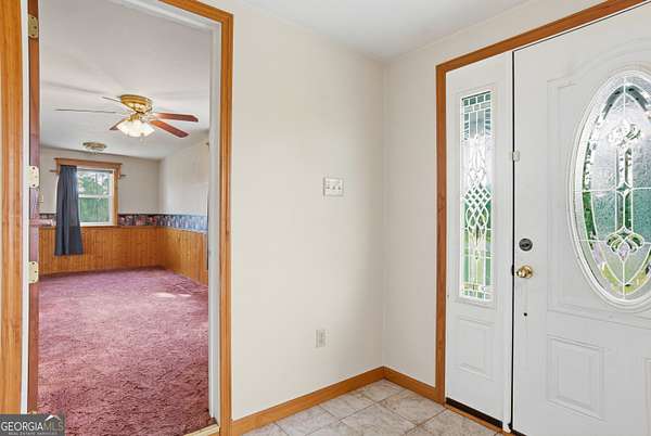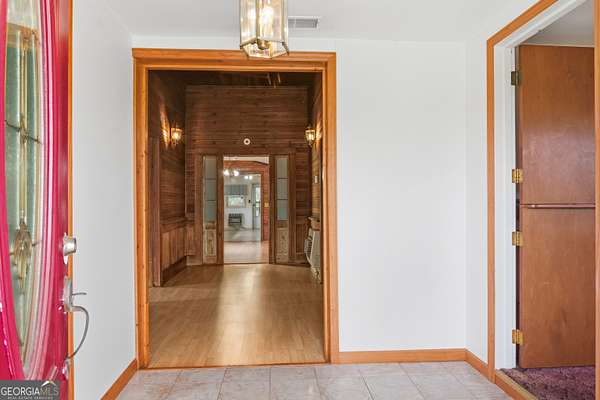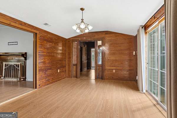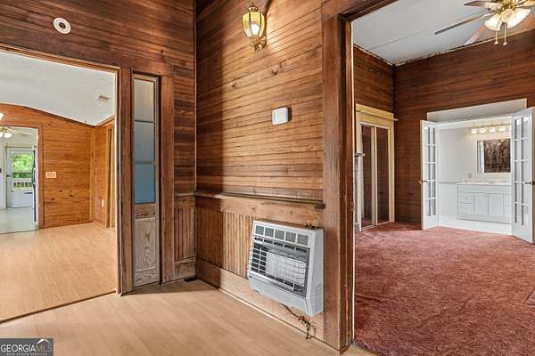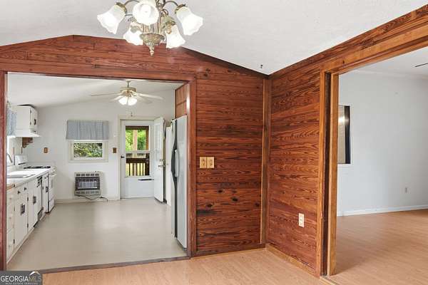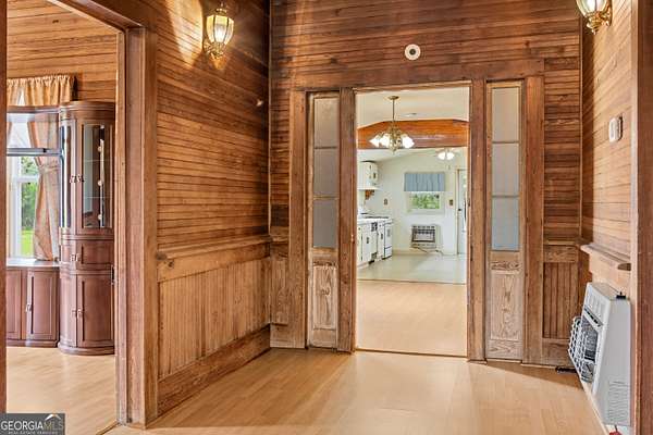 Quiet country living on over 2 acres of land. This restored 1940 home offers 3 bedrooms, 2 full baths, and a bonus room (no egress) previously used as additional sleeping space. Original wooden walls in the foyer, dining room, bedroom, and bonus room add timeless character, while soaring 14-foot ceilings in the foyer and one bedroom create an open, airy feel. The bonus room includes two cedar-lined closets. A spacious bathroom features a skylight for natural light. The living room includes a fireplace with gas logs. The spacious kitchen is ready for your personal touch. Backup heat provided by propane wall heaters. Major updates include a new metal roof and new HVAC system. Enjoy the covered front porch and covered screened back porch year-round. Additional features include a detached metal carport and prefab metal storage building.