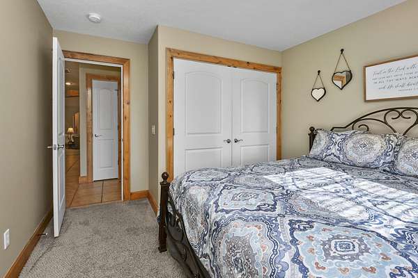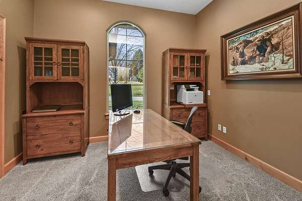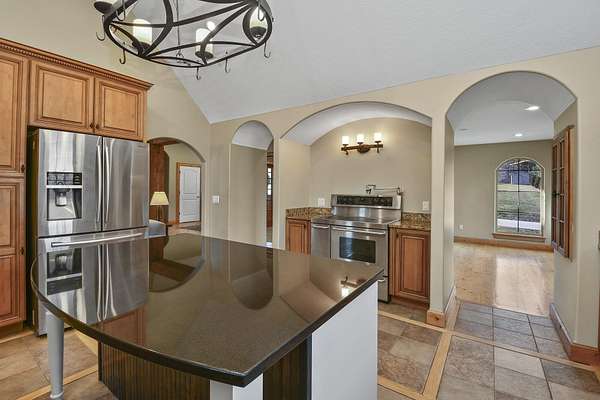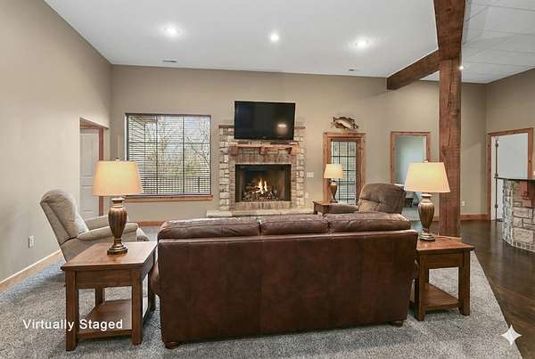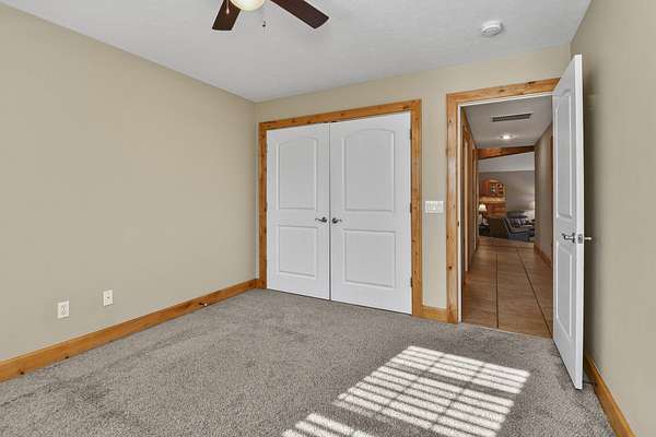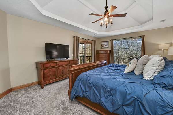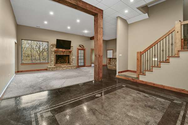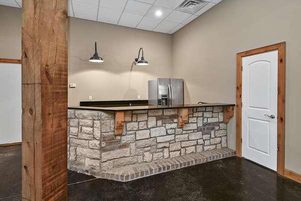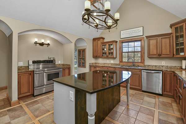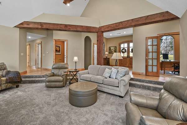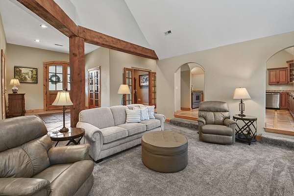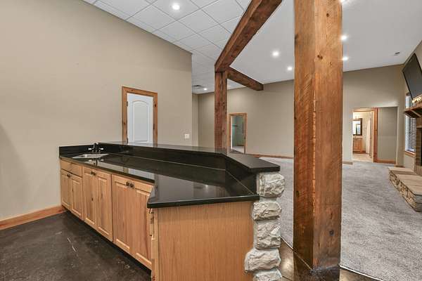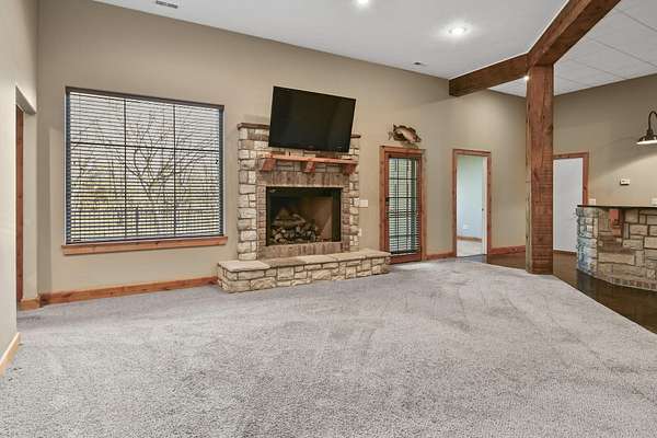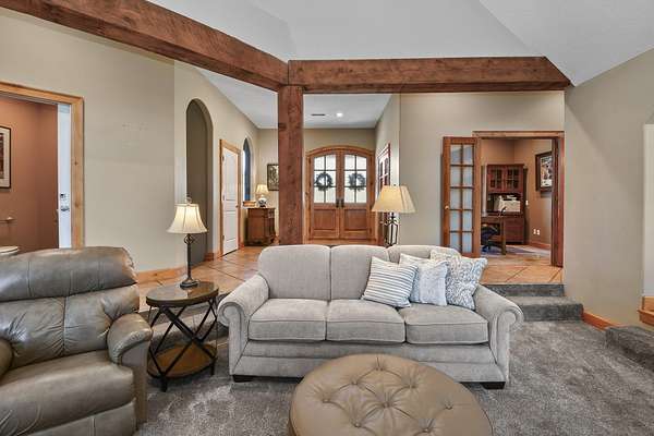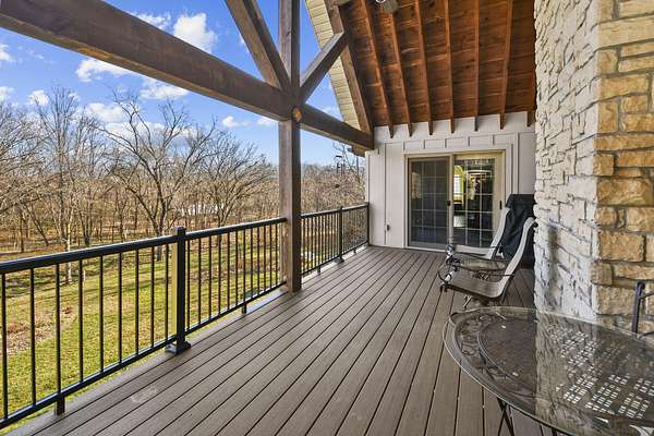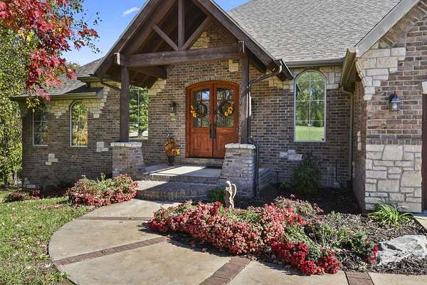 Your city stress will melt away as you walk through the impressive wooden, double arched French doors of this executive home with a tranquil 2 +ac country setting. Close to parks, shopping, restaurants, theater and more, you will have the best of both worlds! Only 3 miles to I65 and just minutes away from the charming hallmark style downtown Historic Ozark River District, Finley River Park, Ozark Community Center, and popular Ozark, Finley Farms, Riverfront dining experience! Unique, Custom craftsmanship is found throughout this charming cottage 5 bedroom, 3 1/2 bath, 3+ car garage ranch with full walkout basement. Upstairs, you will love the oversized kitchen with vaulted ceilings, accented with cedar beams, large island with granite countertops. The huge dining room boasts a picture window overlooking the woods below. Bonus front room with four large arched windows could be used as additional dining space or a private den. Expansive Primary suite has a lighted trayed ceiling, beautiful picture window, & private access to your upper deck. You'll find spa-like features with a jetted tub, double headed shower and generous closet space in the master bathroom. Plus 2 additional bedrooms on the main level.Downstairs you'll also find a rustic bar area with kitchenette, granite topped cabinets with a full-size refrigerator. Recreation area perfect for your pool table, a bonus/office, exercise and fitness room, and oversized 700 ft. John Deere/hobby workshop room with overhead door. Vaulted cathedral ceilings in the living area boast oversized 12' cedar beams, and copper hooded stone fireplace with gas logs. You will never know you are in a basement with the 14-foot ceilings, and all the natural lighting. Two additional bedrooms with vaulted ceilings and a full bathroom complete the lower-level basement area.