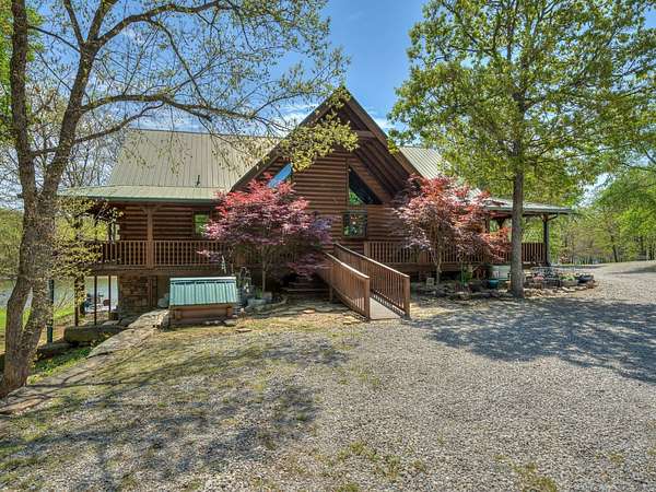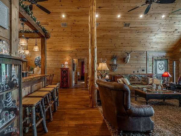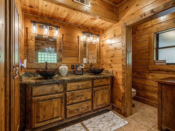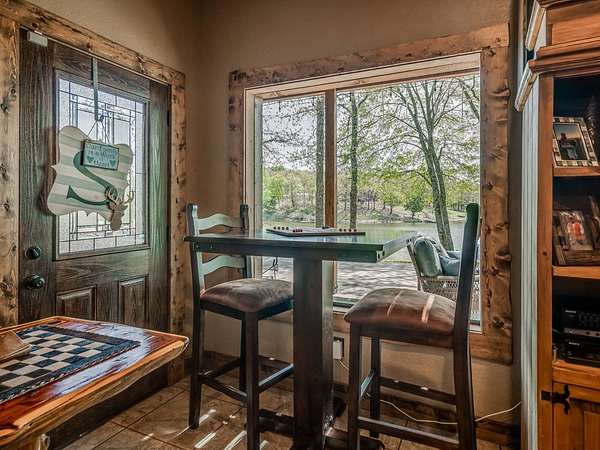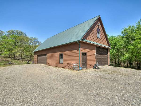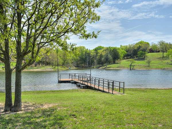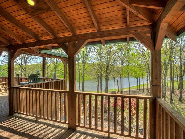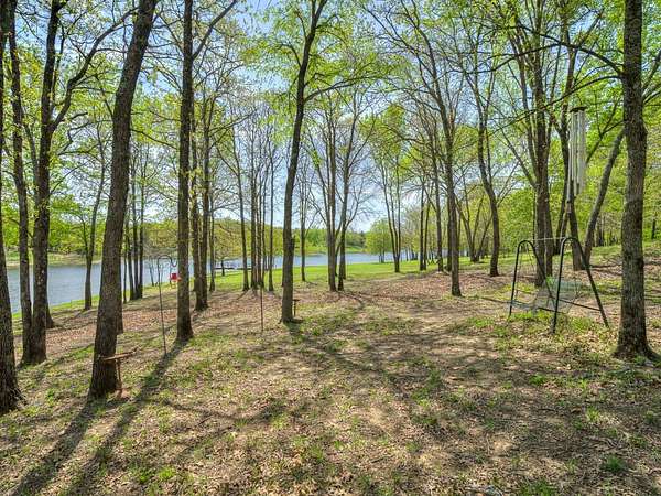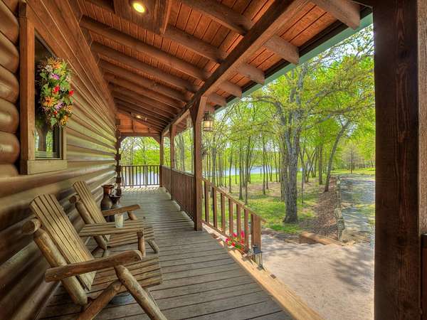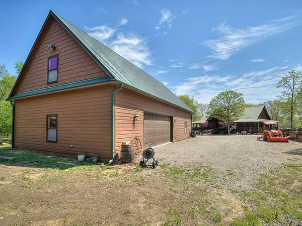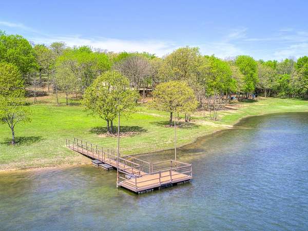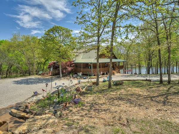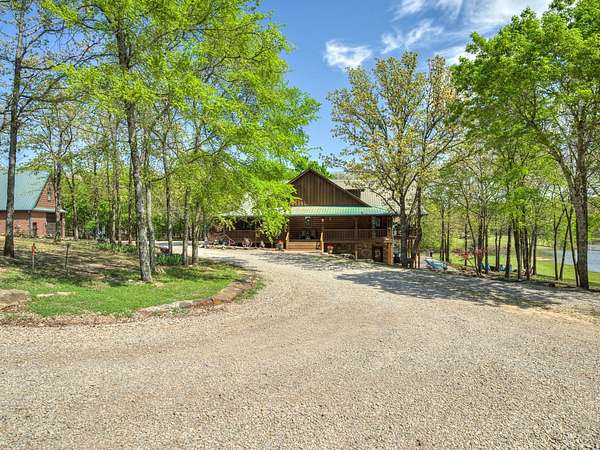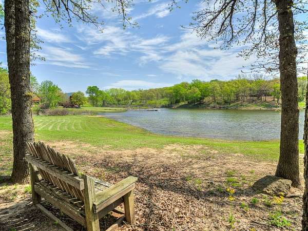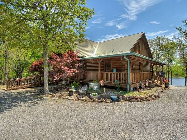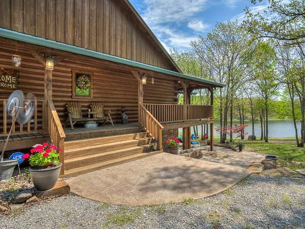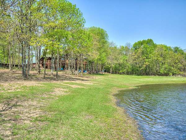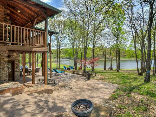 This Satterwhite luxury log home delivers it all...elevated craftmanship, peaceful water pond views, privacy and effortless entertaining create the feeling of a true luxury retreat, where slow mornings and lake life await, just minutes from ARBUCKLE LAKE! This stunning luxury log home, 3890 sf (mol) is nestled on 8+ acres (mol) with water frontage and a private dock, 30X 60 garage/shop located about 3 miles to Arbuckle Lake Point Road boat ramp. Select furnishings may be included with an acceptable offer. Designed to capture breathtaking views inside and out, expansive windows throughout the main level and walk-out basement bring nature's beauty indoors for year-round enjoyment. The main floor features 2 bedrooms, 2 bathrooms, a full kitchen with coffee bar, dining area, and inviting living space. The walk-out basement offers 2 additional bedrooms, 2 bathrooms, a kitchenette with eating area, game room, and secondary living space-ideal for guests or entertaining. Rustic luxury flows throughout, from the chandelier above the primary jacuzzi tub to soaring vaulted ceilings and with careful attention for to design details. Highlights include custom knotty alder cabinetry with roll-out drawers, under-cabinet lighting, glass-front uppers, and chisel-edge granite on counters, island, and vanities. Hardwood floors grace the main level, with ceramic tile in the laundry room, bathrooms, and entire basement. A double-flue fireplace offers propane logs indoors and a wood-burning option on the back patio. A whole-home generator powers both the home and shop. The impressive 30x60 garage includes spray-foam insulation, finished sheetrock, an approximately 1,800 sq ft walk-thru upper level, insulated garage doors (pontoon ready), a 10x20 shop, and dedicated boat storage with 12' ceilings. A rare opportunity to own a thoughtfully designed luxury log home with water views-truly one of a kind.
