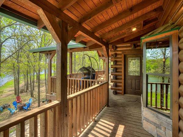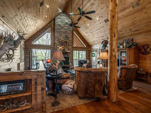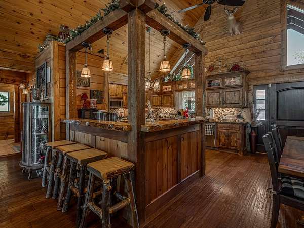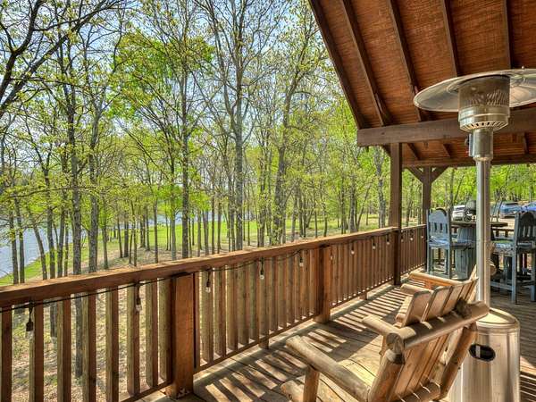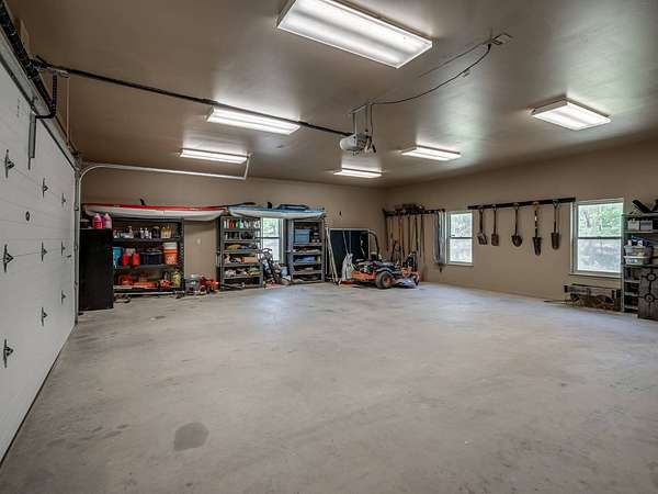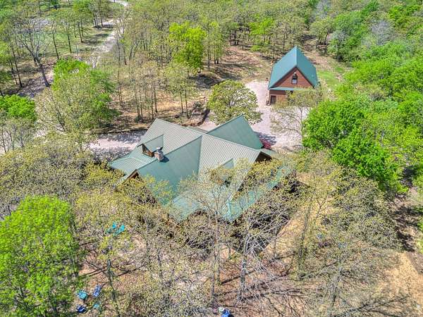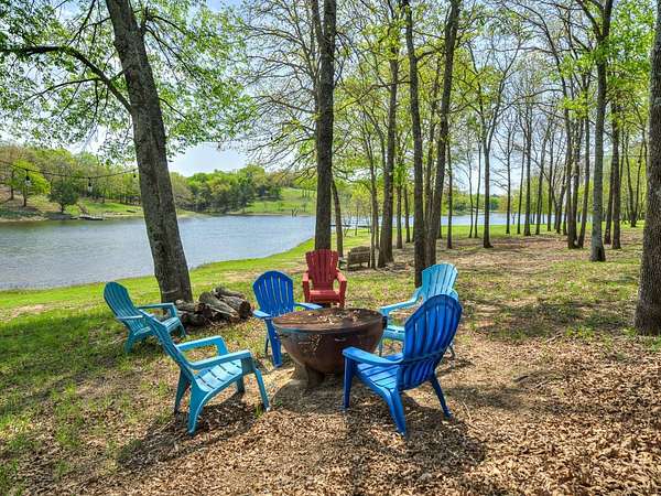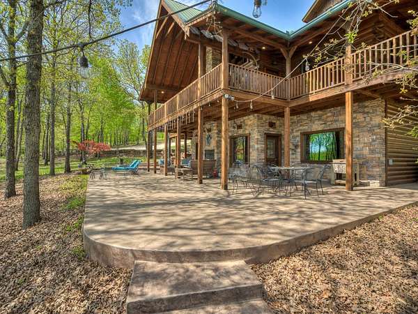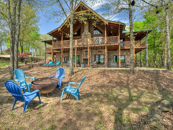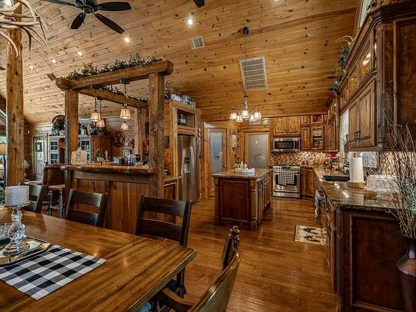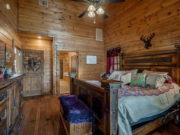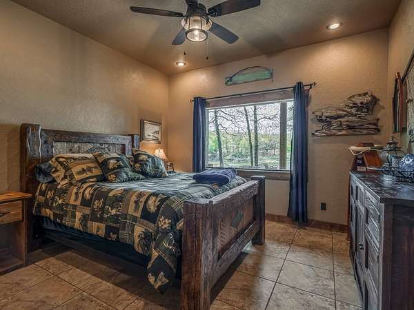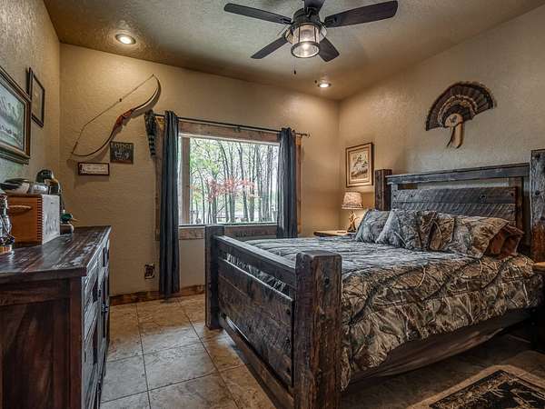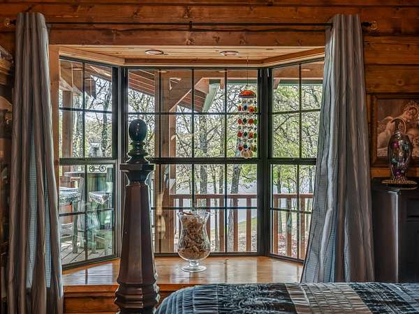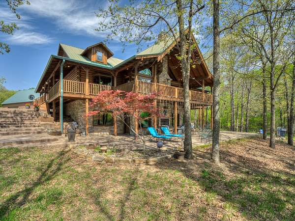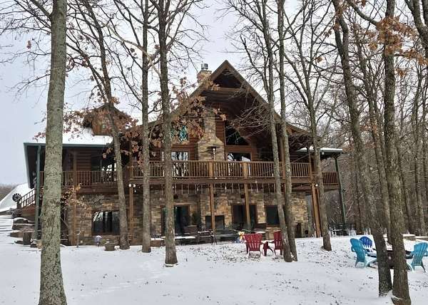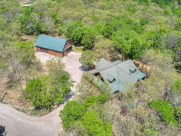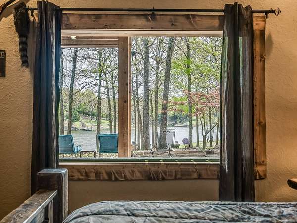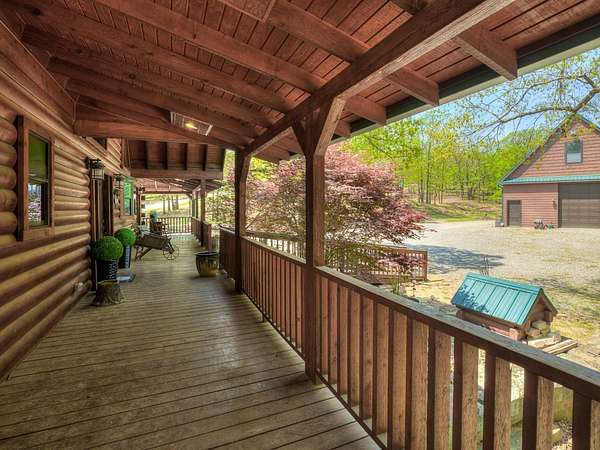 This Satterwhite luxury log home delivers it all...elevated craftmanship, peaceful water pond views, privacy and effortless entertaining create the feeling of a true luxury retreat, where slow mornings and lake life await, just minutes from ARBUCKLE LAKE! This stunning luxury log home, 3890 sf (mol) is nestled on 8+ acres (mol) with water frontage and a private dock, 30X 60 garage/shop located about 3 miles to Arbuckle Lake Point Road boat ramp. Select furnishings may be included with an acceptable offer. Designed to capture breathtaking views inside and out, expansive windows throughout the main level and walk-out basement bring nature's beauty indoors for year-round enjoyment. The main floor features 2 bedrooms, 2 bathrooms, a full kitchen with coffee bar, dining area, and inviting living space. The walk-out basement offers 2 additional bedrooms, 2 bathrooms, a kitchenette with eating area, game room, and secondary living space-ideal for guests or entertaining. Rustic luxury flows throughout, from the chandelier above the primary jacuzzi tub to soaring vaulted ceilings and with careful attention for to design details. Highlights include custom knotty alder cabinetry with roll-out drawers, under-cabinet lighting, glass-front uppers, and chisel-edge granite on counters, island, and vanities. Hardwood floors grace the main level, with ceramic tile in the laundry room, bathrooms, and entire basement. A double-flue fireplace offers propane logs indoors and a wood-burning option on the back patio. A whole-home generator powers both the home and shop. The impressive 30x60 garage includes spray-foam insulation, finished sheetrock, an approximately 1,800 sq ft walk-thru upper level, insulated garage doors (pontoon ready), a 10x20 shop, and dedicated boat storage with 12' ceilings. A rare opportunity to own a thoughtfully designed luxury log home with water views-truly one of a kind.