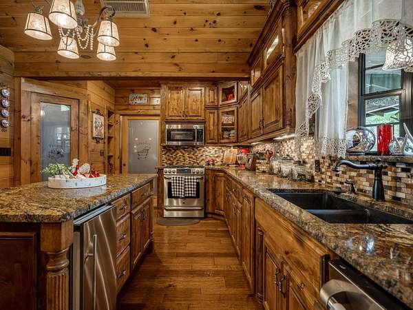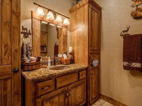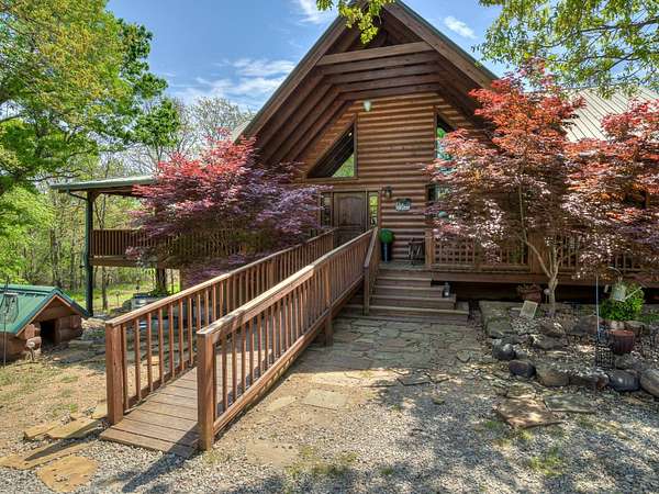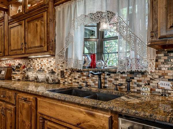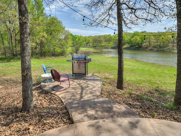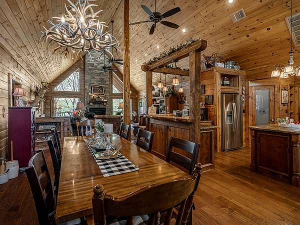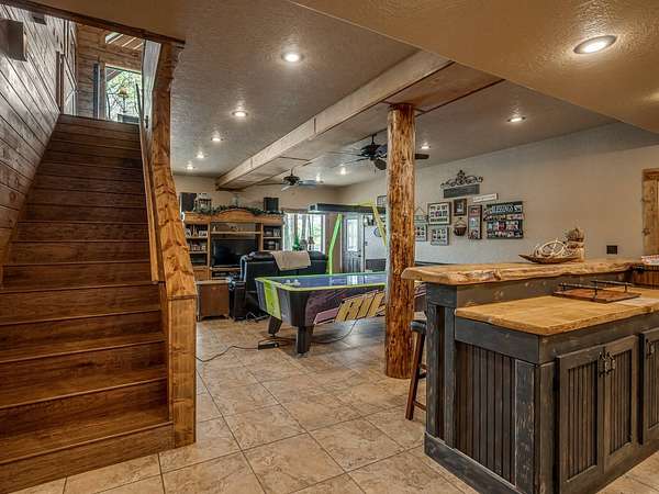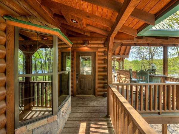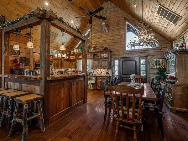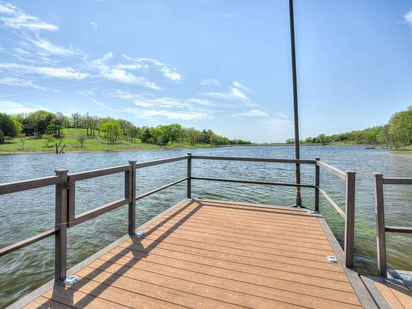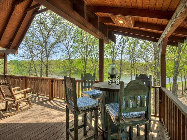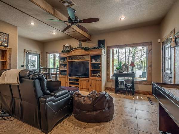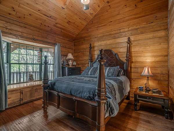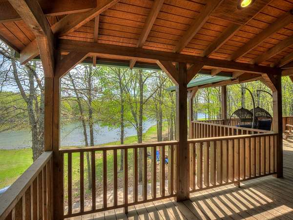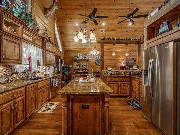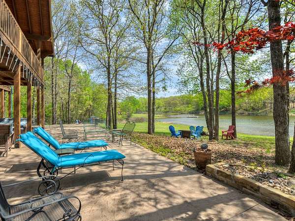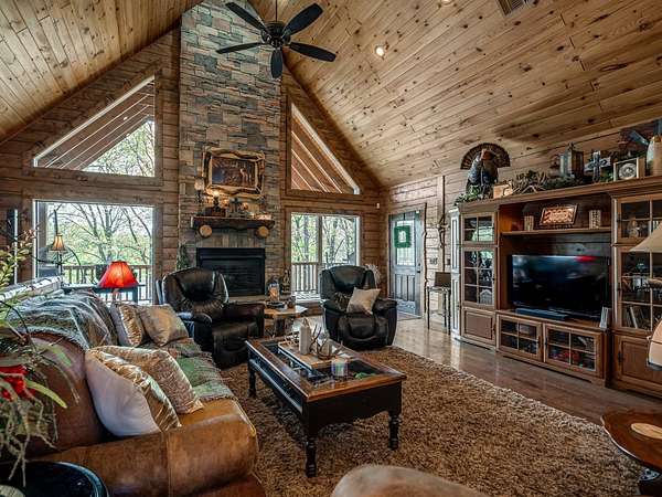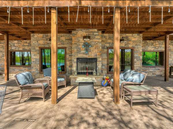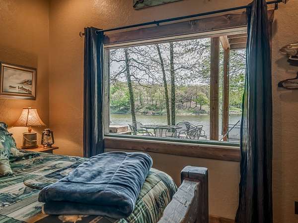This Satterwhite luxury log home delivers it all...elevated craftmanship, peaceful water pond views, privacy and effortless entertaining create the feeling of a true luxury retreat, where slow mornings and lake life await, just minutes from ARBUCKLE LAKE! This stunning luxury log home, 3890 sf (mol) is nestled on 8+ acres (mol) with water frontage and a private dock, 30X 60 garage/shop located about 3 miles to Arbuckle Lake Point Road boat ramp. Select furnishings may be included with an acceptable offer. Designed to capture breathtaking views inside and out, expansive windows throughout the main level and walk-out basement bring nature's beauty indoors for year-round enjoyment. The main floor features 2 bedrooms, 2 bathrooms, a full kitchen with coffee bar, dining area, and inviting living space. The walk-out basement offers 2 additional bedrooms, 2 bathrooms, a kitchenette with eating area, game room, and secondary living space-ideal for guests or entertaining. Rustic luxury flows throughout, from the chandelier above the primary jacuzzi tub to soaring vaulted ceilings and with careful attention for to design details. Highlights include custom knotty alder cabinetry with roll-out drawers, under-cabinet lighting, glass-front uppers, and chisel-edge granite on counters, island, and vanities. Hardwood floors grace the main level, with ceramic tile in the laundry room, bathrooms, and entire basement. A double-flue fireplace offers propane logs indoors and a wood-burning option on the back patio. A whole-home generator powers both the home and shop. The impressive 30x60 garage includes spray-foam insulation, finished sheetrock, an approximately 1,800 sq ft walk-thru upper level, insulated garage doors (pontoon ready), a 10x20 shop, and dedicated boat storage with 12' ceilings. A rare opportunity to own a thoughtfully designed luxury log home with water views-truly one of a kind.