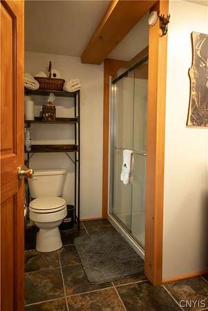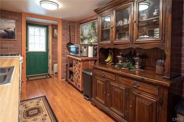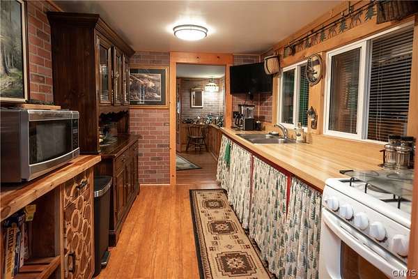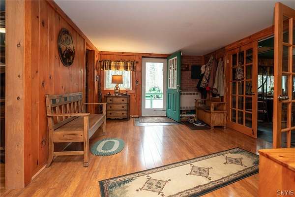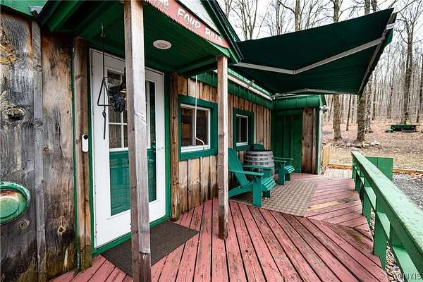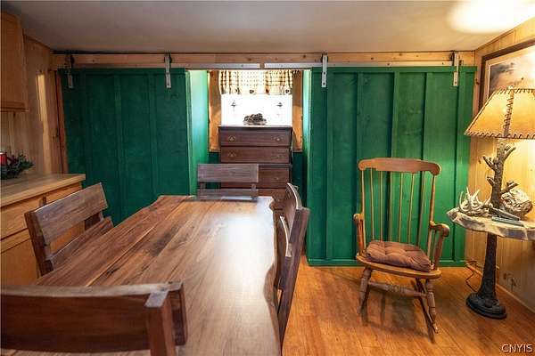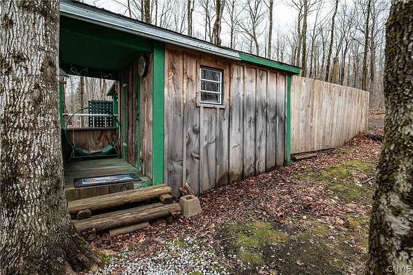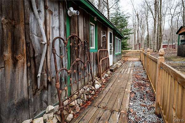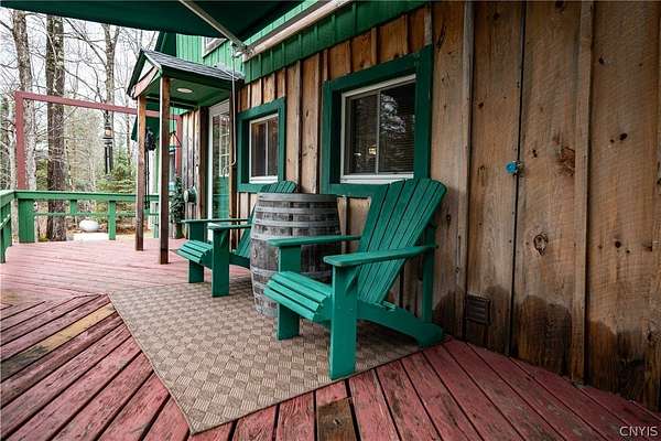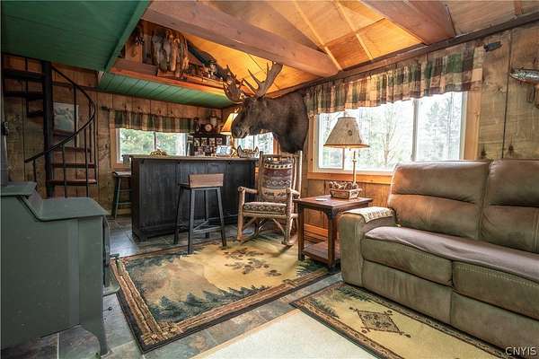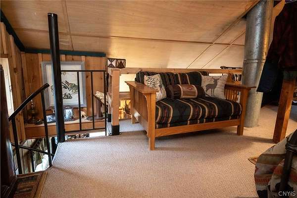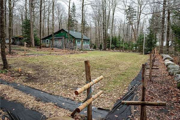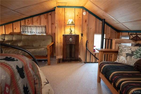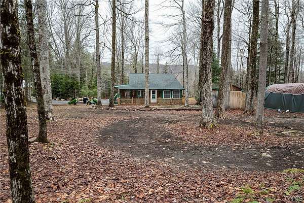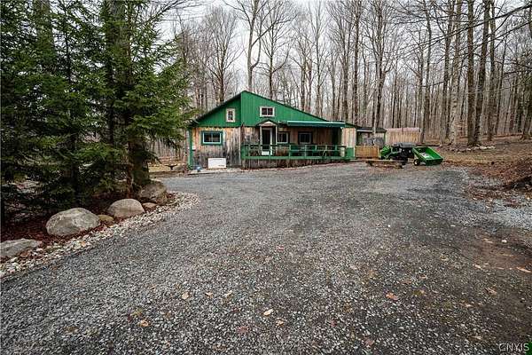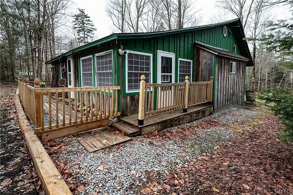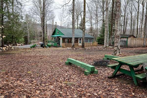 Adirondack Chalet with Deeded Okara Lakes Access - Full of character and authentic Adirondack charm, this inviting chalet-style home is set on 1.58 wooded acres in Thendara, just minutes from Old Forge and with deeded access to Okara Lakes. Step inside and immediately feel the warmth of the home's rustic design, highlighted by natural wood walls, lodge-style finishes, and a striking wood stove set against a brick backdrop-creating the perfect centerpiece for cozy Adirondack evenings. The great room also features a custom bar area and abundant natural light, making it ideal for entertaining or relaxing after a day outdoors. The galley kitchen is both functional and charming, with generous counter space and a separate dining room that adds flexibility for gatherings. A main-floor bedroom, full bathroom, and dedicated laundry area provide convenient single-level living. A spiral staircase leads to the loft bedroom above, offering additional sleeping space along with a unique overlook and classic chalet feel. The loft also provides room for a sitting area, perfect for reading or unwinding. Outside, enjoy a private, wooded setting with room to gather, entertain, or simply take in the peaceful surroundings. A detached outbuilding offers excellent storage for recreational equipment, tools, or seasonal gear. A whole house generator, new asphalt roof in 2025, new stone driveway with drainage in 2024, and an updated septic are only a few of the updates on this charming Adirondack cottage! Located close to snowmobile trails and just a short drive to Old Forge's shops, restaurants, and year-round attractions, this property is ideally suited as a four-season getaway, investment opportunity, or full-time residence. Lake access, privacy, and true Adirondack style-this property delivers it all.