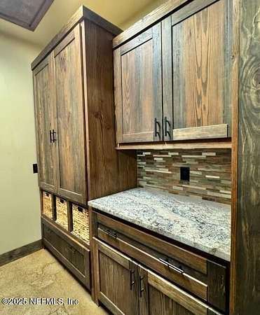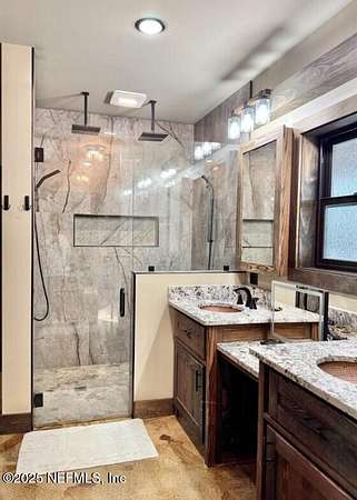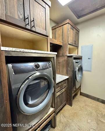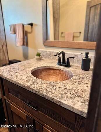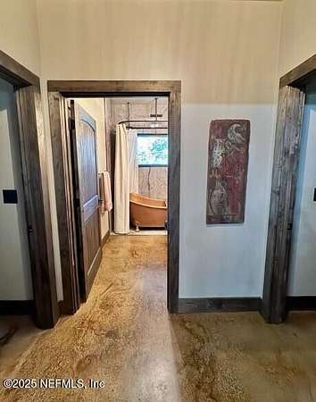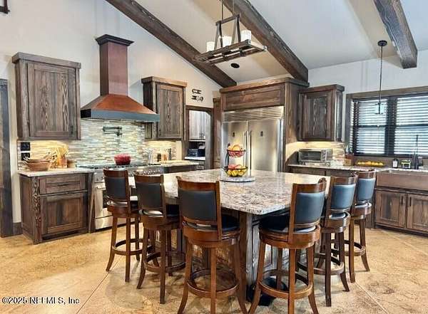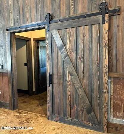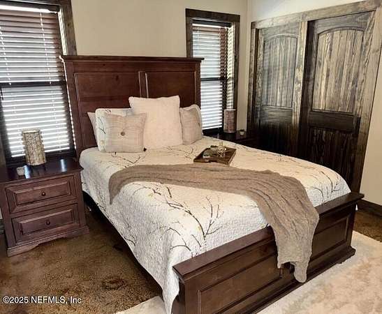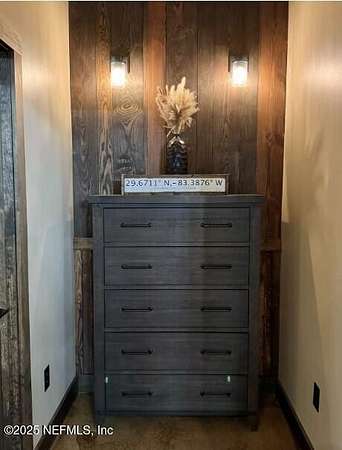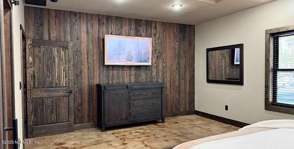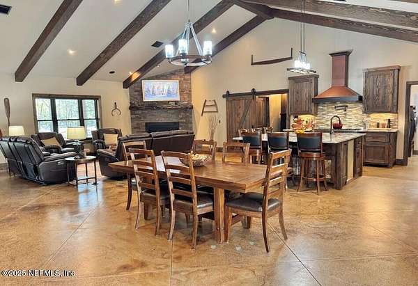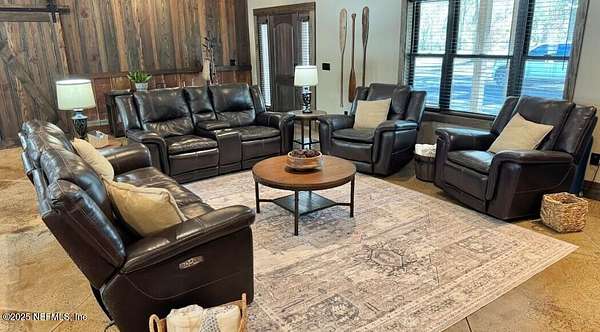 Welcome to a one of a kind custom estate in Steinhatchee, Florida! Situated on 27 private acres reminiscent of a state park, this exceptional 3 bedroom, 2 bath, approximately 5,000 square foot home blends Florida Cracker charm with the warmth and grandeur of a Tennessee mountain lodge. Every detail has been thoughtfully designed to create a refined yet inviting retreat. A stunning 2,500 square foot wraparound porch supported by 28 custom wood columns overlooks the serene landscape, while a grand ten foot wide stadium style entry sets an impressive tone upon arrival. Architectural highlights include a classic 5V barn style metal roof, board and batten siding, and a stone veneer stem wall. The gated entrance features approximately 1,500 feet of paved frontage with a four board fence, irrigated landscaping, and uplighting. A matching 400 square foot pump and pool house includes a full water filtration system and a 32KW Generac generator capable of powering the entire property. Inside, handcrafted pine cabinetry and accent walls made from 100 year old Steinhatchee pines add warmth and character throughout. Nine foot ceilings flow through the home, with a soaring sixteen foot great room featuring 22 foot book matched pine beams, polished concrete floors, and a striking gas fireplace with a cypress mantel. The chef's kitchen is equipped with commercial grade appliances, an eight burner gas range, a custom copper hood, and copper and stone finishes. The primary suite offers a peaceful retreat with a spa inspired en suite bath featuring a luxury walk in tile shower with dual rainfall heads. Additional highlights include Anderson windows, custom pine doors, specialty lighting, surround sound, generous storage, and modern utility systems. Two wells, a buried propane tank, and a dedicated barn area on the back ten acres complete the property. This remarkable home offers privacy, craftsmanship, and luxury living in a truly tranquil North Florida setting.