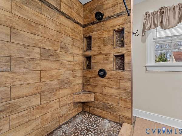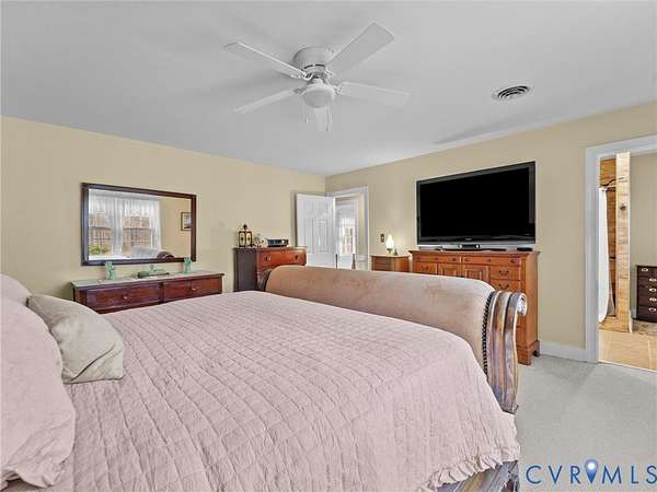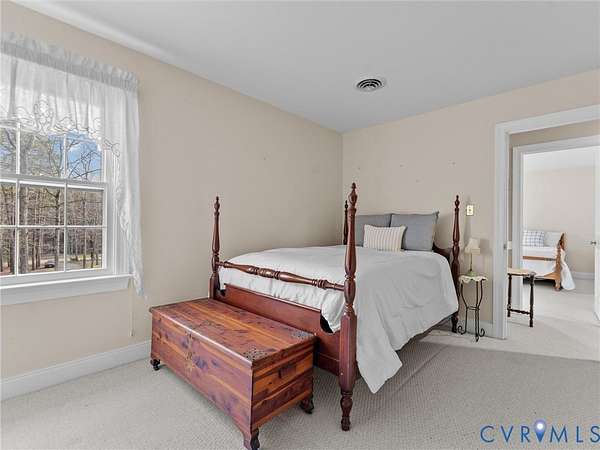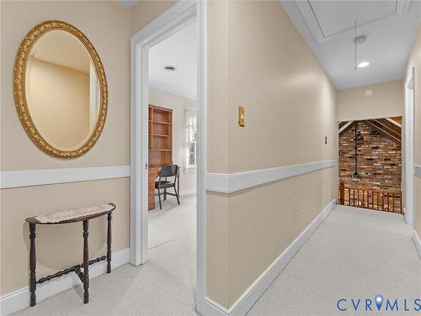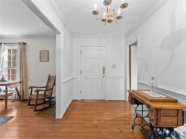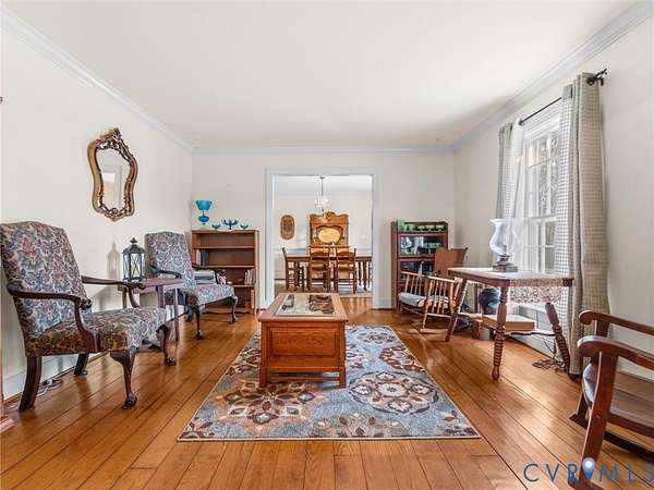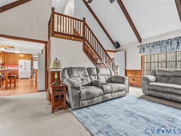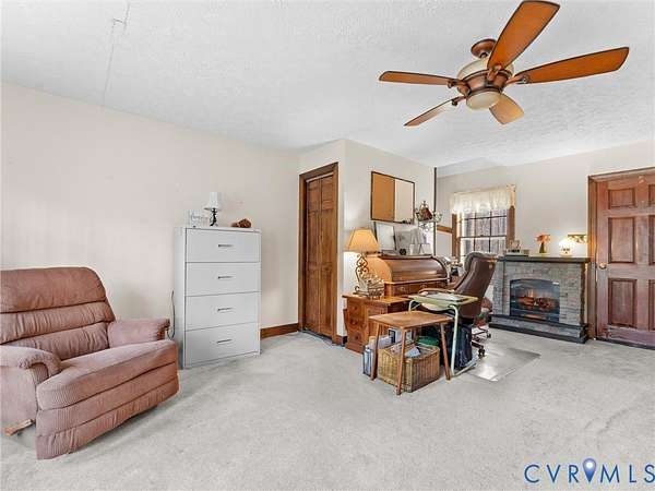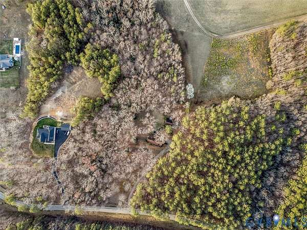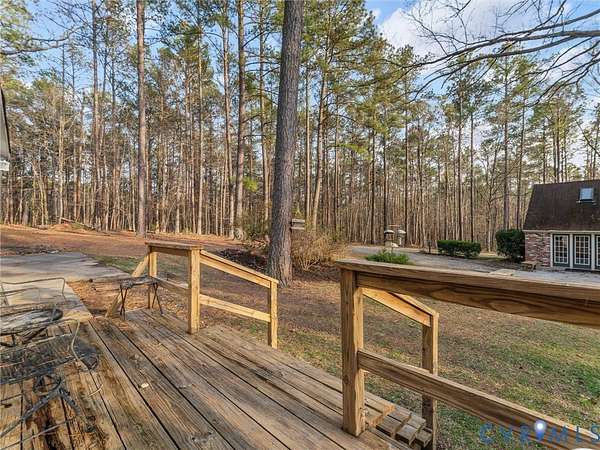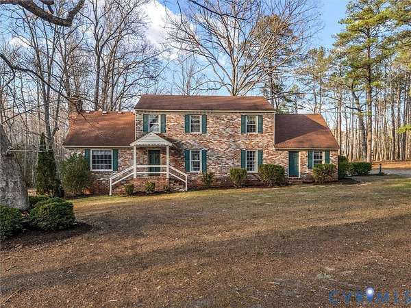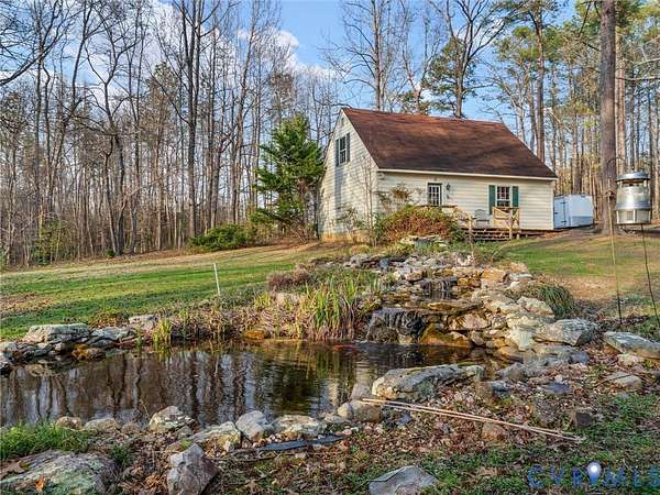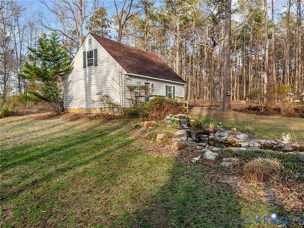 Step through the front door into a welcoming entryway with a coat closet. To the left, the living room features cathedral ceilings and a gas fireplace, while to the right a comfortable sitting room flows into the formal dining room. Straight ahead, the kitchen overlooks the backyard and the flowing koi pond, bringing the peaceful outdoor setting right into the heart of the home. The first floor also includes a half bath with laundry and a private office. Upstairs you will find two bedrooms, a full hall bath, and the primary suite with an ensuite bathroom and walk-in closet. Situated on 5.8 quiet acres off River Road, this property offers the space and privacy many buyers are looking for while still being less than 20 minutes from Hull Street. Outside, enjoy the calming sound of the koi pond in the backyard, serviced yearly, and take advantage of the oversized two-story detached garage with finished attic space, perfect for extra storage.