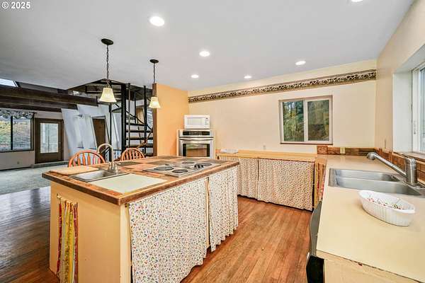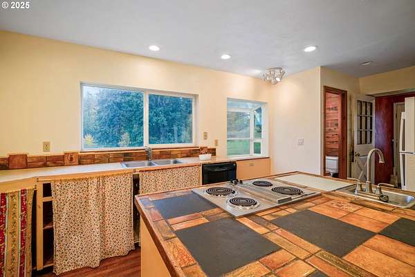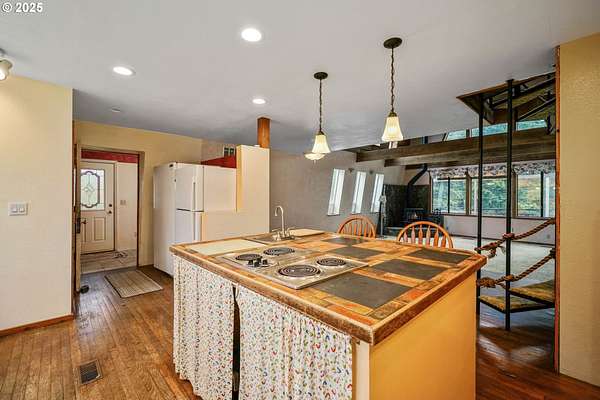 - Builtin Range, Dishwasher, Down Draft, Free Standing Refrigerator, Island
