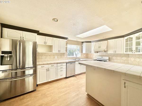 - Dishwasher, Free Standing Gas Range, Free Standing Refrigerator, Island, Range Hood, Tile