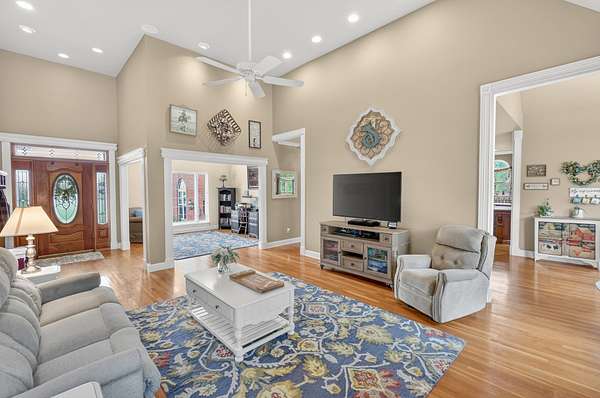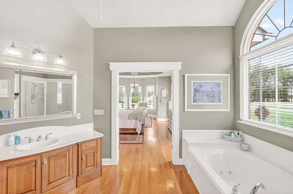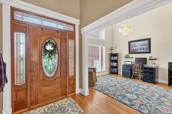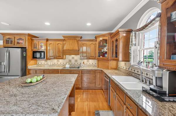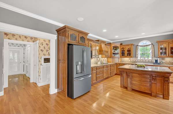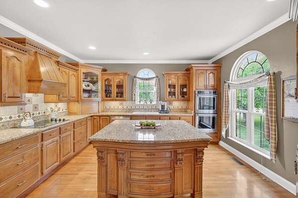 Inside, you’ll find high ceilings and gorgeous mouldings that elevate the home’s character, along with a spacious kitchen designed for both daily living and entertaining. The island offers storage on all four sides, complemented by double ovens, a wet bar, and abundant cabinetry. Two pantries—including a double pantry with washer/dryer hookup—offer flexibility for storage or an indoor laundry option, with additional hookups located in the garage. The washer and dryer in the garage will convey.