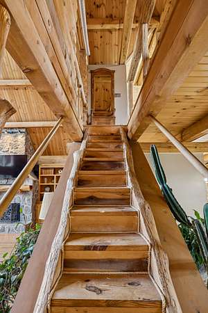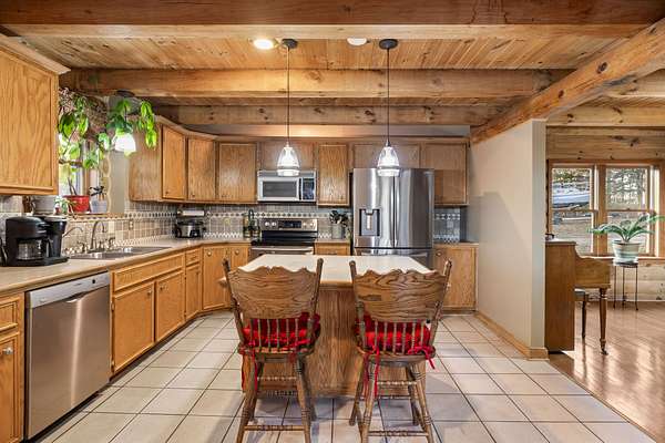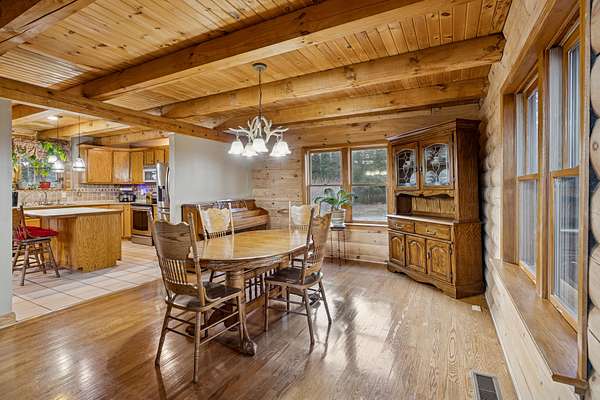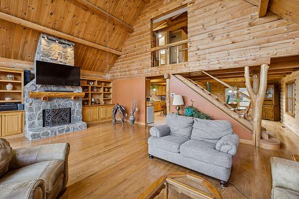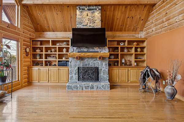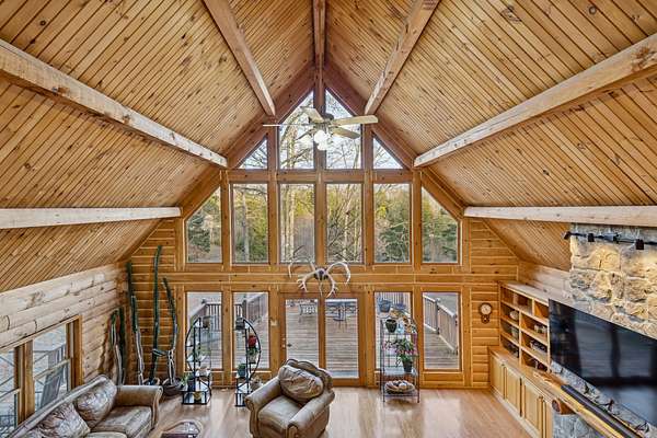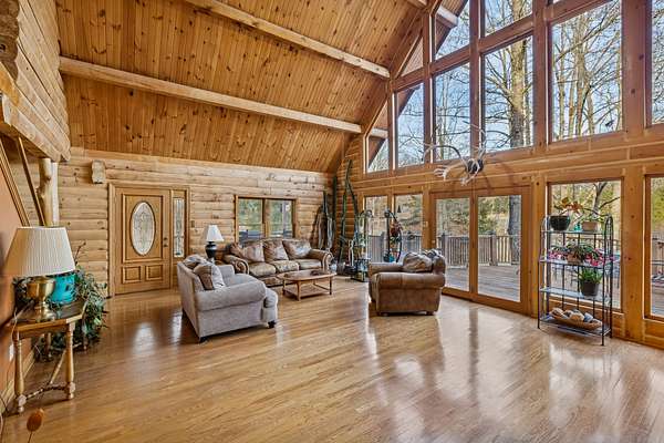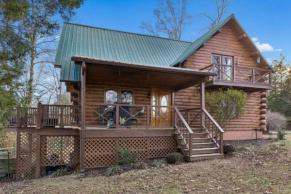Custom log cabin retreat situated on over 10 private acres in scenic Lyles, Tennessee, offering an exceptional blend of open pasture, gently rolling land, and wooded privacy. Expertly constructed using Northern White Pine logs hand-selected and milled in New Hampshire by Pioneer Log Homes, this custom-built property showcases true craftsmanship and durability, combining classic log-home character with thoughtful modern conveniences. Step inside to rich wood finishes, soaring vaulted ceilings, and a dramatic stone fireplace that anchors the main living area and creates a warm, inviting, and timeless atmosphere. The open-concept layout seamlessly connects the living, dining, and kitchen spaces, making it ideal for entertaining, hosting family and friends, or enjoying peaceful evenings surrounded by nature. Large windows throughout the home allow abundant natural light and provide picturesque views of the surrounding countryside. The lower level expands the living space and functionality, featuring a second bedroom, full bath, laundry area, a dedicated 9x12 hobby or storage room, and flexible office or recreation space--perfect for guests, work-from-home needs, a media room, or additional living quarters. Year-round comfort is maintained with high-efficiency Trane HVAC units offering zoned climate control. Additional property highlights include a high-quality private well delivering clean, refreshing water, high-speed fiber optic internet, a charming rocking chair front porch, and a massive deck ideal for outdoor entertaining while taking in sweeping views of the rolling Tennessee countryside. This property offers privacy, versatility, and the opportunity to enjoy country living at its finest.