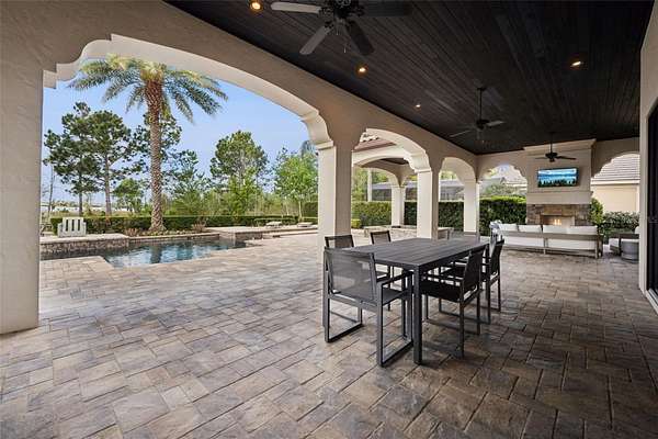 Spectacular lakefront sunsets and complete privacy define this timeless tuscan-inspired retreat just minutes from the charm of historic Mount Dora. Located in an exclusive gated community with convenient access to Orlando, this exceptional residence offers the perfect balance of peaceful waterfront living and proximity to dining, boutiques, and cultural events. Designed for effortless indoor-outdoor living, expansive covered terraces overlook the water and create multiple spaces for gathering and relaxation. The resort-style pool and spa anchor the outdoor living experience, complemented by 2 outdoor fireplaces, a gas firepit, and an outdoor kitchen- an extraordinary setting for sunset evenings and lakeside entertaining. Inside, the home unfolds into a stunning great room with sweeping lake views, creating a dramatic yet inviting centerpiece for the residence. Refined finishes and timeless architectural details enhance the warm, elegant atmosphere throughout the home. The thoughtfully designed split floorpan offers both comfort and privacy, featuring 4 bedrooms and 4 en-suite baths, ideal for hosting family and guests. The oversized climate controlled 4 car garage is perfect for the car enthusiast. A large chef’s kitchen features Sub-Zero and Wolf appliances make preparing meals for large or intimate gatherings a pleasure. Whole house surround, Water softener, Water filtration system, Water leak detection system, Salt water pool, Solar panels for pool, outdoor cameras etc are just some of the homes features. A rare opportunity to own a private waterfront sanctuary where breathtaking sunsets, exceptional entertaining spaces and the relaxed sophistication of lakefront living all come together.