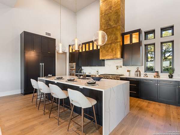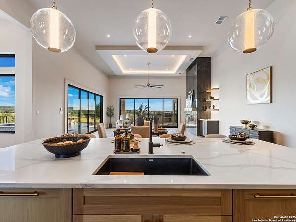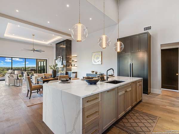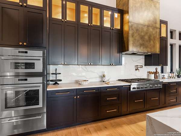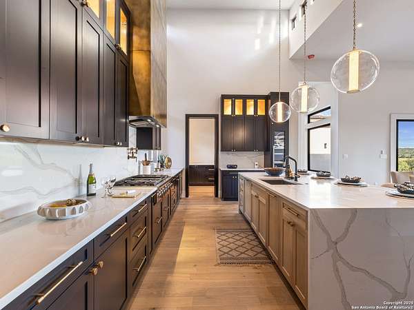 This luxurious Canyon Lake waterfront home blends modern elegance with a warm, homey feel, thoughtfully curated with high-end upgrades and designer finishes throughout. This 5 bedroom with a flex on one of the bedroom to be a study with its own enterence. A local interior design company hand-selected each detail, complemented by a professionally designed landscape by a landscape engineer. Inside, the gourmet kitchen is a chef's dream, featuring top-of-the-line Thermador appliances-including a refrigerator, gas stove, freezer, 3-in-1 oven, dishwasher, and wine refrigerator-set against custom white oak cabinetry and luxury white oak flooring that flows throughout the home. A striking 12' custom brass hood becomes a stunning focal point, while the adjacent butler's pantry offers a plus on a prep space and sink for effortless entertaining. Built-in speakers fill the great room, game room, outdoor pool area, and primary suite with rich sound, and the home is prewired with smart low-voltage infrastructure for future upgrades-especially designed to make the game room theater-quality. Additional features include propane gas for the indoor stovetop and outdoor grill, prewiring for a whole-home generator, and designer lighting from Lighting Inc, including floating cabinets with under-cabinet lighting and ambient accent lighting throughout. The spa-like primary bathroom boasts marble tile, a statement accent wall, a freestanding soaking tub, a bidet, and a boutique-style closet custom-designed by a professional closet company. Energy efficiency meets innovation with state-of-the-art Daikin HVAC units, Brizo plumbing in the primary bathroom, kitchen and gameroom, among the latest in comfort technology. The game room also includes a wet bar, while the flex room or study opens to the front patio, offering versatility for your lifestyle. Step outside to enjoy an outdoor grill station, beverage cooler, and built-in security cameras already installed for peace of mind. This home is a true waterfront masterpiece, balancing luxury and comfort in every detail. The Neighborhood also had a kayak and Paddle board rentals walking distance from the property, perfect for entertaining.