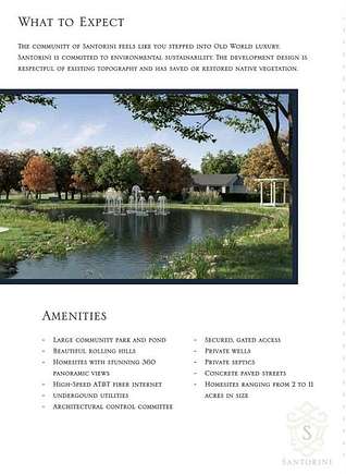 Est $1,434/moSantorini is the premier, gated new development in highly acclaimed Brock ISD. It features concrete streets, panoramic country views and offers the very best of luxury lifestyles. Bring your own builder for the dream home you've always imagined.