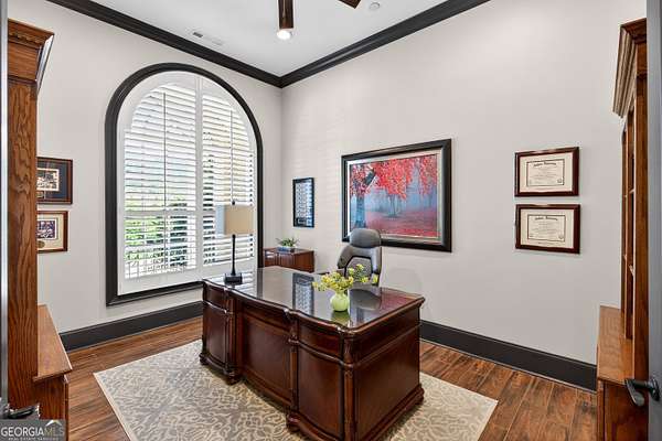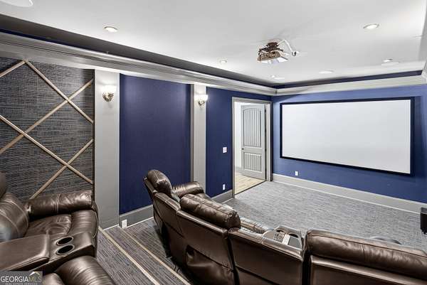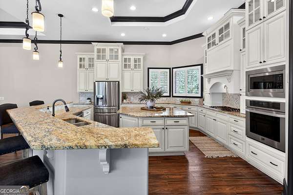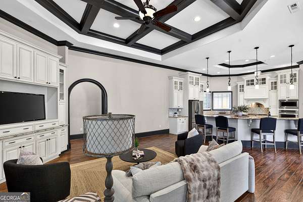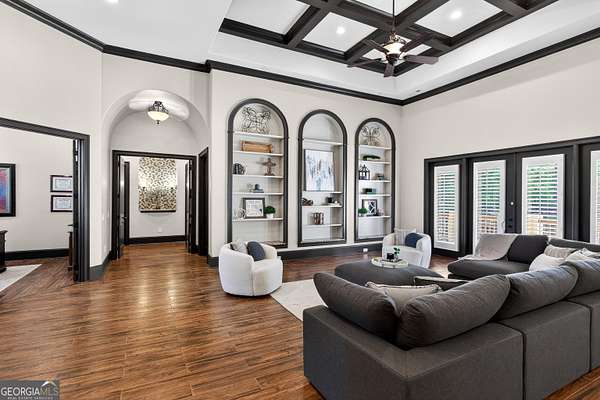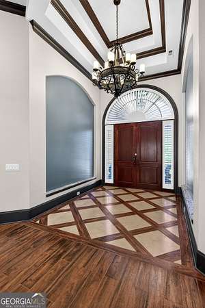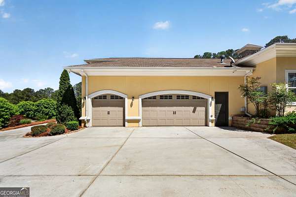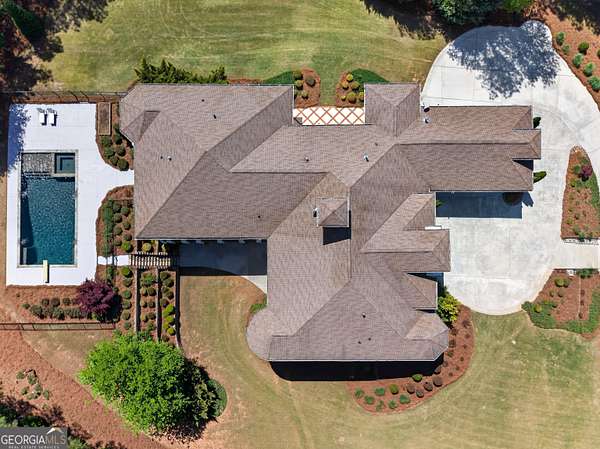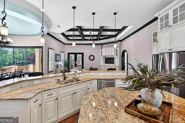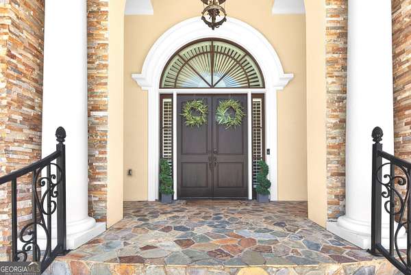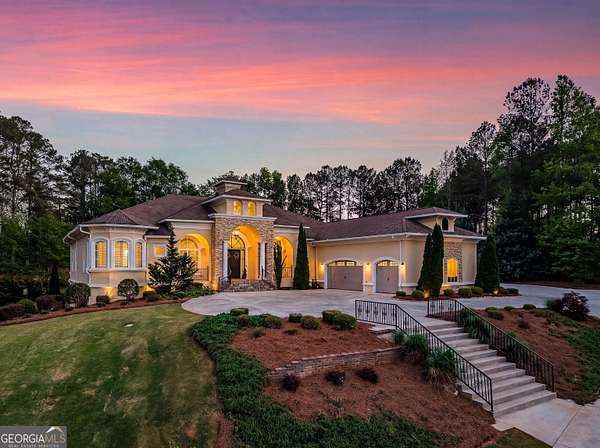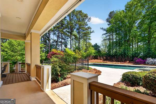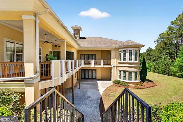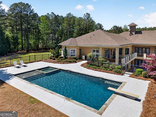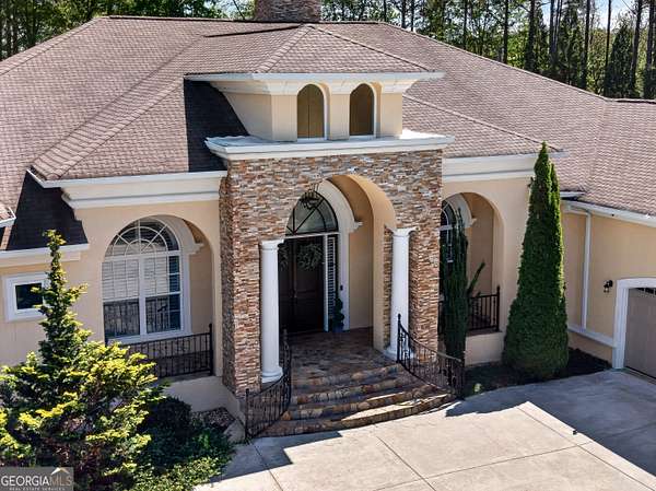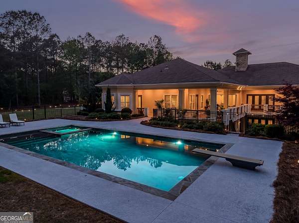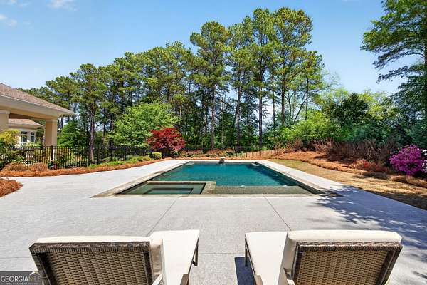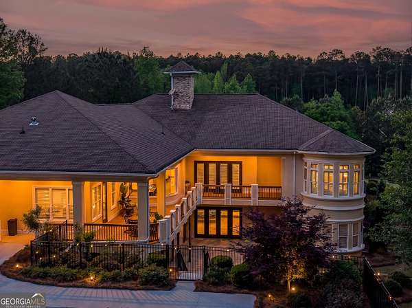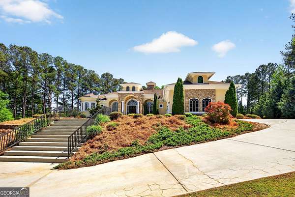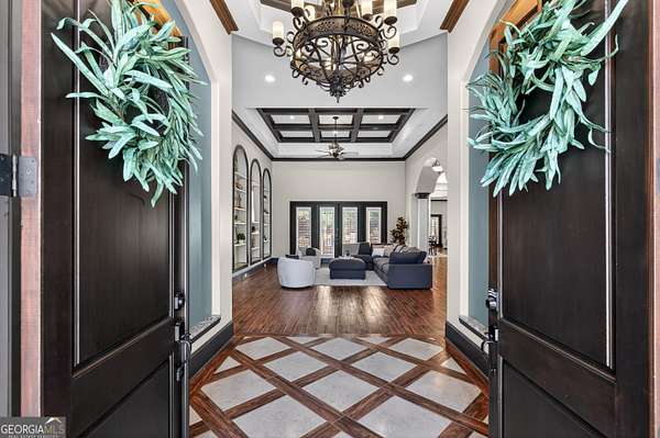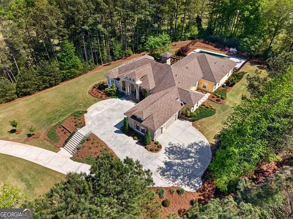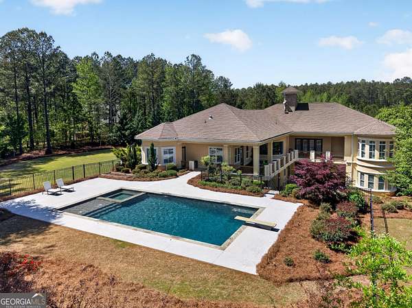 Tucked away on nearly 2.5 acres of complete privacy, this Custom-built Estate offers a rare opportunity to enjoy luxury living in the heart of Peachtree City. From the moment you walk through the grand double doors into the foyer, you know you've stepped into something truly special--a one-of-a-kind, 2015-built custom ranch with a fully finished terrace level that feels both elevated and effortless. This home is a true masterclass in architectural design, where every curve, ceiling detail, and space was created with intention. Soaring ceilings ranging from 14 to 22 feet are layered with coffered, barrel, and domed designs, complemented by intricate millwork, curved walls, and custom windows that flood the home with natural light. The main level features five spacious ensuite bedrooms--each comparable in size to a primary suite-with oversized vanities, custom tiled showers, and walk-in closets with built-ins. The primary suite is thoughtfully positioned on its own private wing, offering a true retreat with a sitting area, three walk-in closets, and a spa-inspired bath featuring a walk-in shower, freestanding soaking tub framed by bay windows, along with generous cabinetry, vanities and built-ins. The formal living and dining rooms make a statement, anchored by floor-to-ceiling built-ins and custom cabinetry, with a dining space designed to host gatherings of 14+. Double doors lead to a private side patio, creating the perfect setting for intimate outdoor entertaining. At the heart of the home, the chef's kitchen opens seamlessly into the great room and features gorgeous cabinetry, a walk-in pantry, pot-filler faucet, a massive island for prep along with additional eat-in counter space. The casual dining area is truly exceptional, highlighted by a domed ceiling and a curved wall of windows overlooking the covered veranda and PebbleTec pool/spa. A second kitchen just off the great room and deck adds flexibility-ideal for outdoor entertaining or keeping cooking aromas separate. A private office, half bath and full laundry room finish the thoughtfully designed main level just shy of 6,000 sq ft. The expansive covered veranda wraps across the back of the home, with access from the primary suite, living areas, and one of the ensuite bedrooms-creating a seamless indoor-outdoor lifestyle. Downstairs, the terrace level continues to impress with 14-foot ceilings and eight-foot doors, offering a layout designed for entertaining and extended living. Features include a private theater room, expansive open living space with bar area, and two oversized bedrooms connected by a beautifully appointed full bath, plus an additional half bath-ideal for guests or multi-generational living. An additional private patio is accessible from the terrace level. The 2.45-acre lot provides exceptional privacy along with ample yard space for recreation, gardening, or simply enjoying the outdoors. The 5-year new PebbleTec saltwater pool and spa with tanning shelf and modern technology creates a true resort-style experience. Additional features-including 900 sq. ft 3-car drive-through garage with EV charger, new tankless water heaters, foam insulation, abundant storage, plantation shutters on every main-level door and window, and an invisible pet fence-add both efficiency and ease of living. Located in the sought-after Hyde Park subdivision, where custom homes rarely come available, this property offers the unique combination of an estate property just minutes from everyday conveniences such as shopping, dining, amenities and award-winning schools. Hyde Park also features a neighborhood pond, dock and gazebo, with direct access to Peachtree City's golf cart paths, and a private neighborhood path with access to nearby schools. Designed for both grand entertaining and everyday living, this property is truly exceptional.