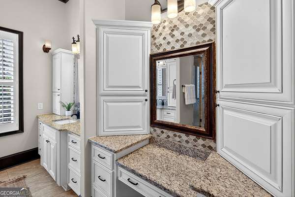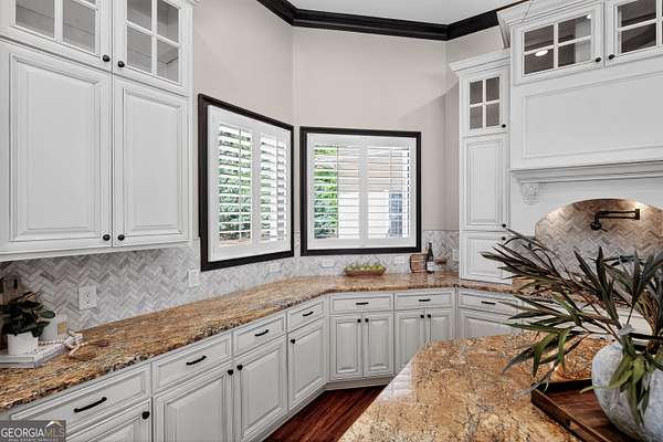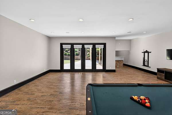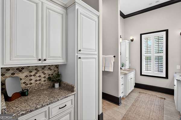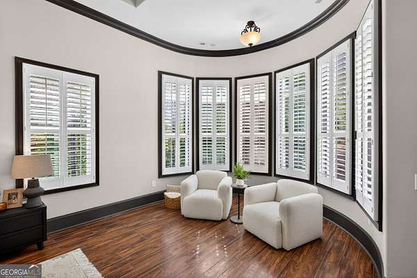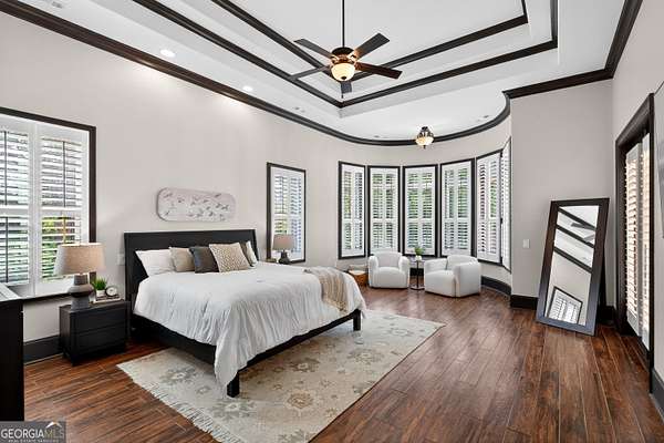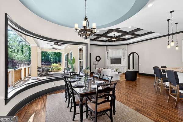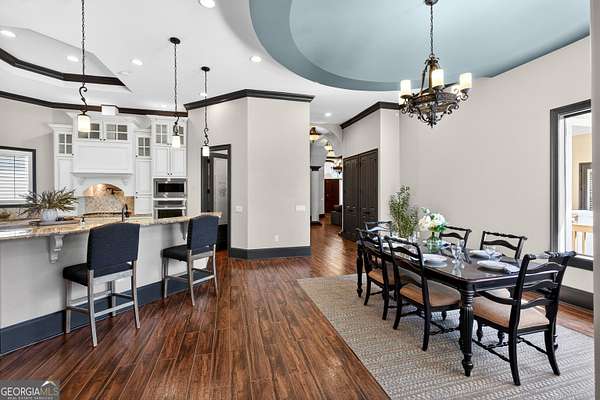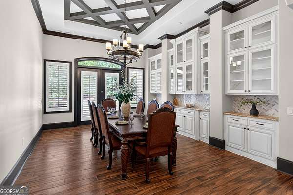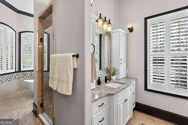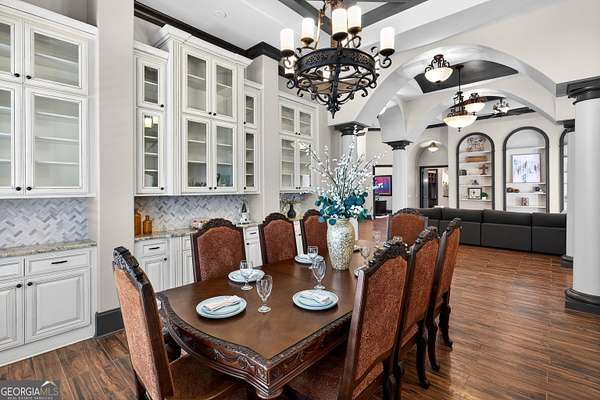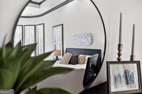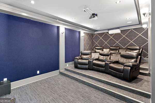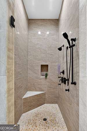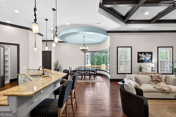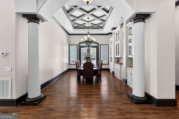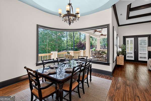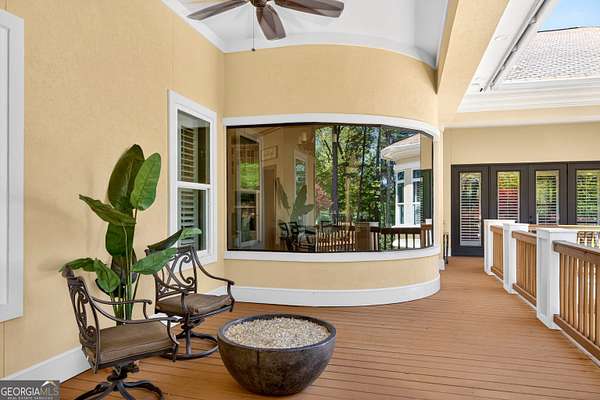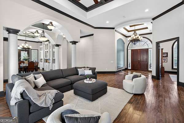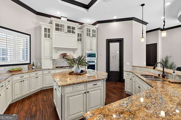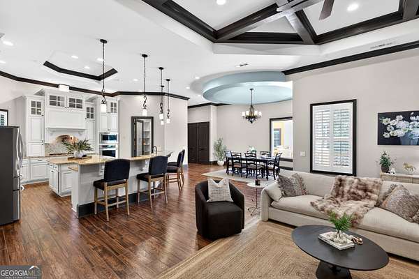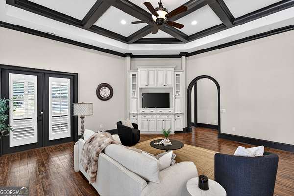 Tucked away on nearly 2.5 acres of complete privacy, this Custom-built Estate offers a rare opportunity to enjoy luxury living in the heart of Peachtree City. From the moment you walk through the grand double doors into the foyer, you know you've stepped into something truly special--a one-of-a-kind, 2015-built custom ranch with a fully finished terrace level that feels both elevated and effortless. This home is a true masterclass in architectural design, where every curve, ceiling detail, and space was created with intention. Soaring ceilings ranging from 14 to 22 feet are layered with coffered, barrel, and domed designs, complemented by intricate millwork, curved walls, and custom windows that flood the home with natural light. The main level features five spacious ensuite bedrooms--each comparable in size to a primary suite-with oversized vanities, custom tiled showers, and walk-in closets with built-ins. The primary suite is thoughtfully positioned on its own private wing, offering a true retreat with a sitting area, three walk-in closets, and a spa-inspired bath featuring a walk-in shower, freestanding soaking tub framed by bay windows, along with generous cabinetry, vanities and built-ins. The formal living and dining rooms make a statement, anchored by floor-to-ceiling built-ins and custom cabinetry, with a dining space designed to host gatherings of 14+. Double doors lead to a private side patio, creating the perfect setting for intimate outdoor entertaining. At the heart of the home, the chef's kitchen opens seamlessly into the great room and features gorgeous cabinetry, a walk-in pantry, pot-filler faucet, a massive island for prep along with additional eat-in counter space. The casual dining area is truly exceptional, highlighted by a domed ceiling and a curved wall of windows overlooking the covered veranda and PebbleTec pool/spa. A second kitchen just off the great room and deck adds flexibility-ideal for outdoor entertaining or keeping cooking aromas separate. A private office, half bath and full laundry room finish the thoughtfully designed main level just shy of 6,000 sq ft. The expansive covered veranda wraps across the back of the home, with access from the primary suite, living areas, and one of the ensuite bedrooms-creating a seamless indoor-outdoor lifestyle. Downstairs, the terrace level continues to impress with 14-foot ceilings and eight-foot doors, offering a layout designed for entertaining and extended living. Features include a private theater room, expansive open living space with bar area, and two oversized bedrooms connected by a beautifully appointed full bath, plus an additional half bath-ideal for guests or multi-generational living. An additional private patio is accessible from the terrace level. The 2.45-acre lot provides exceptional privacy along with ample yard space for recreation, gardening, or simply enjoying the outdoors. The 5-year new PebbleTec saltwater pool and spa with tanning shelf and modern technology creates a true resort-style experience. Additional features-including 900 sq. ft 3-car drive-through garage with EV charger, new tankless water heaters, foam insulation, abundant storage, plantation shutters on every main-level door and window, and an invisible pet fence-add both efficiency and ease of living. Located in the sought-after Hyde Park subdivision, where custom homes rarely come available, this property offers the unique combination of an estate property just minutes from everyday conveniences such as shopping, dining, amenities and award-winning schools. Hyde Park also features a neighborhood pond, dock and gazebo, with direct access to Peachtree City's golf cart paths, and a private neighborhood path with access to nearby schools. Designed for both grand entertaining and everyday living, this property is truly exceptional.