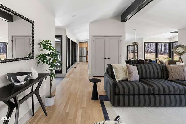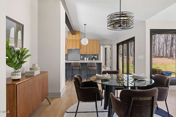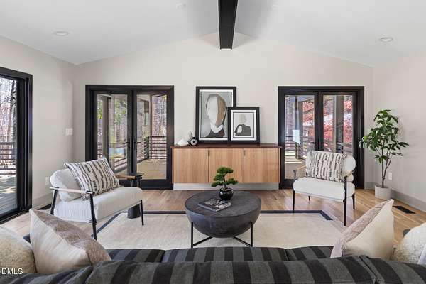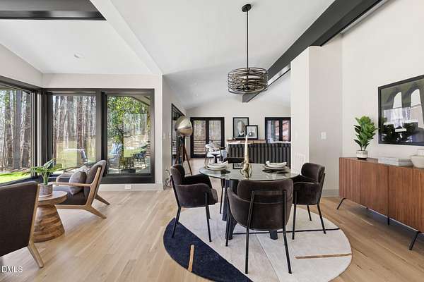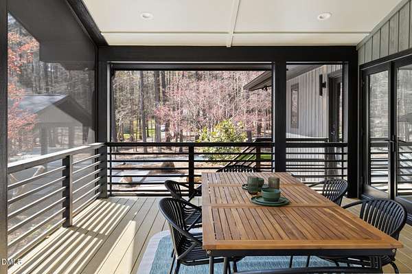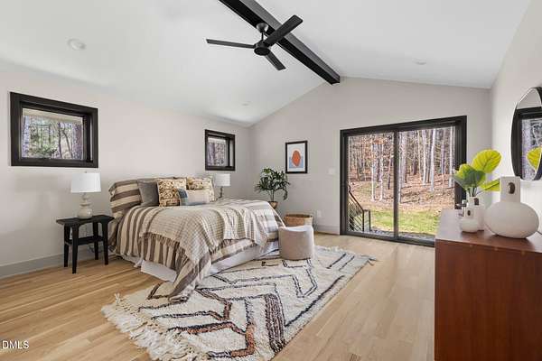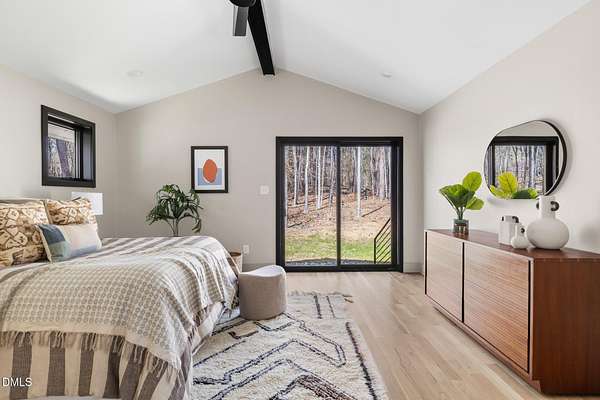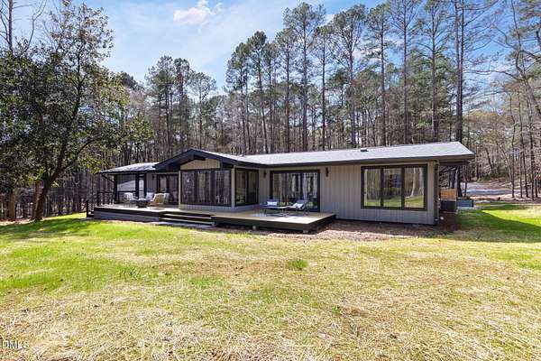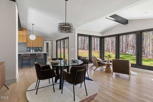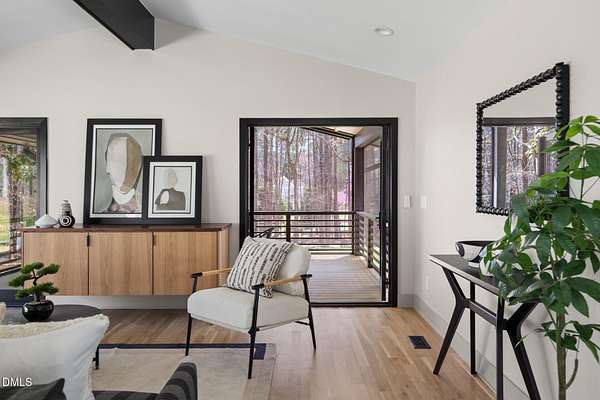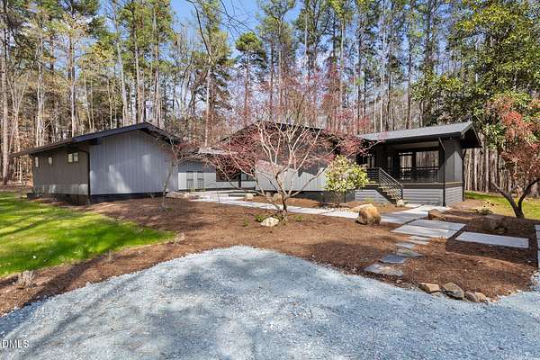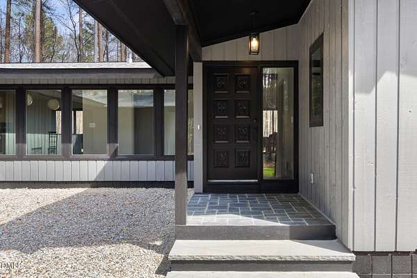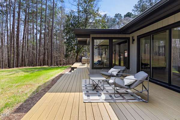Originally designed in 1974 by renowned local architect JP Goforth, this remarkable mid-century modern residence offers true one-level living and has been meticulously reimagined over the past 2.5 years, with nearly $1M invested to blend architectural authenticity with modern refinement. Set on two private acres and backing directly to Duke Forest, the home feels completely immersed in nature. Walls of windows frame serene wooded views in nearly every direction, filling the interiors with natural light and creating a seamless connection between indoors and out. Expansive decks and a screened porch extend the living space outward, offering multiple spaces to relax, entertain, and enjoy the quiet beauty of the surrounding landscape. Inside, clean architectural lines and vaulted ceilings create the openness that defines true mid-century design. The layout offers the flexibility to live as a 4-bedroom plus office, ideal for guests, work, or additional living space. The kitchen blends modern functionality with timeless materials, featuring warm wood cabinetry, quartz countertops, a waterfall island, and sleek contemporary finishes. The primary suite serves as a private retreat with vaulted ceilings, private patio access, and a beautifully designed ensuite bath complete with a soaking tub and walk-in glass shower. Beyond its architectural significance, the property offers an equally compelling location. Tucked into a quiet wooded setting yet just minutes from downtown Chapel Hill and Durham, the home also benefits from the highly coveted combination of Chapel Hill schools without city taxes. Thoughtfully restored and beautifully positioned within its natural surroundings, 202 Mimosa Drive represents a rare opportunity to own a true mid-century modern home in one of the Triangle's most desirable locations.