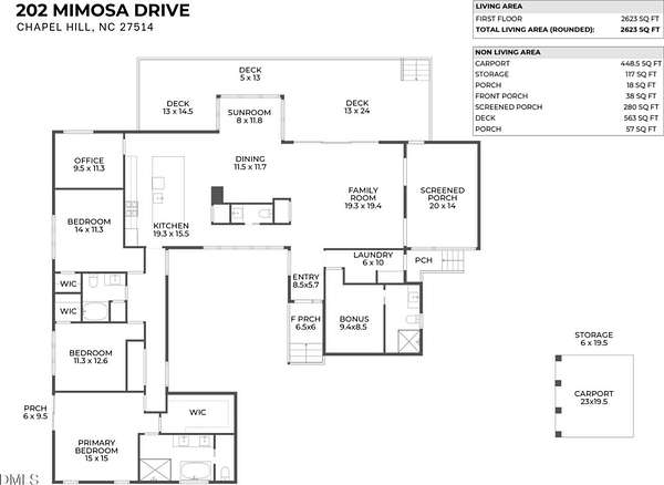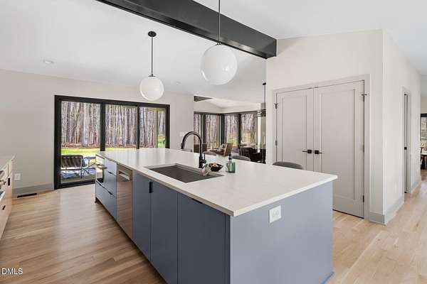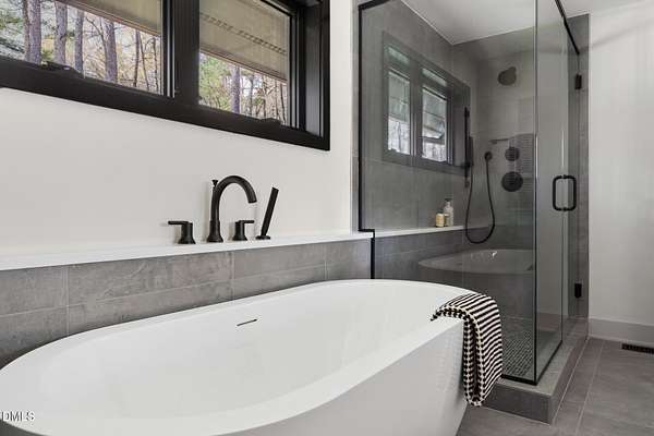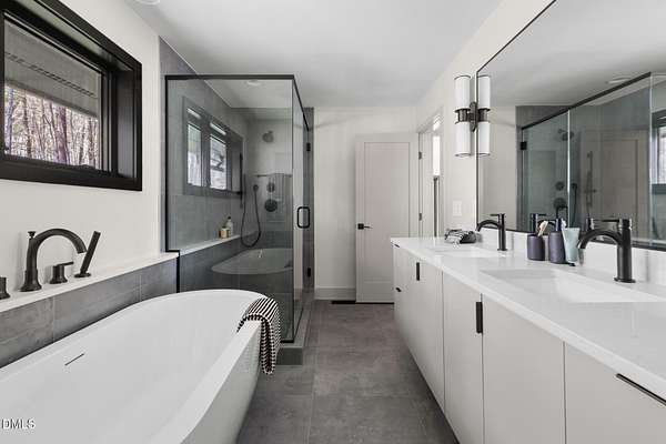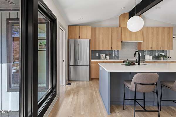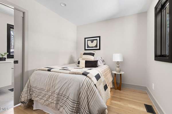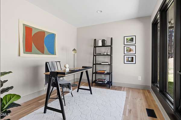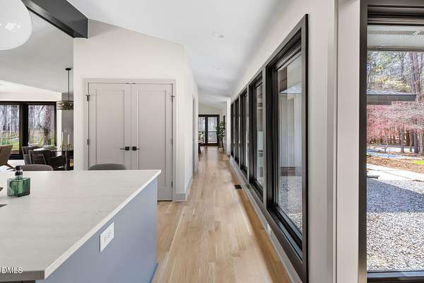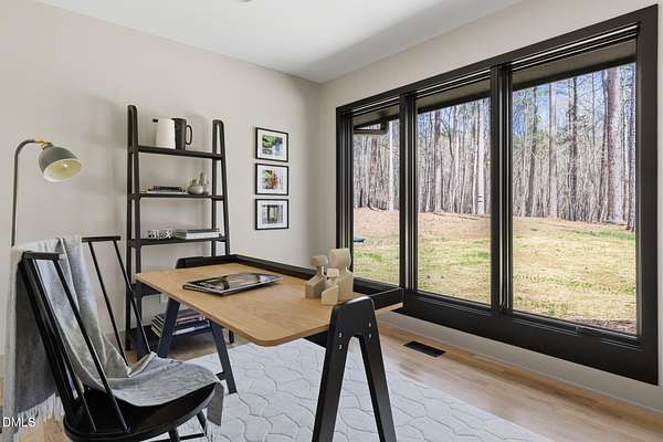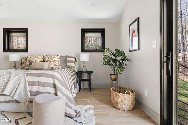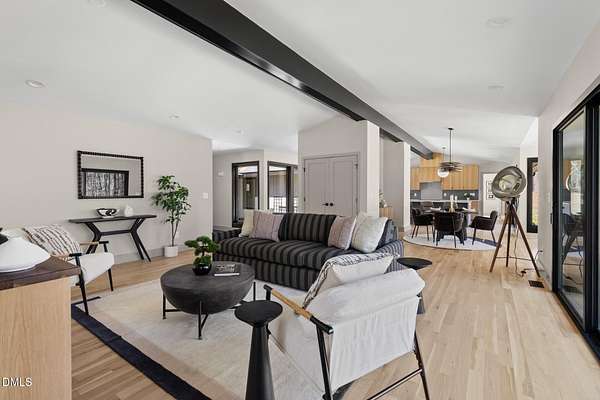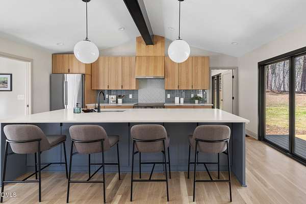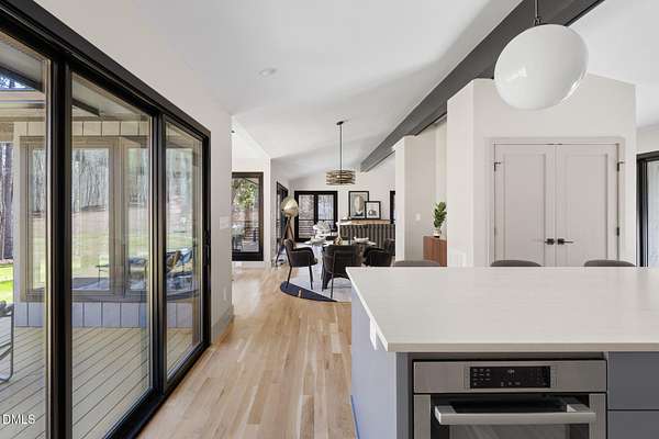 Originally designed in 1974 by renowned local architect JP Goforth, this remarkable mid-century modern residence offers true one-level living and has been meticulously reimagined over the past 2.5 years, with nearly $1M invested to blend architectural authenticity with modern refinement. Set on two private acres and backing directly to Duke Forest, the home feels completely immersed in nature. Walls of windows frame serene wooded views in nearly every direction, filling the interiors with natural light and creating a seamless connection between indoors and out. Expansive decks and a screened porch extend the living space outward, offering multiple spaces to relax, entertain, and enjoy the quiet beauty of the surrounding landscape. Inside, clean architectural lines and vaulted ceilings create the openness that defines true mid-century design. The layout offers the flexibility to live as a 4-bedroom plus office, ideal for guests, work, or additional living space. The kitchen blends modern functionality with timeless materials, featuring warm wood cabinetry, quartz countertops, a waterfall island, and sleek contemporary finishes. The primary suite serves as a private retreat with vaulted ceilings, private patio access, and a beautifully designed ensuite bath complete with a soaking tub and walk-in glass shower. Beyond its architectural significance, the property offers an equally compelling location. Tucked into a quiet wooded setting yet just minutes from downtown Chapel Hill and Durham, the home also benefits from the highly coveted combination of Chapel Hill schools without city taxes. Thoughtfully restored and beautifully positioned within its natural surroundings, 202 Mimosa Drive represents a rare opportunity to own a true mid-century modern home in one of the Triangle's most desirable locations.