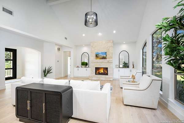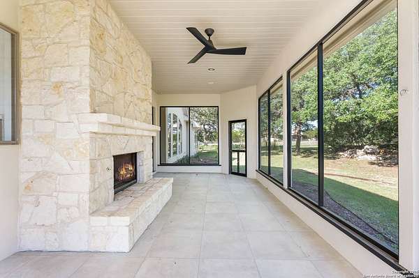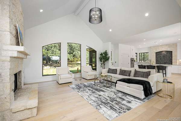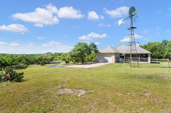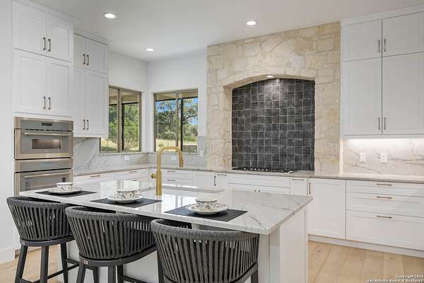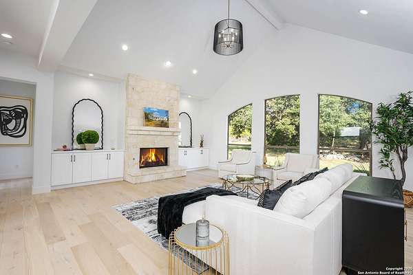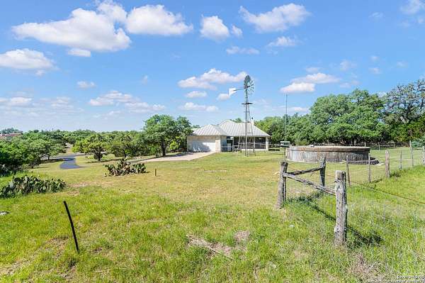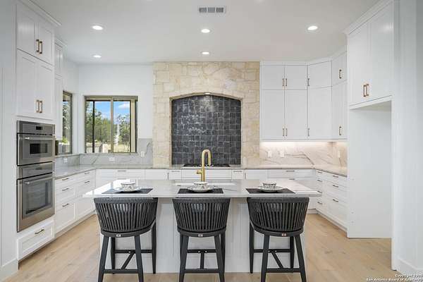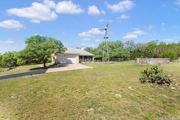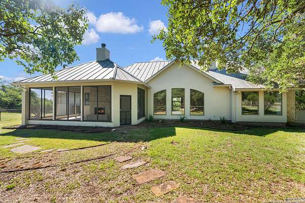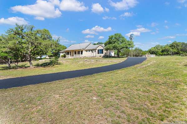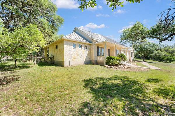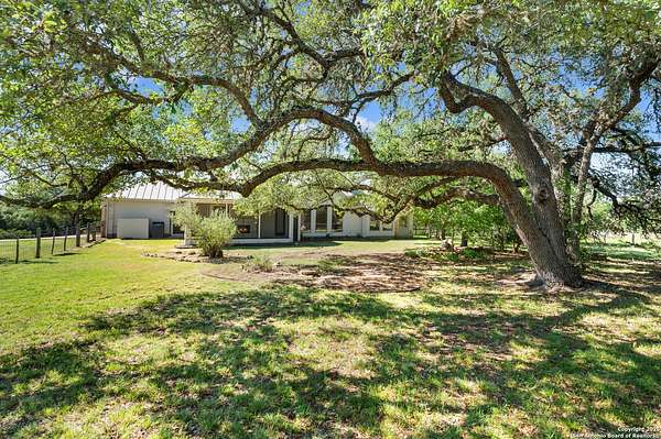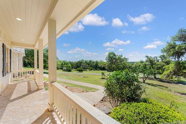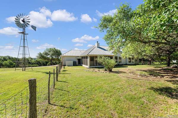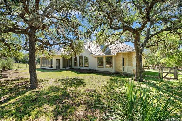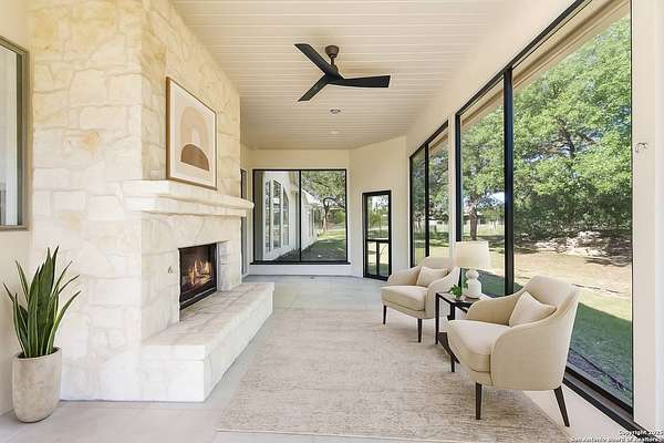 This exquisitely renovated single-story home is nestled on 5.14 acres with beautiful century old oaks! A charming meandering walkway leads to the front entrance, where custom exterior shutters elevate the home's curb appeal. Every inch of this transitional residence has been thoughtfully designed with impeccable attention to detail, featuring high ceilings, clean lines, and contemporary finishes throughout. Newly appointed finishes include wide-plank light hardwood flooring, designer lighting, decorative chandeliers, and custom hardware. Every aspect of the home has been meticulously upgraded, from the plumbing, including provisions for a water softener, to the soft-close custom cabinetry. The welcoming foyer, with its striking iron and glass pivot door, ushers you into the heart of the home. The great room features a soaring vaulted ceiling, anchored by a designer chandelier and a floor-to-ceiling stone fireplace that serves as the room's centerpiece. Flowing seamlessly from the living area is the dining space, which connects effortlessly to the chef-inspired island kitchen. This open concept layout enhances both functionality and style, creating an inviting atmosphere perfect for both entertaining and everyday living. The gourmet kitchen features quartzite countertops and top of the line Thermador appliances, including a 5-burner gas cooktop, built-in oven, microwave, and dishwasher. A convenient breakfast bar, a spacious pantry, and sliding windows opening to the screened-in patio making it ideal for both cooking and hosting. The primary suite is a private sanctuary designed for ultimate relaxation. A stepped ceiling adds an architectural touch, while the cozy window seat overlooks the beautifully landscaped backyard. With direct access to a private covered patio and an enclosed side yard, the space offers a serene retreat at the end of a busy day. The spa-like bath is equally luxurious, featuring a dual sink vanity with quartzite countertops in striking black and gray tones. The expansive walk-in shower is a true masterpiece, with dual seamless glass doors, dual rainfall showerheads, and a handheld extension for a truly indulgent experience. The home also includes two additional bedrooms, one of which could serve as a private study, as well as a utility room equipped with a sink and space for a refrigerator. The tranquil backyard is a paradise for outdoor living, offering a wraparound screened patio with a floor-to-ceiling stone fireplace and versatile spaces for lounging, dining, or playing games with family and friends. Overlooking the park-like grounds, the patio creates a seamless connection to nature, with mature trees and shaded canopies that provide a peaceful ambiance. A charming original ranch stone water trough and decorative windmill add rustic appeal to the landscape, while the expansive lawns are perfect for both leisure and play. This stunning property has been thoughtfully and tastefully reimagined, offering an ideal blend of modern sophistication and natural beauty. Conveniently located near the main entrance and clubs area, it offers the perfect opportunity to experience the serene luxury of Hill Country living.