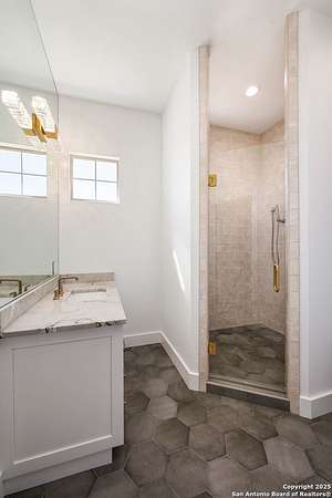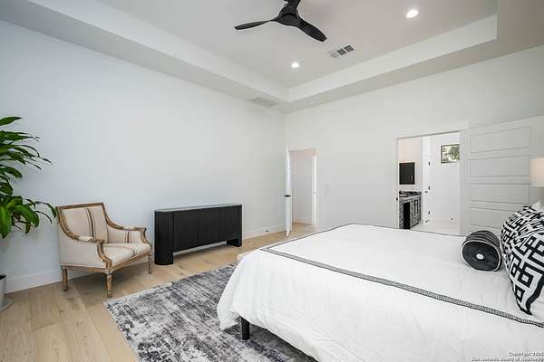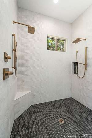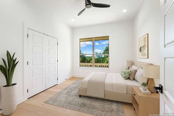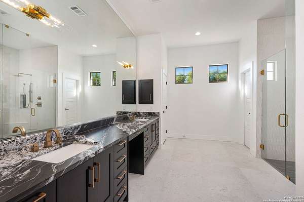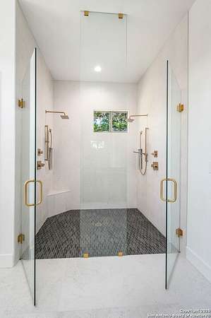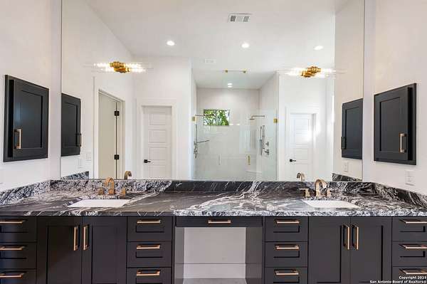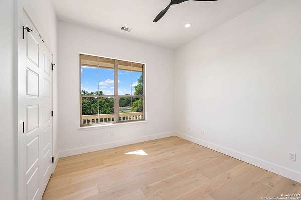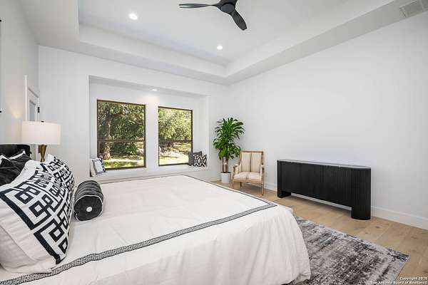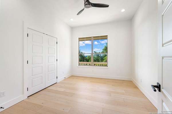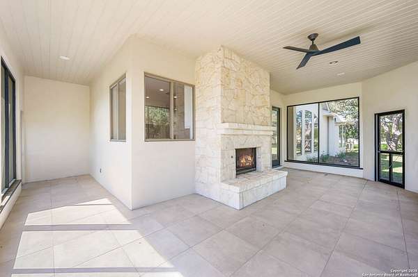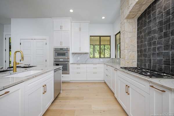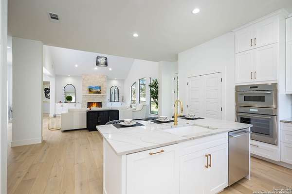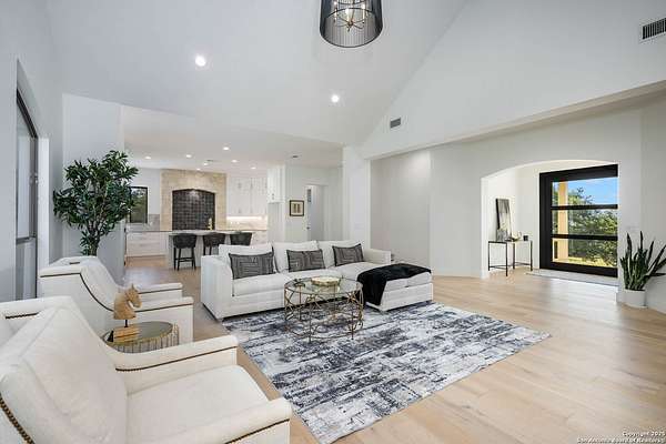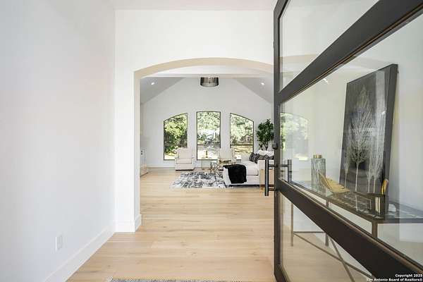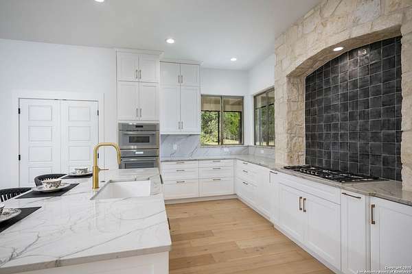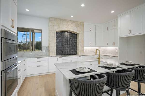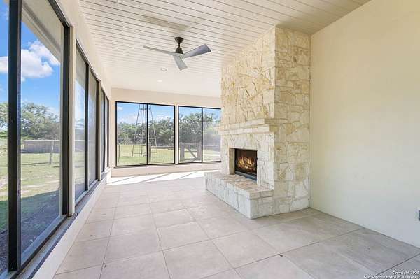 This exquisitely renovated single-story home is nestled on 5.14 acres with beautiful century old oaks! A charming meandering walkway leads to the front entrance, where custom exterior shutters elevate the home's curb appeal. Every inch of this transitional residence has been thoughtfully designed with impeccable attention to detail, featuring high ceilings, clean lines, and contemporary finishes throughout. Newly appointed finishes include wide-plank light hardwood flooring, designer lighting, decorative chandeliers, and custom hardware. Every aspect of the home has been meticulously upgraded, from the plumbing, including provisions for a water softener, to the soft-close custom cabinetry. The welcoming foyer, with its striking iron and glass pivot door, ushers you into the heart of the home. The great room features a soaring vaulted ceiling, anchored by a designer chandelier and a floor-to-ceiling stone fireplace that serves as the room's centerpiece. Flowing seamlessly from the living area is the dining space, which connects effortlessly to the chef-inspired island kitchen. This open concept layout enhances both functionality and style, creating an inviting atmosphere perfect for both entertaining and everyday living. The gourmet kitchen features quartzite countertops and top of the line Thermador appliances, including a 5-burner gas cooktop, built-in oven, microwave, and dishwasher. A convenient breakfast bar, a spacious pantry, and sliding windows opening to the screened-in patio making it ideal for both cooking and hosting. The primary suite is a private sanctuary designed for ultimate relaxation. A stepped ceiling adds an architectural touch, while the cozy window seat overlooks the beautifully landscaped backyard. With direct access to a private covered patio and an enclosed side yard, the space offers a serene retreat at the end of a busy day. The spa-like bath is equally luxurious, featuring a dual sink vanity with quartzite countertops in striking black and gray tones. The expansive walk-in shower is a true masterpiece, with dual seamless glass doors, dual rainfall showerheads, and a handheld extension for a truly indulgent experience. The home also includes two additional bedrooms, one of which could serve as a private study, as well as a utility room equipped with a sink and space for a refrigerator. The tranquil backyard is a paradise for outdoor living, offering a wraparound screened patio with a floor-to-ceiling stone fireplace and versatile spaces for lounging, dining, or playing games with family and friends. Overlooking the park-like grounds, the patio creates a seamless connection to nature, with mature trees and shaded canopies that provide a peaceful ambiance. A charming original ranch stone water trough and decorative windmill add rustic appeal to the landscape, while the expansive lawns are perfect for both leisure and play. This stunning property has been thoughtfully and tastefully reimagined, offering an ideal blend of modern sophistication and natural beauty. Conveniently located near the main entrance and clubs area, it offers the perfect opportunity to experience the serene luxury of Hill Country living.