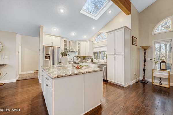 - Beamed Ceilings, Breakfast Bar, Cathedral Ceiling(s), Ceiling Fan(s), Chandelier, Crown Molding, Double Vanity, Granite Counters, High Ceilings, High Speed Internet, Kitchen Island, Open Floorplan, Pantry, Soaking Tub, Track Lighting, Vaulted Ceiling(s), Walk-In Closet(s)