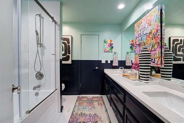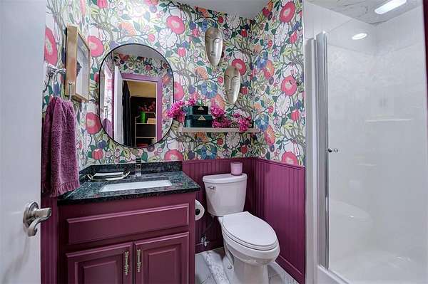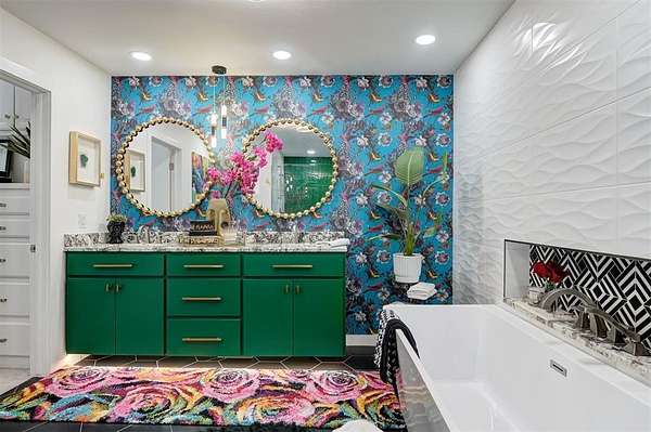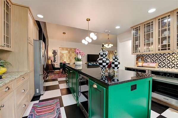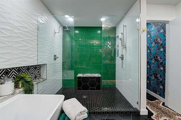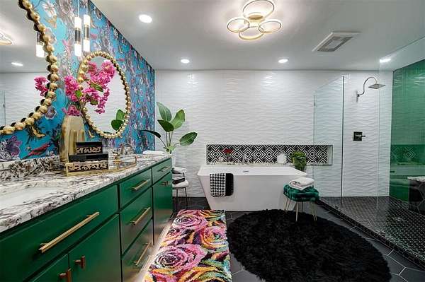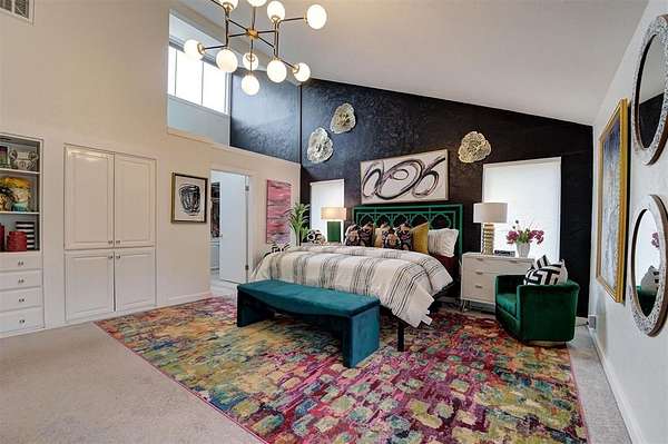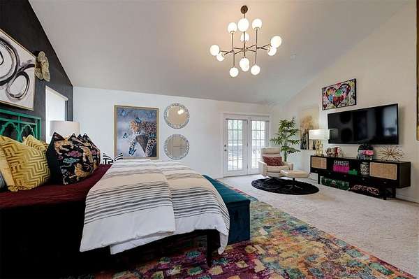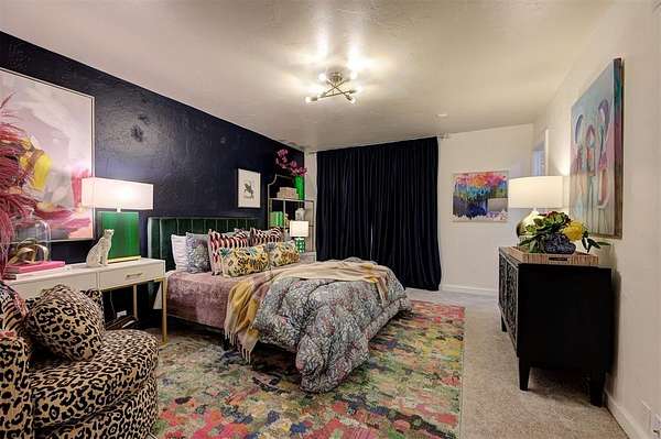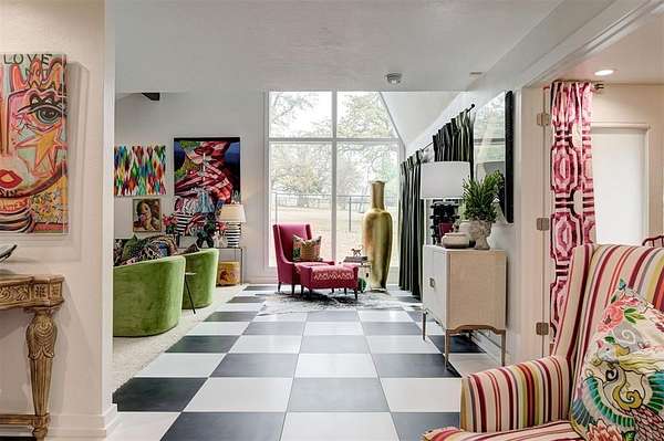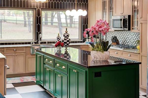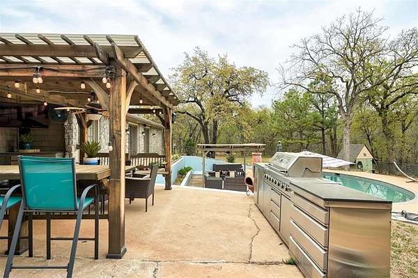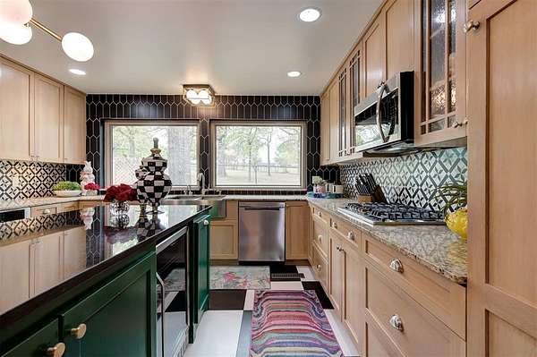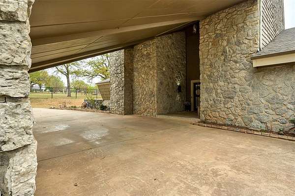 UNEXPECTEDLY UNIQUE! Peeking through the mature trees and down the driveway, catch your first glimpse of this massive MID-CENTURY MODERN STONE LODGE complete with a porte-cochere & covered front porch. Updated, well-maintained and professionally designed, this home is a dream. Through the front door & into the main house, to the left is the formal living room filled with natural light from incredible windows and a {Thalia Pink!} rock wall fireplace. Glass doors & wood floors lead you through the formal dining room {love that fun wall paper & chandelier!} right to the updated kitchen. With a long black granite center island (complete with roll-out shelves & a bev fridge!) HUGE picture windows, BRAND NEW full size double ovens & custom cabinetry, the kitchen opens to the BIG family room. The true heart of this home, the family room has tall ceilings, big windows & doors leading to the backyard living spaces & in-ground pool. An open staircase leads up to the office/bonus space-the only room not on the main level. Absolutely incredible primary suite with tall ceilings & windows, private patio access to the backyard, built-in storage, a walk-thru closet that would make SJP happy & a remodeled dream bathroom with soaking tub & a huge walk-in shower. Two secondary bedrooms, both with great closets share a Jack-n-Jill bathroom and the 3rd bedroom has a private en-suite. The laundry room has a sink & so much pantry space plus a built-in work/homework station. Attached to the main house, but with a private entrance is a delightful Secondary Suite/Apartment/Casita {perfect for multi-generational living} with full bathroom, kitchenette and dedicated HVAC & HWT. Oversized three car garage with walk-up stairs to the attic storage and in-ground storm shelter. Enjoy living in the quiet nature that comes with 2.88 wooded acres in the Sorghum Mills Estates neighborhood while still being so close to all the shopping & dining that Edmond offers.