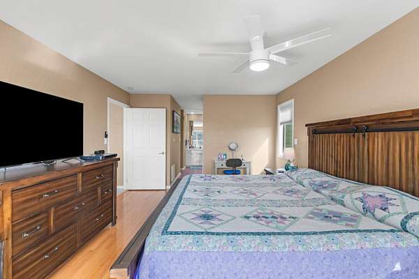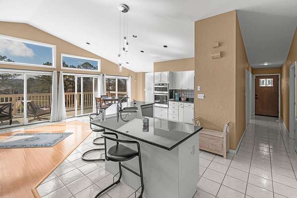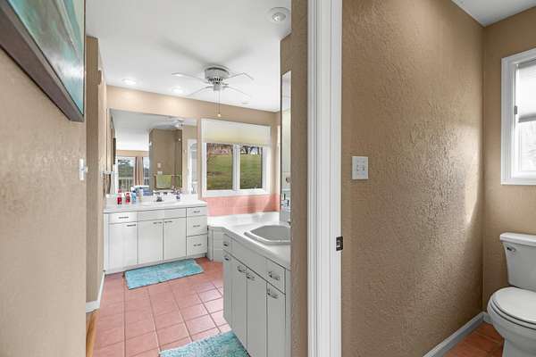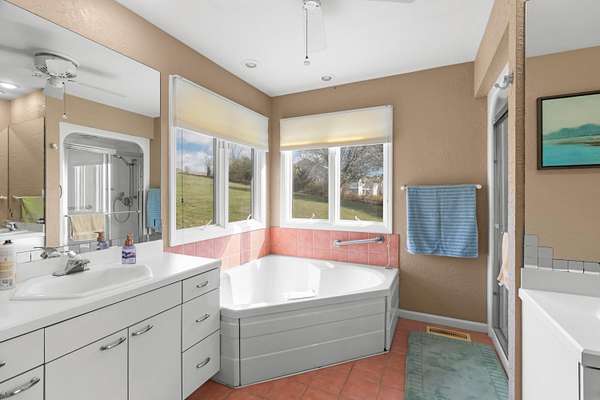 - Ceiling Fan(s), Eat-In Kitchen, High Ceilings, Kitchen Island, Pantry, Solid Surface Counters, Whirlpool Tub