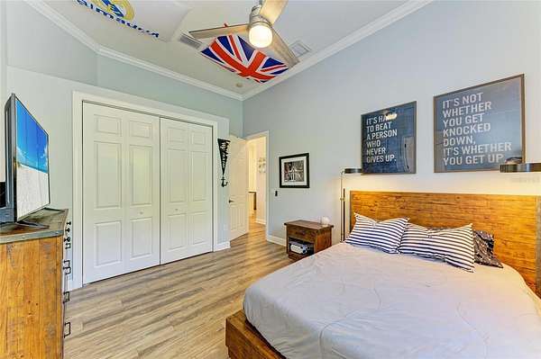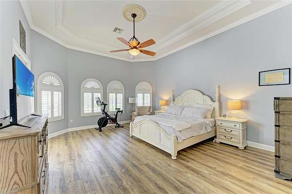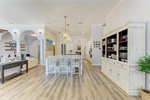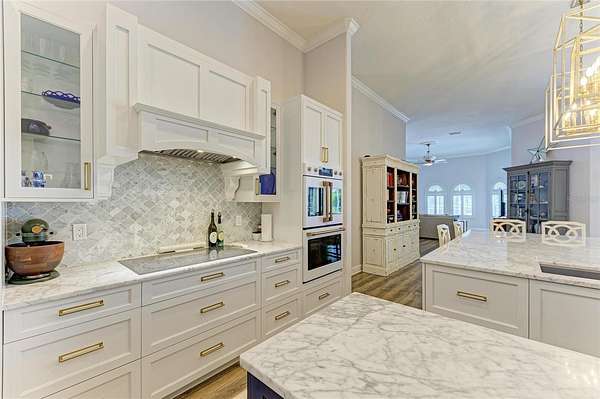 - Ceiling Fans(s), Crown Molding, Eat-In Kitchen, High Ceilings, Kitchen/Family Room Combo, Living Room/Dining Room Combo, Open Floorplan, Solid Wood Cabinets, Split Bedroom, Stone Counters, Tray Ceiling(s), Walk-In Closet(s)