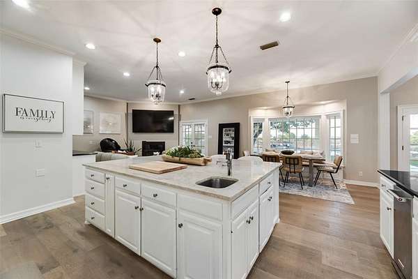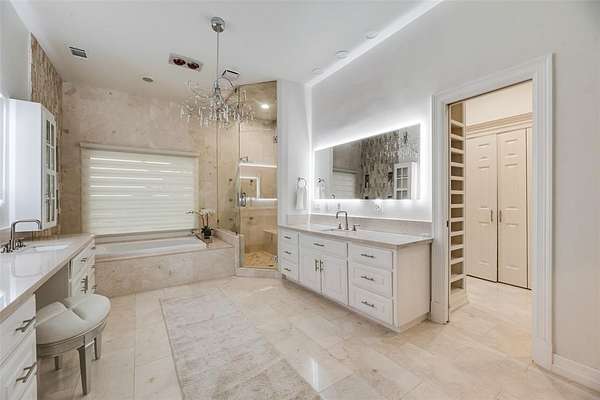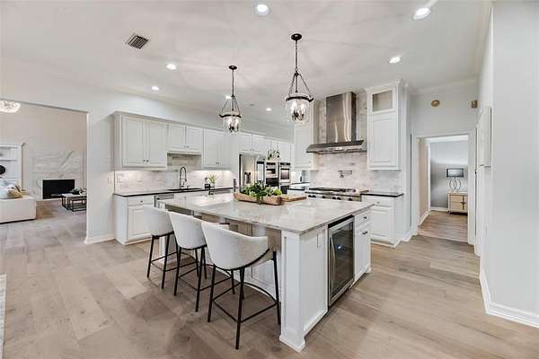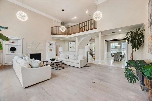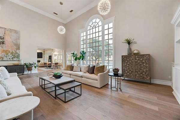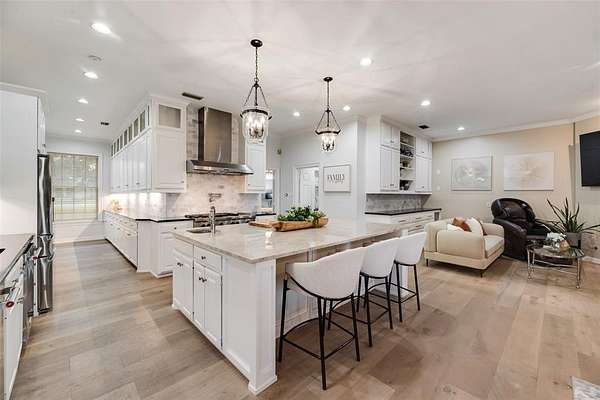 Behind the columned facade, light filled interiors balance classic architecture with modern updates: soaring ceilings, statement chandeliers, a showpiece staircase, and walls of glass framing sunset views over the pool and private pond.The kitchen was designed for entertaining with dual ovens, a massive marble island, wine fridge, and an effortless flow into multiple living and dining areas.
