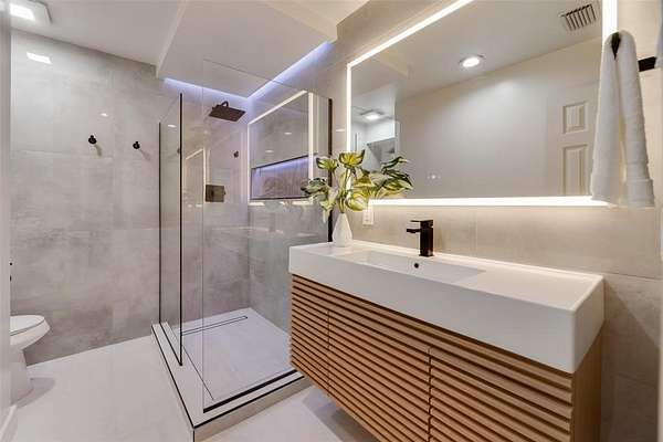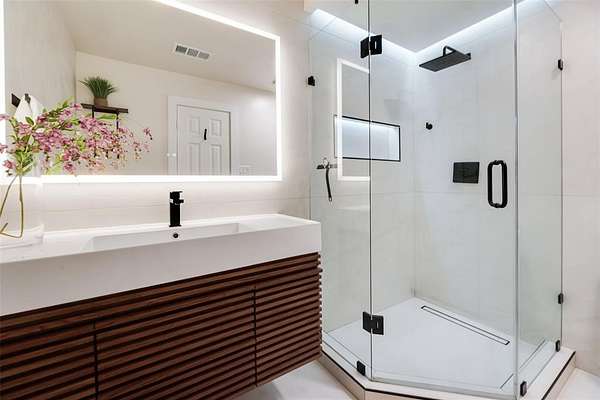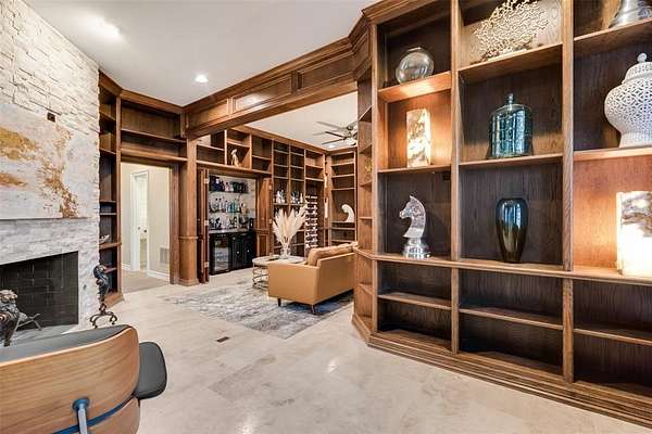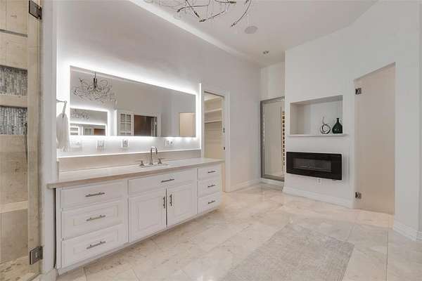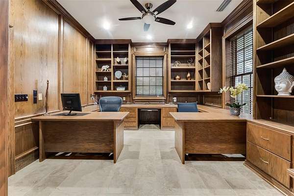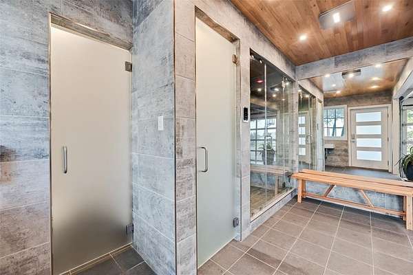 The home features 5 bedrooms, 4 full baths, and 2 half baths, including a primary suite with a spa caliber bath, oversized dual shower, modern fireplace, and a walk in closet to get lost in. Beyond the main living spaces, you'll find a dedicated home office with rich wood paneled walls, floor to ceiling built ins as well as an air conditioned home gym with a spacious steam room and meditation room.