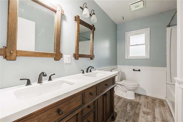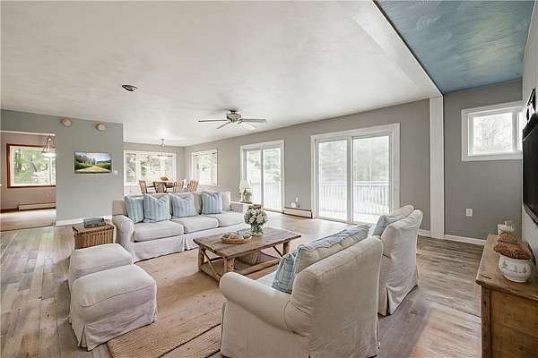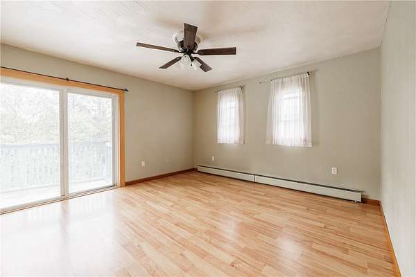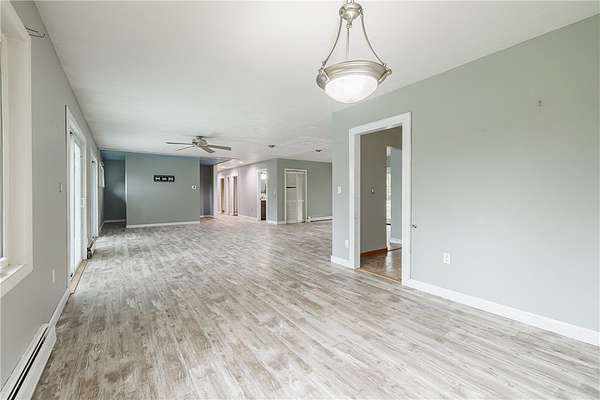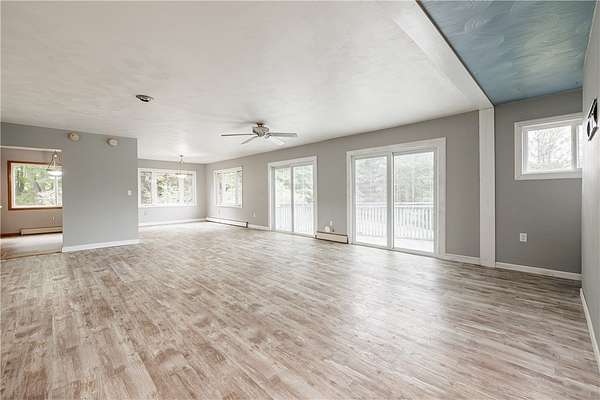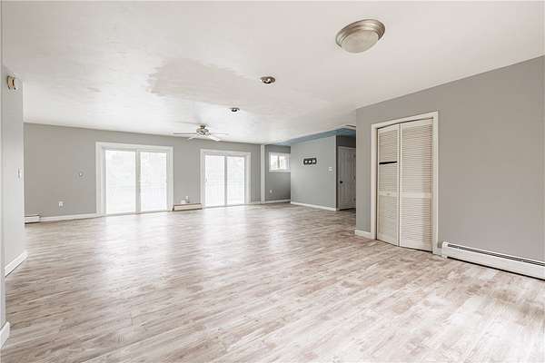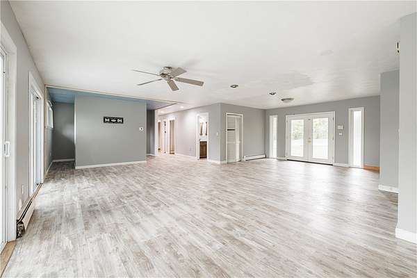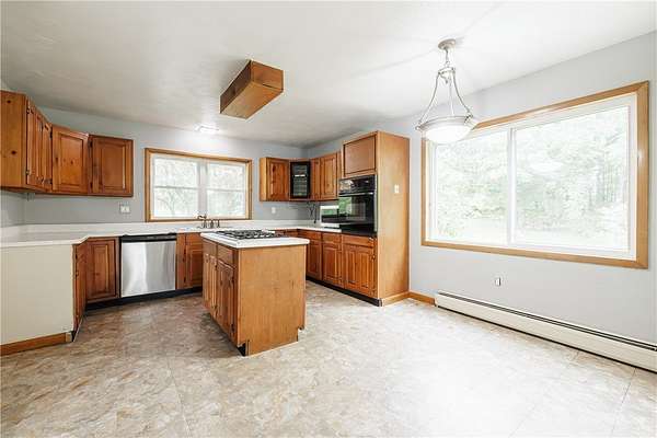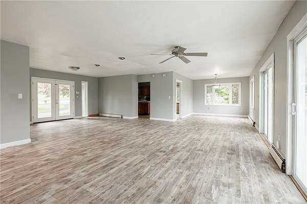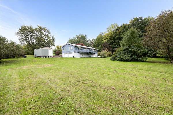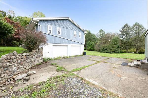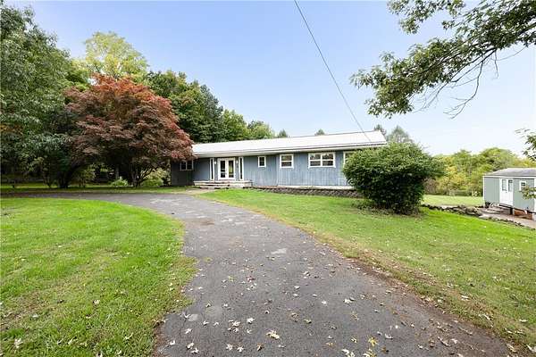 A perfectly situated 4-bedroom, 2.5-bathroom ranch on 2.25 acres located on a quiet country road. The main level features a large open foyer that leads into a spacious living and dining area, providing plenty of room for everyday use or gatherings. Double sliding glass doors in living room, with another master bedroom sliding glass door, overlook the beautiful backyard that includes apple trees, blueberry bushes, and grape vines. The yard provides plenty of space for gardening, outdoor projects, or simply enjoying the quiet surroundings. This home has a partially finished walk-out basement with another sliding glass door that leads to the backyard, as well as an additional room that could be used as a small office or studio. A large 2.5-car garage offers space for vehicles, storage, and workshop use. Several updates have been completed, including all brand new windows, a metal roof, a new hot water heater (2022), and a new boiler (2024). In addition, the sale includes enough luxury vinyl to finish all of the bedrooms, as well as enough hunter green siding to side the entire home; this gives the next owner the opportunity to continue the total overhaul of improvements that have already been started. Some photos are virtually stages.