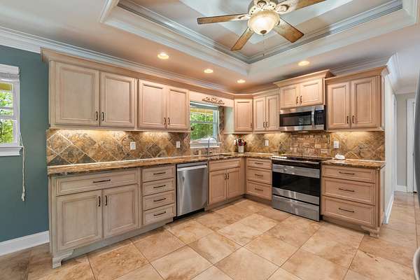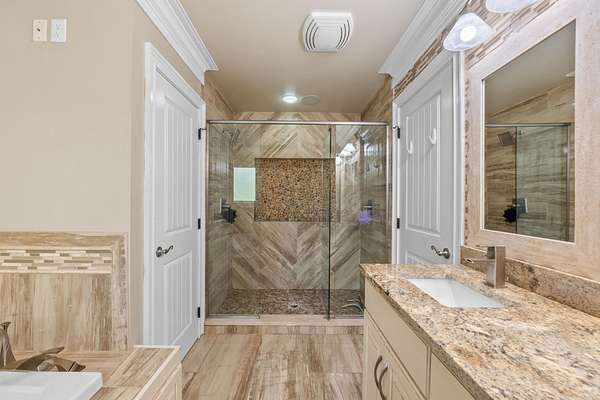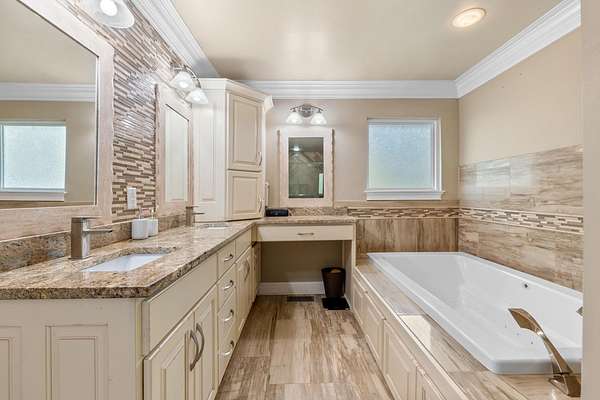 - Bookcases, Built-In Features, Ceiling Fan(s), Coffered Ceiling(s), Double Closets, Double Vanity, En Suite, Entrance Foyer, Granite Counters, High Speed Internet, Open Floorplan, Recessed Lighting, Separate Dining Room, Separate Shower, Tub/Shower Combo, Walk-In Closet(s), Whirlpool Tub