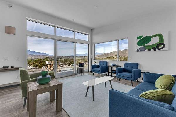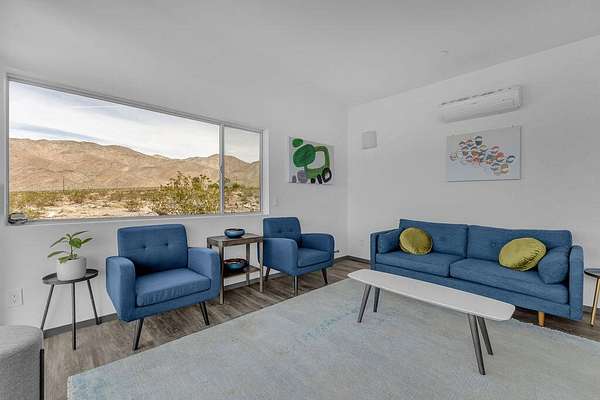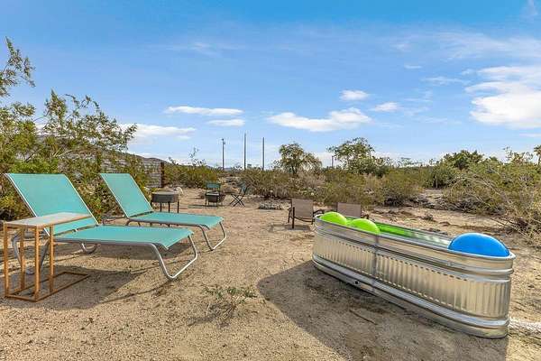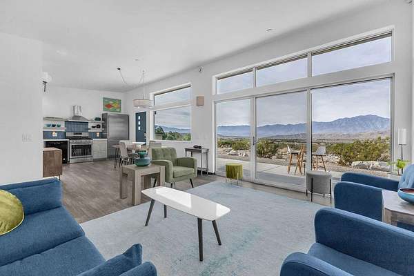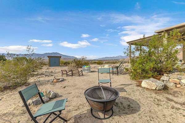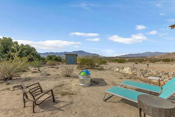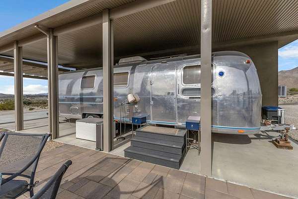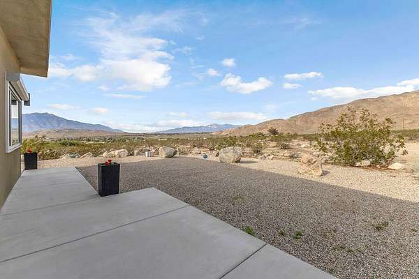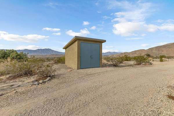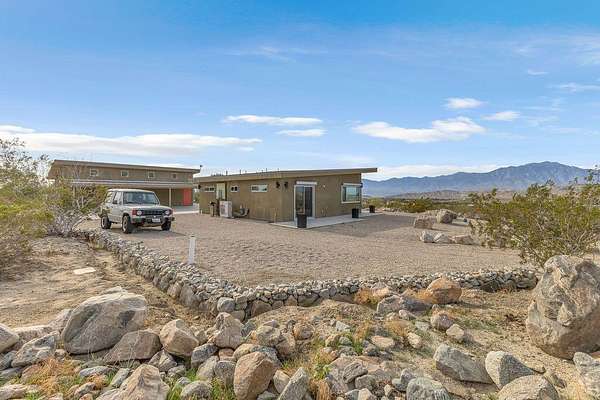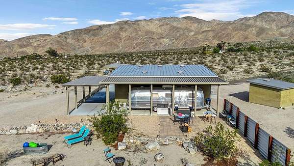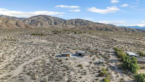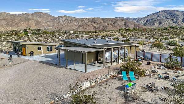 Desert Stone, Modern Desert Living with privacy and versatility in Sky Valley. This architecturally striking modern home sits on a 4.74-acre parcel with expansive desert and mountain views. The open floor plan features large windows, abundant natural light, high-end materials, and designer finishes throughout. No photo can capture the true beauty or feeling of this home, it must be seen in person to be fully appreciated. The property includes a fully enclosed oversized RV/toy garage for secure storage, a covered carport, and a plumbed Airstream ready for guest use or potential rental income (buyer to verify). Low-maintenance desert landscaping provides beauty with minimal upkeep, ideal for full-time living, a weekend retreat, or an investment opportunity. Modern utility upgrades enhance comfort and efficiency. Located in a desirable, private area with room to expand. This land is thoughtfully designed with mature landscaping and irrigation. The neighboring 4.74-acre parcel is also available for purchase, offering the opportunity to create a nearly 10-acre compound. A rare blend of modern design, open space, privacy, and flexible use.