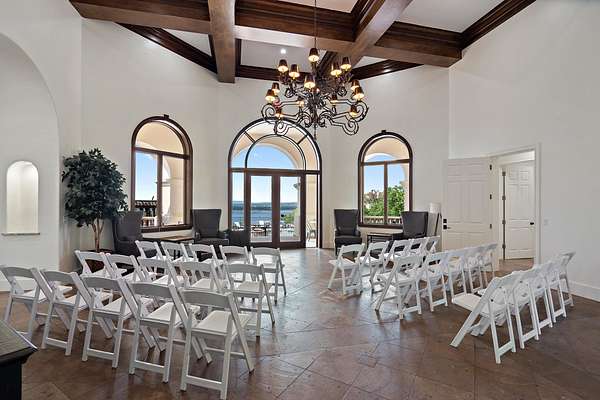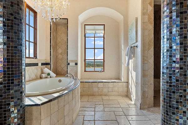 Situated on 2+ acres w/in gated Costa Bella, this waterfront estate offers year round Lake Travis enjoyment-an increasingly rare combination of acreage, privacy, & consistent water access. A private path to the observation deck & tram lead to a 2-slip boat dock in a protected deep water cove, navigable even during drought conditions. The dock accommodates a 23'+boat & jet skis w/ HydroHoist lifts, providing immediate access to open water while shielded from heavy boat traffic. Designed to maximize panoramic lake views, the home features nearly 2,000 sqft of terraces & balconies w/ windows framing the lake from the grand foyer, dining, primary suite, library & main living areas. The main residence includes 4 bedrooms, 4 full baths & 2 half baths, & an elevator for convenience and long-time accessibility. A separate casita w/ private entry & kitchenette is ideal for guests, multigenerational living or poolside entertainment. Architectural details include soaring ceilings, wood beams, stone accents, & custom millwork. The refreshed gourmet kitchen features updated countertops, backsplash, redesigned island, & Janska range, opening to cozy patios for alfresco dining. The primary suite offers terrace access, fireplace, coffee bar, spa bath, & sweeping water views. Resort-style outdoor living includes a heated pool, expansive terraces, & sunset views across the cove. Recent improvements include HVAC (2024), retaining wall/foundation enhancements (2024), pool updates, Tesla solar system w/ 3 Powerwall batteries