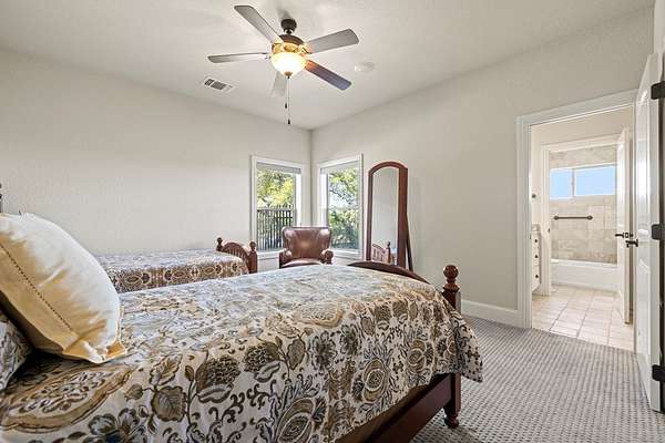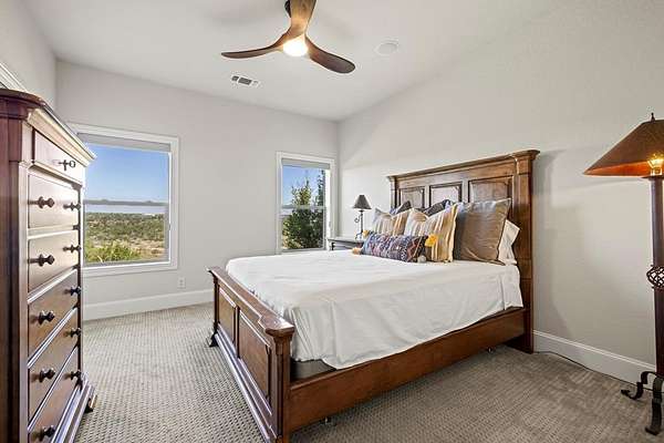 Stunning Hill Country Estate w/Breathtaking Views! Perched atop a scenic hill, this custom home offers unparalleled views & serene living within the gated Eagles Crests. Spanning 4000 + sf, the 4B/3.5B residence provides ample space & privacy on 7+ acres only 7 mi. from Fredericksburg Tx. Located at end of a quiet cul-de-sac, the home boasts eye-catching curb appeal w/custom fencing & simple yet elegant landscaped grounds. At the heart of the home is the Great Room, featuring a grand rock fireplace, exposed beams & soaring cathedral ceiling w/wood & Travertine flooring that exudes warmth & elegance. Adjacent to this inviting space is a study & formal dining area, ideal for hosting gatherings & special occasions. The chef's kitchen is equipped w/top-of-the-line Thermador stainless steel appliances, custom cabinetry, lg walk in pantry, bar/island area & ice maker. The adjoining breakfast area & den w/FP offers stunning views, making it a delightful place to start the day. The main bedroom suite is a private oasis, w/back & a secluded side patio access & outdoor shower. Includes outdoor kitchen, rock FP, exceptional views & much more! A truly exceptional place to call home.