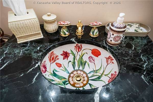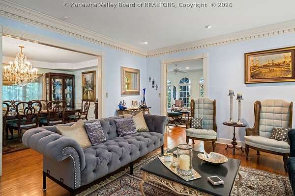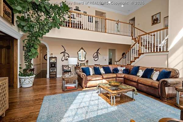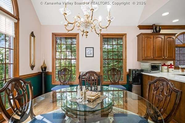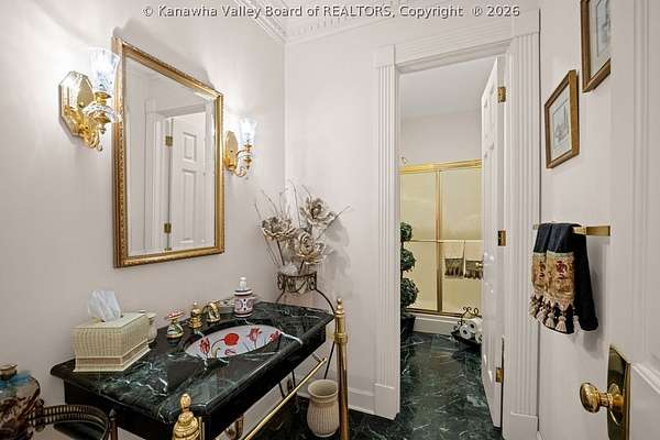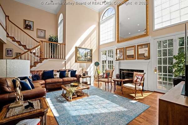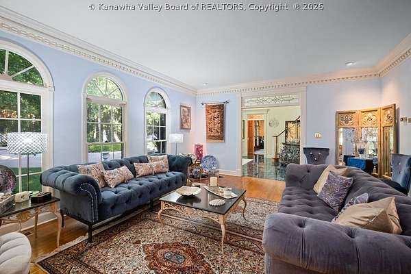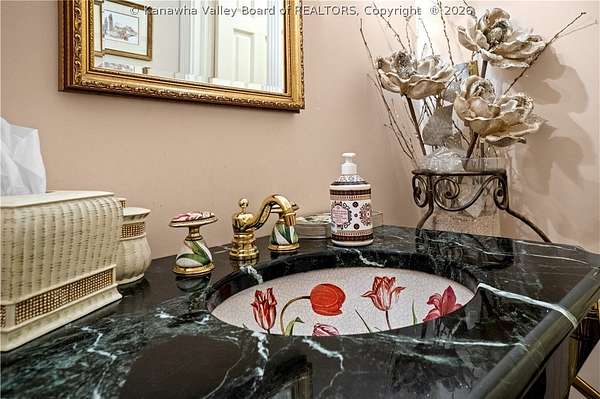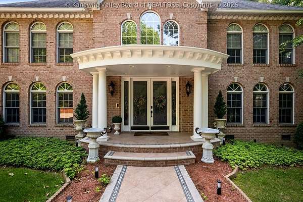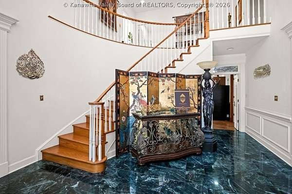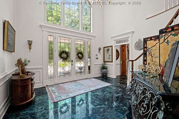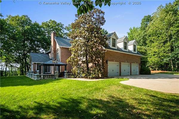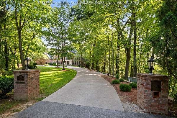 Perched atop 4 private acres in prestigious Quarry Creek, this expansive property is the highest elevation on the mountain, and offers breathtaking city and Capitol views during the fall and winter seasons. A flat, private driveway leads to refined interiors, with custom crown molding, marble floors and fireplace, granite and Corian countertops, cathedral ceilings, Palladian windows, hardwood floors, and law-enforcement-linked security system. Perfect for entertaining, it boasts a large kitchen, sunroom, media/recreation room with wet bar, and half bath on finished 3rd floor. It includes 5 bedrooms, 5.5 baths (1 on main floor, 4 on second floor, half on third floor recreation room), 3-car garage, abundant storage. Updates include second floor bathroom faucets, outdoor lamp fixtures, and a 30W liquid-cooled generator. Several rooms and outdoor lighting are smart-home ready. This Charleston landmark was featured in the Homes for the Holidays tour & WV Home Builders Association magazine.