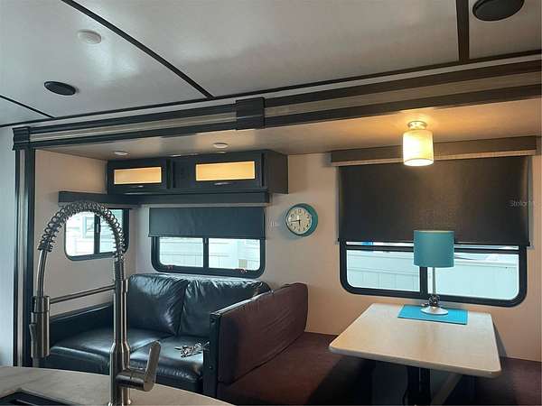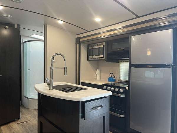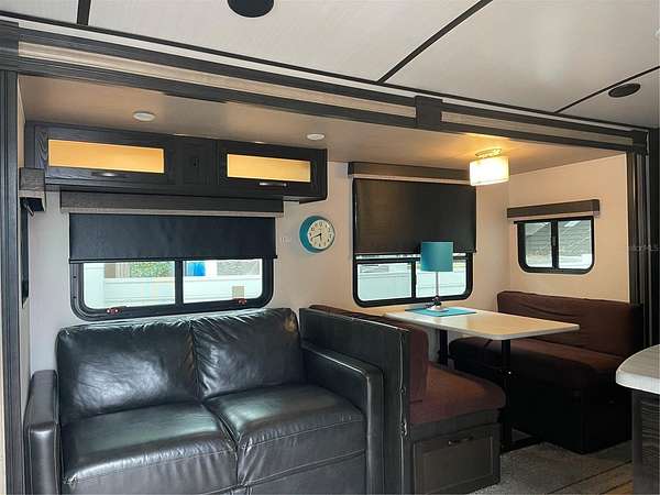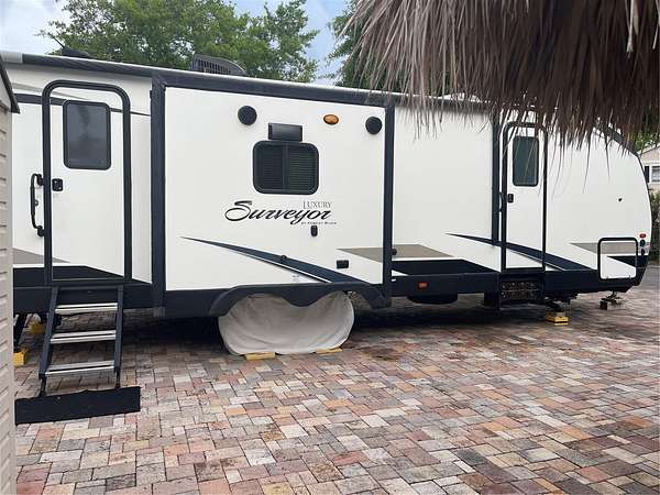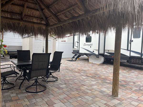 Situated minutes North of Tampa is a gated RV Park designed for people who prefer to enjoy the outdoors without clothes. Yes, this well-maintained Nudist community features a club house, laundry facility, indoor showers, and an outdoor pool. Low monthly dues include your cable, internet, water, sewer and garbage. When you purchase this RV lot you will get the deed to the land and a 2020 Forest River “Surveyor” travel trailer. The interior of the trailer looks barely used. The furniture that is in the trailer will be conveyed. The travel trailer has two exit doors in the living room and one in the bedroom. Stove has three burners, and a separate microwave. Island style sink. The unit has a TV in the living room and a fireplace. Bedroom also has a flat screen TV. The RV lot has a shed and a large Tiki Hut. The lot is primarily brick pavers with a large Bird of Paradise growing on the SW side of the lot. Less landscape to fuss over means more time for you. The Seller will consider selling financing with a ten-year mortgage. Paradise Pines is located next door to Lake Como and is also near other nudist resorts. Minutes from shopping malls, restaurants, public golf courses, 45 minutes to Gulf Beaches and about thirty to thirty-five minutes from Tampa International Airport.