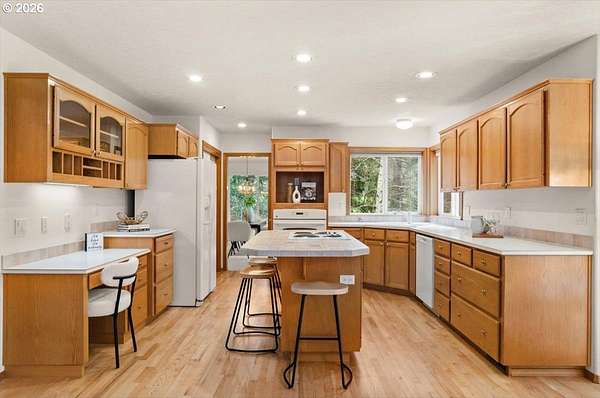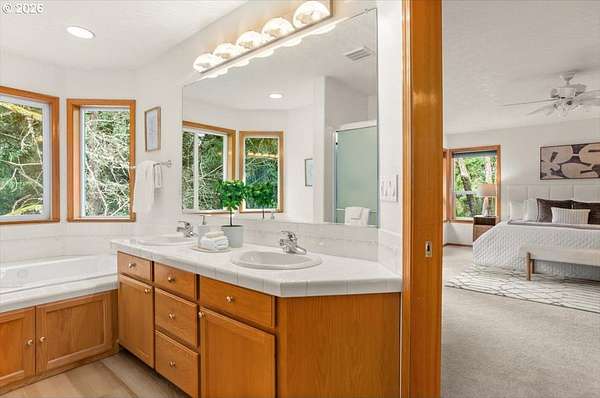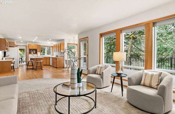 Please join us for an open house on Saturday, 3/7, from 12-2 pm, Sunday, 3/8, from 1-3 pm and Tuesday, 3/10, from 12-2 pm! Private Cooper Mountain retreat with park-like 1.69-acres of serene surroundings. On the market for the first time since it was built in 1993! Thoughtfully maintained and lightly lived in, featuring expansive rooms and territorial views. Hardwood floors, new carpet on the main and upper levels, and new LVP flooring in the primary bathroom. Connected to sewer in 2026. The spacious kitchen offers abundant cabinetry, pantry, eating bar, dining area, tech desk, new dishwasher and disposal, and access to a large deck and backyard. Original woodwork, french doors, and tray and vaulted ceilings add enduring character. Bay windows and walls of glass fill the home with natural light and showcase scenic views. Formal living room with gas fireplace and formal dining room. The family room with fireplace opens to the kitchen, creating comfortable everyday living and easy entertaining spaces. Generous primary suite with gas fireplace, walk-in closet, dual sink vanity, walk-in shower, jetted tub and private water closet. Spacious main level laundry room with workspace and built-ins. Lower level offers flexible space ideal for a home office, gym, yoga or art studio, media or game room. Oversized 3-car garage with built-ins for storage. Set back from the street offering peaceful surroundings, with frequent visits from deer, birds and other wildlife. Ideal property for pets, play, gardening and gatherings. Just minutes to everyday essentials, Cooper Mountain Nature Park, Cooper Mountain Vineyards and Jenkins Estates for events and scenic walks. Plenty of space to store an RV and a boat with ample additional parking. Refrigerator, washer and dryer included. Move-in ready! A rare opportunity and a must see! Schedule a tour today!