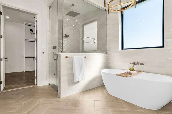 The chef-inspired kitchen is equipped with high-end panel-ready appliances, custom cabinetry, and a generous island, while a walk-in pantry keeps the space organized and clutter-free. The luxurious primary suite features a spa-like bathroom with quartz countertops, a soaking tub, a separate shower, a coffee bar, and a steam sauna with aroma and chromotherapy for the ultimate in relaxation. A large walk-in closet with custom built-ins offers plenty of storage.