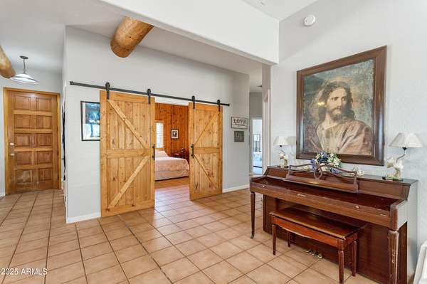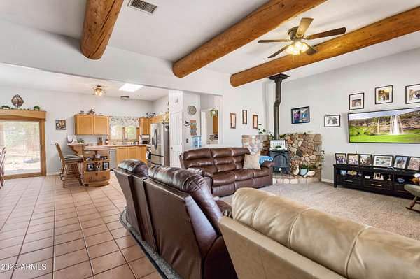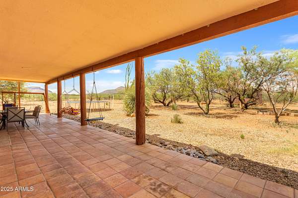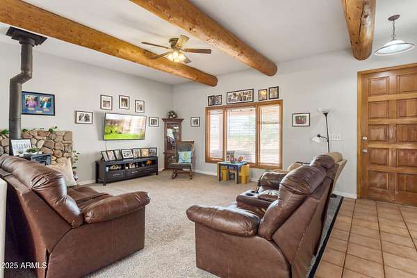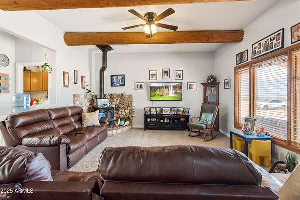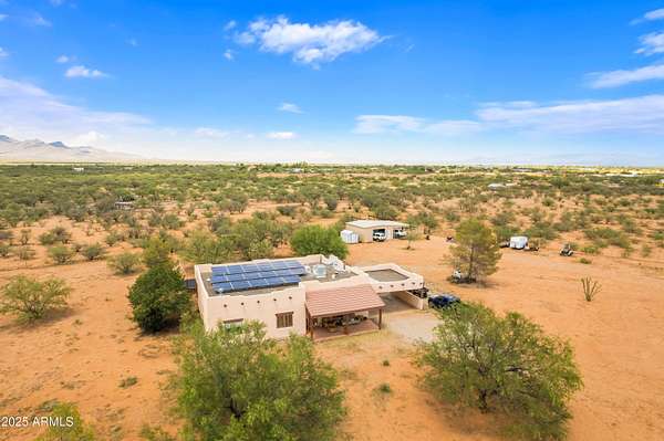 Experience the charm of Santa Fe living in this meticulously maintained 1889 square foot Sante fe style home, nestled on over 11+ acres with breathtaking panoramic views of twinkling city lights and the star studded sky. This beautifully maintained home offers 3 bedrooms and 2.5 bathrooms, Tesla brand solar panels are owned & custom Pella windows, tankless hot water heater all to maximize energy efficiency. . Imagine cozy wintry evenings by the wood burning stove, or soaking in the serene tranquility and the captivating night sky. The design embraces natural light and an open, airy living space. There is also a lift in the detached garage to work on automotive hobbies and a horse corral on the property.