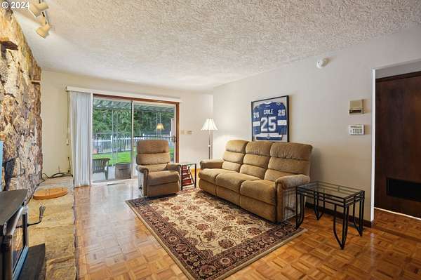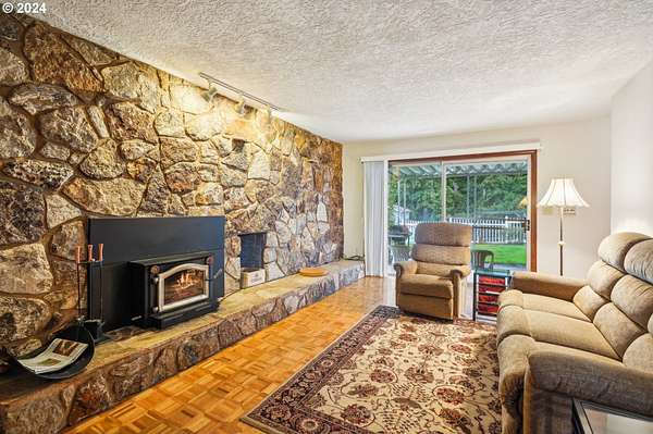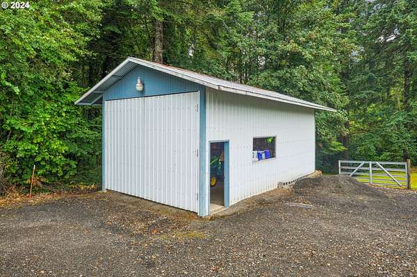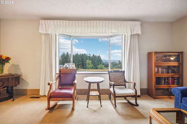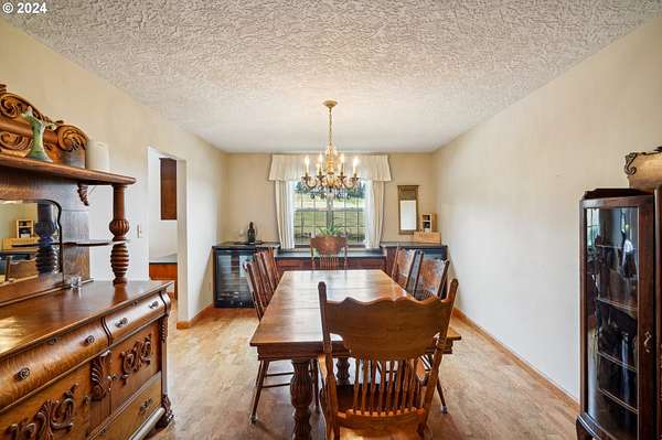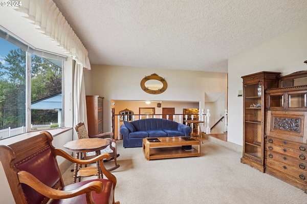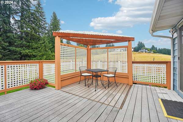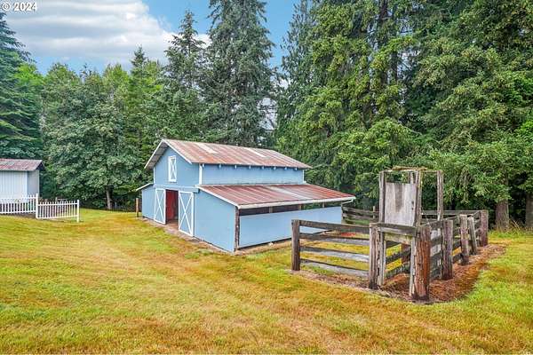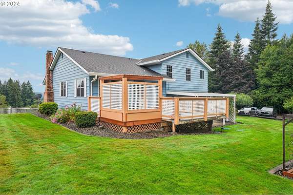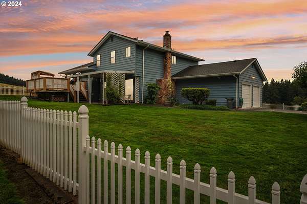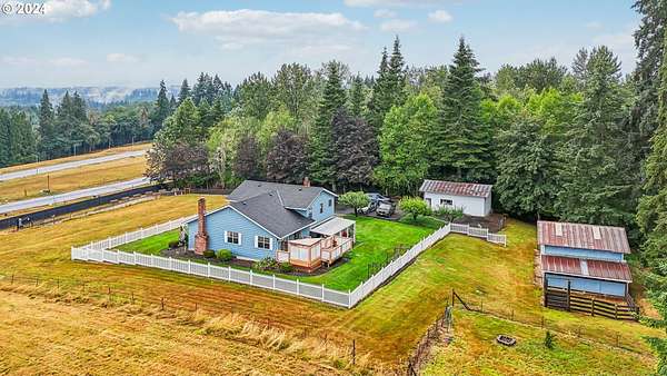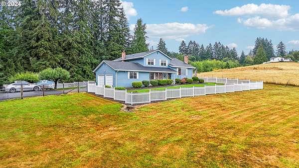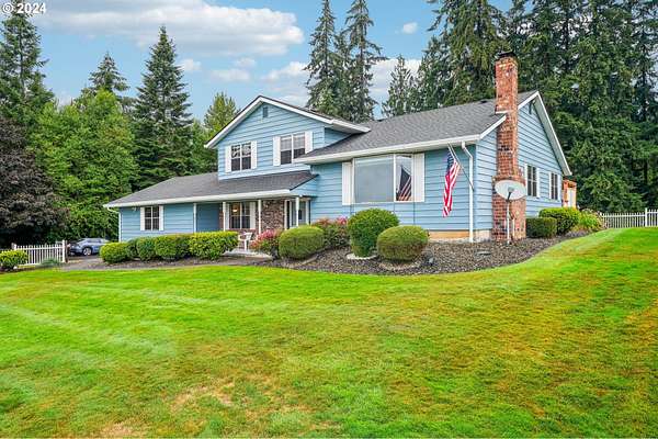 Welcoming covered front porch with Mt Hood view, entry with storm door and sidelite. Step down into formal living room which overlooks the front entry, stone surround wood burning fireplace with mantle and hearth and bay window. Formal dining room features a built-in buffet with granite countertop and two wine fridges one on either side with convenient access to kitchen. Family room with stone surround wood burning fireplace insert with hearth and slider access to covered patio. Stainless kitchen, granite counters, abundant walnut finish cabinetry including lazy susan, pantry, garden window and recessed lighting. Separate kitchen dining with slider access to deck, adjacent desk area with built-ins and granite countertop. Primary en-suite on third level with bench seat containing storage space and laundry chute, walk-in closet with organizer, single sink granite vanity, shower, built-ins. Second bedroom or den/office with closet on main level. Third and fourth bedrooms with closet on upper level. Laundry room on main with built-ins, utility sink. Powder room on main with single sink Corian vanity. Full bath on upper level with single sink Corian vanity, combo soak tub and shower. Unfinished basement with abundant storage space, shelving including wine shelving. Additional interior features: cork and parquet hardwood flooring, tile and carpet, whole house central vacuum system, fiber optic internet, New heat pump. Exterior: gated entry, paved driveway, covered front porch, covered back patio, Trex deck with Mt Hood view, fully landscaped with sprinklers front and back and to garden area, apple, pear, and plum trees. New roof. 3 acres. Mt Hood views. 2-car garage with opener, shelving. Shop 17ft 6in x 31ft includes 12ft x 10ft door, electricity, workbench, shelving. Barn 24ft 8in x 44ft, 2 dry storage areas, man doors, electricity and lighting. Mortgage savings may be available for buyers of this listing. Mortgage savings may be available for buyers of this listing.