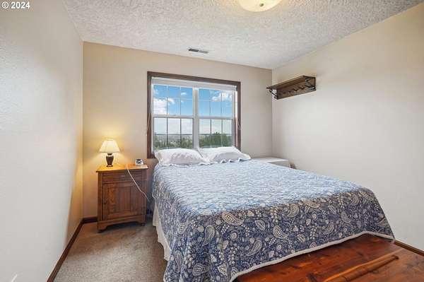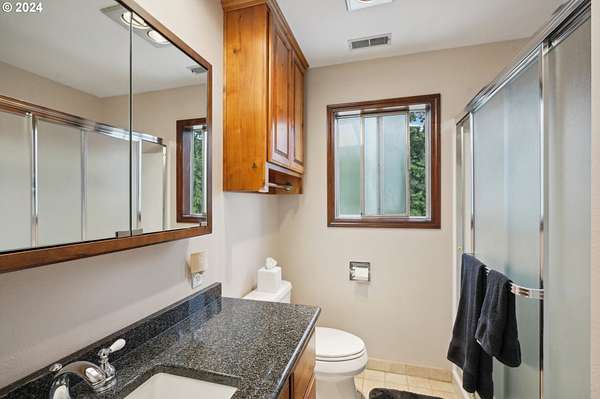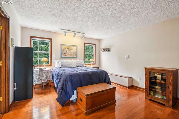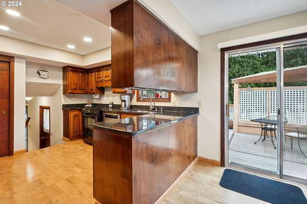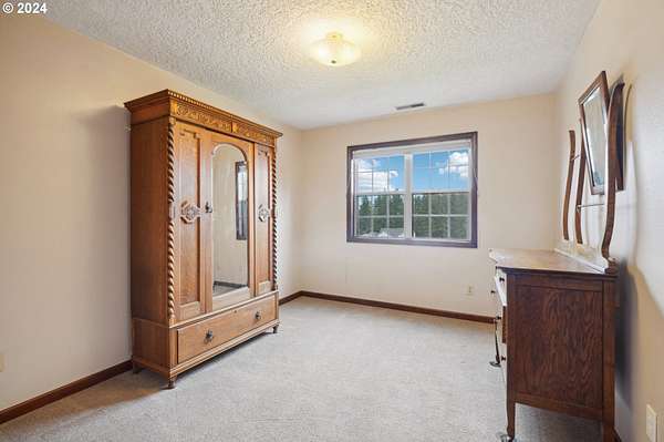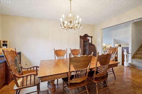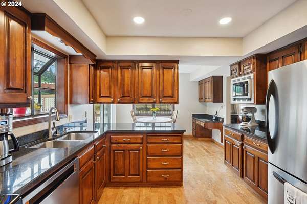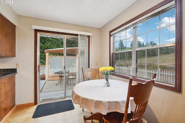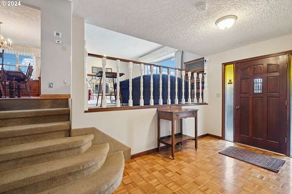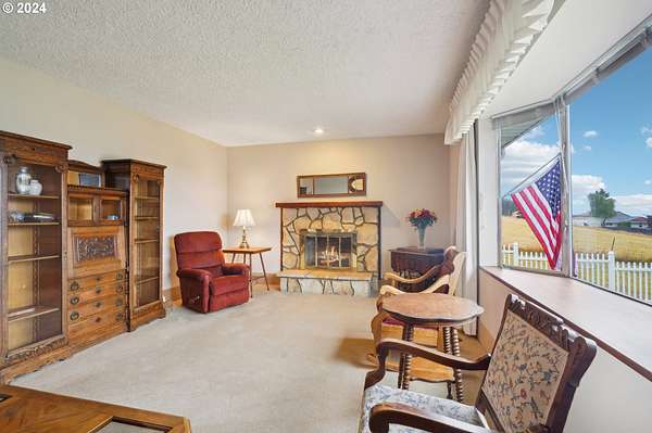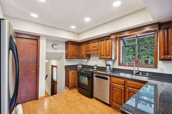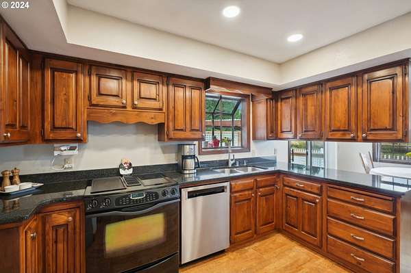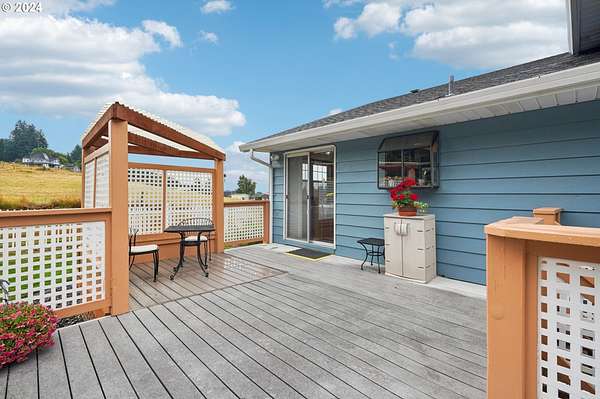 Welcoming covered front porch with Mt Hood view, entry with storm door and sidelite. Step down into formal living room which overlooks the front entry, stone surround wood burning fireplace with mantle and hearth and bay window. Formal dining room features a built-in buffet with granite countertop and two wine fridges one on either side with convenient access to kitchen. Family room with stone surround wood burning fireplace insert with hearth and slider access to covered patio. Stainless kitchen, granite counters, abundant walnut finish cabinetry including lazy susan, pantry, garden window and recessed lighting. Separate kitchen dining with slider access to deck, adjacent desk area with built-ins and granite countertop. Primary en-suite on third level with bench seat containing storage space and laundry chute, walk-in closet with organizer, single sink granite vanity, shower, built-ins. Second bedroom or den/office with closet on main level. Third and fourth bedrooms with closet on upper level. Laundry room on main with built-ins, utility sink. Powder room on main with single sink Corian vanity. Full bath on upper level with single sink Corian vanity, combo soak tub and shower. Unfinished basement with abundant storage space, shelving including wine shelving. Additional interior features: cork and parquet hardwood flooring, tile and carpet, whole house central vacuum system, fiber optic internet, New heat pump. Exterior: gated entry, paved driveway, covered front porch, covered back patio, Trex deck with Mt Hood view, fully landscaped with sprinklers front and back and to garden area, apple, pear, and plum trees. New roof. 3 acres. Mt Hood views. 2-car garage with opener, shelving. Shop 17ft 6in x 31ft includes 12ft x 10ft door, electricity, workbench, shelving. Barn 24ft 8in x 44ft, 2 dry storage areas, man doors, electricity and lighting. Mortgage savings may be available for buyers of this listing. Mortgage savings may be available for buyers of this listing.