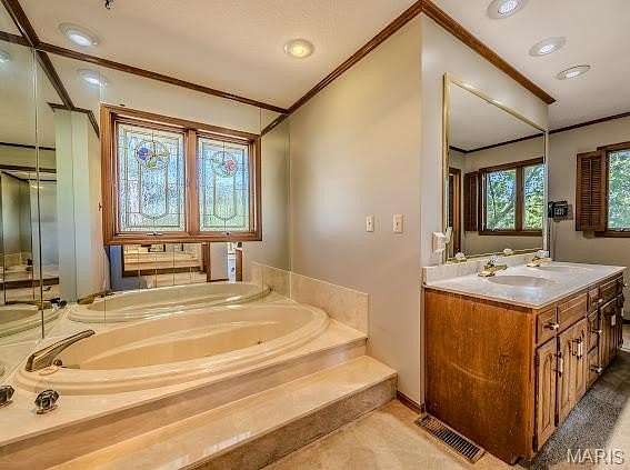 - Breakfast Room, Ceiling Fan(s), Custom Cabinetry, Dining/Living Room Combo, Double Vanity, Entrance Foyer, Kitchen/Dining Room Combo, Pantry, Separate Dining, Separate Shower, Soaking Tub, Special Millwork, Walk-In Closet(s), Wet Bar, Workshop/Hobby Area
