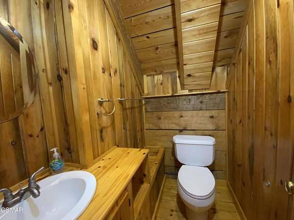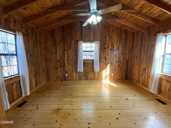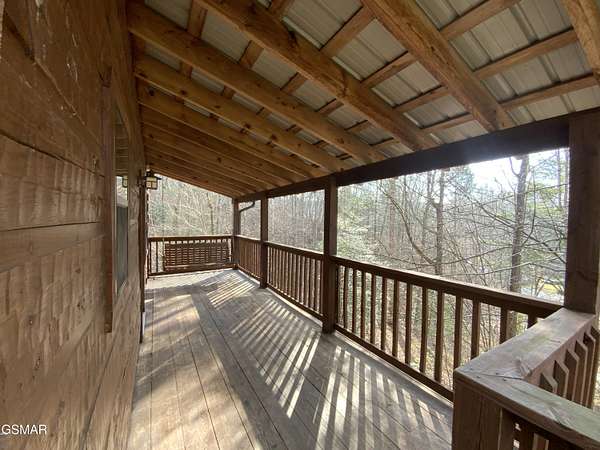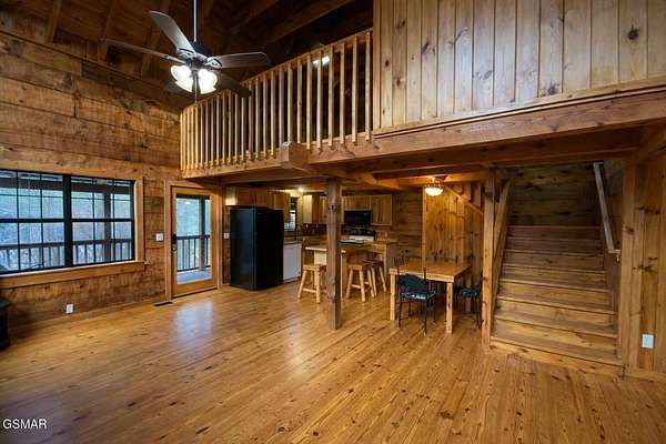 Location, Location! Beautiful Rustic Hand-hewn Log Cabin the Woods ideally located just 10 minutes from Gatlinburg, Pigeon Forge, and Sevierville. This charming mountain retreat offers over 1,700 sq. ft. of living space with 2 bedrooms, 2.5 baths, a large loft area, and a second-level game room, providing plenty of room for entertaining and overnight guests. The open-concept main level features a stunning great room with cathedral ceilings, exposed beams, hand-hewn logs, and southern yellow pine hardwood flooring throughout. A gorgeous stone gas fireplace serves as the focal point of the living area, creating a warm and inviting mountain atmosphere. The eat-in kitchen includes beautiful pine/maple cabinetry, ample counter space, and a large island with seating, perfect for gatherings. The spacious loft offers flexible use as additional sleeping space, a great room, or office area. Enjoy outdoor living with two levels of covered decking, overlooking a very private 1.89-acre level to gently rolling wooded cul-de-sac lot. Additional features include a large storage building/workshop, in-house vacuum system, and an encapsulated crawl space for added efficiency and peace of mind. This property is ideal as a primary residence, second home, or investment opportunity, offering privacy, rustic charm, and convenient access to all the attractions of the Smoky Mountains. Possible Owner Financing. Come make this your home in the Smoky Mountains!!!