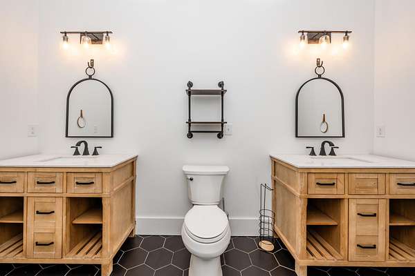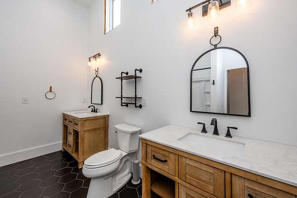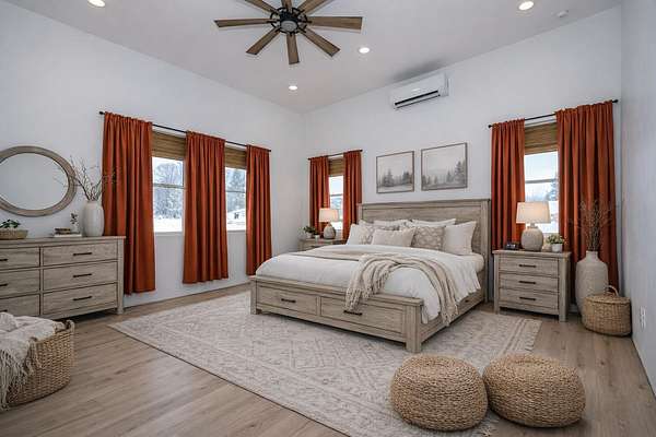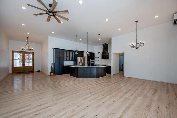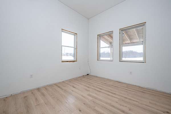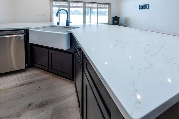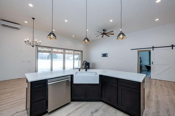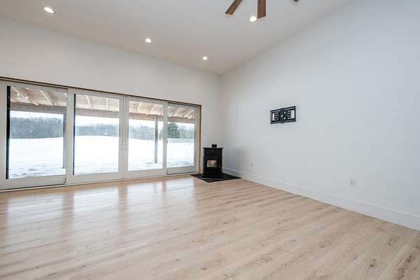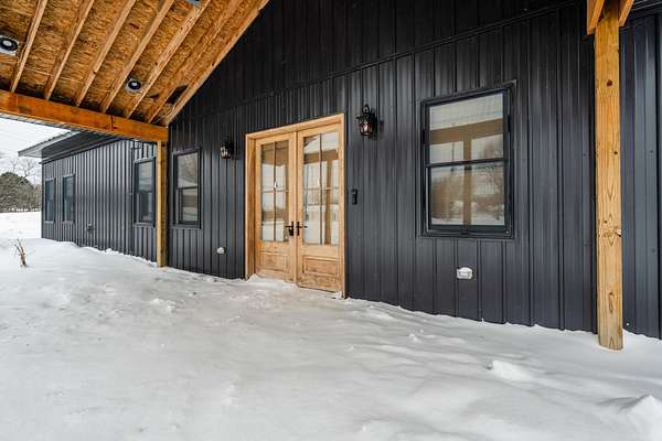 This stunning modern barndominium offers 2,400 square feet of true one-level living with 4 bedrooms, 2.5 bathrooms, and the kind of wide-open design that makes every space feel bigger, brighter, and better. From the moment you step into the huge walk-in foyer under a striking black chandelier, you'll notice all the natural light, you won't want to turn on any lights! With 12-foot vaulted ceilings, crisp white walls, and an 8-foot tall by 16-foot wide sliding door in the living room, the outdoors pours in and the whole home feels airy, calm, and effortlessly modern. The kitchen is the true heart of the home ' oversized, open, and designed to gather in your loved ones. Outfitted with beautiful black cabinetry and sleek white quartz countertops, it flows seamlessly into the dining and living spaces for easy entertaining and everyday living. The primary suite feels like a private retreat. A massive bedroom leads into an ensuite bath, featuring an easily 2 person steam shower, separate soaking tub, dual sinks, private water closet, and a closet so large it's almost a room of its own. Step outside and it only gets better. Two huge covered porches invite you to slow down, sip coffee, host friends, or watch the sunset over your five rolling acres. And then there's the bonus most homes can't compete with... Designed with year-round comfort in mind, the home is equipped throughout with efficient mini-split systems, radiant in-floor heat infrastructure, and the inviting warmth of the pellet stove, offering multiple options for personalized climate control. Also-- a 43' x 34' detached workshop, ideal for hobbies, toys, projects, plus your very own dirt bike track right on the property. Modern. Bright. Open. Functional. Fun.