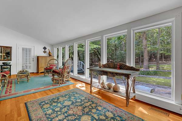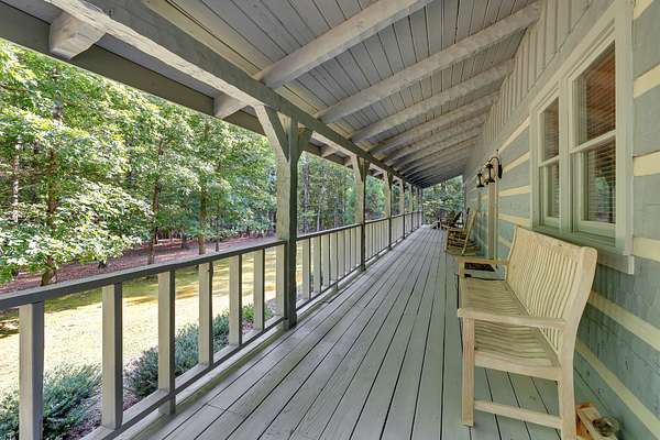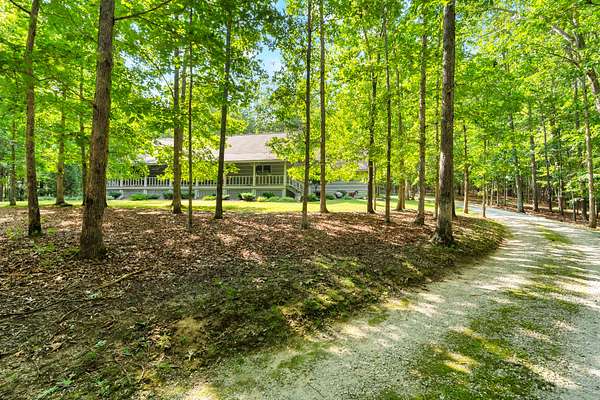 Enjoy the serene natural surroundings from the covered front porch or the covered back patio, where the sounds of songbirds create a peaceful atmosphere. The property's landscaping is meticulously maintained, complementing the wooded setting.